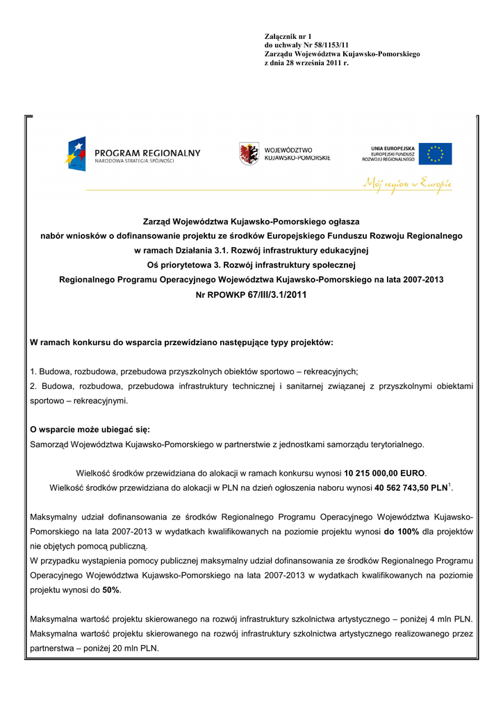 Załącznik nr 1 do uchwały Nr 58/1153/11 Zarządu Województwa Kujawsko-Pomorskiego z dnia 28 września 2011 r. Zarząd Województwa Kujawsko-Pomorskiego ogłasza nabór wniosków o dofinansowanie projektu ze środków Europejskiego Funduszu Rozwoju Regionalnego w ramach Działania 3.1. Rozwój infrastruktury edukacyjnej Oś priorytetowa 3. Rozwój infrastruktury społecznej Regionalnego Programu Operacyjnego Województwa Kujawsko-Pomorskiego na lata 2007-2013 Nr RPOWKP 67/III/3.1/2011 W ramach konkursu do wsparcia przewidziano następujące typy projektów: 1. Budowa, rozbudowa, przebudowa przyszkolnych obiektów sportowo – rekreacyjnych; 2. Budowa, rozbudowa, przebudowa infrastruktury technicznej i sanitarnej związanej z przyszkolnymi obiektami sportowo – rekreacyjnymi. O wsparcie moŜe ubiegać się: Samorząd Województwa Kujawsko-Pomorskiego w partnerstwie z jednostkami samorządu terytorialnego. Wielkość środków przewidziana do alokacji w ramach konkursu wynosi 10 215 000,00 EURO. 1 Wielkość środków przewidziana do alokacji w PLN na dzień ogłoszenia naboru wynosi 40 562 743,50 PLN . Maksymalny udział dofinansowania ze środków Regionalnego Programu Operacyjnego Województwa KujawskoPomorskiego na lata 2007-2013 w wydatkach kwalifikowanych na poziomie projektu wynosi do 100% dla projektów nie objętych pomocą publiczną. W przypadku wystąpienia pomocy publicznej maksymalny udział dofinansowania ze środków Regionalnego Programu Operacyjnego Województwa Kujawsko-Pomorskiego na lata 2007-2013 w wydatkach kwalifikowanych na poziomie projektu wynosi do 50%. Maksymalna wartość projektu skierowanego na rozwój infrastruktury szkolnictwa artystycznego – poniŜej 4 mln PLN. Maksymalna wartość projektu skierowanego na rozwój infrastruktury szkolnictwa artystycznego realizowanego przez partnerstwa – poniŜej 20 mln PLN. Załącznik nr 1 do uchwały Nr 58/1153/11 Zarządu Województwa Kujawsko-Pomorskiego z dnia 28 września 2011 r. Konkurs ma charakter otwarty bez preselekcji, o którym mowa w § 5 Trybu składania wniosków o dofinansowanie projektu w ramach Regionalnego Programu Operacyjnego Województwa Kujawsko-Pomorskiego na lata 2007-2013 dla Osi priorytetowej 3. Rozwój infrastruktury społecznej, Działania 3.1. Rozwój infrastruktury edukacyjnej. W przypadku wystąpienia pomocy publicznej wsparcie będzie udzielane w oparciu o zasady określone w rozporządzeniu Ministra Rozwoju Regionalnego z dnia 15 grudnia 2010r. w sprawie udzielania regionalnej pomocy inwestycyjnej w ramach regionalnych programów operacyjnych (Dz. U. Nr 239, poz. 1599). Nabór będzie prowadzony od dnia 9 maja 2011 r. w sposób ciągły do wyczerpania 130% alokacji środków przewidzianych w ramach konkursu lub do zamknięcia konkursu uzasadnionego odpowiednią decyzją Instytucji Zarządzającej RPO, od poniedziałku do piątku w godzinach pracy urzędu, tj. w poniedziałki, środy i czwartki od 7.30 do 15.30, we wtorki od 7.30 do 17.00, w piątki od 7.30 do 14.00. Miejscem składania wniosków o dofinansowanie projektu jest Kancelaria Ogólna w Urzędzie Marszałkowskim Województwa Kujawsko-Pomorskiego w Toruniu, ul. Marii Skłodowskiej - Curie (I piętro – pokój 112a) lub Pl. Teatralny 2 (I piętro – pokój 261). Termin rozstrzygnięcia konkursu przewiduje się na styczeń 2012 roku. Wzór wniosku o dofinansowanie projektu, wzór umowy o dofinansowanie projektu oraz Tryb składania wniosków o dofinansowanie projektu w ramach Regionalnego Programu Operacyjnego Województwa Kujawsko-Pomorskiego na lata 2007-2013 dla Osi priorytetowej 3. Rozwój infrastruktury społecznej, Działania 3.1. Rozwój infrastruktury edukacyjnej, który określa zasady i formę składania wniosków zostały zamieszczone na stronie internetowej www.mojregion.eu. Instytucja Zarządzająca RPO dokona oceny i wyboru projektów w oparciu, o kryteria zawarte w załączniku nr V do Szczegółowego opisu osi priorytetowych Regionalnego Programu Operacyjnego Województwa KujawskoPomorskiego na lata 2007–2013, który dostępny jest na stronie internetowej www.mojregion.eu. Informacja na temat projektów objętych wsparciem udostępniona będzie opinii publicznej na stronie internetowej www.mojregion.eu, jak równieŜ kaŜdy wnioskodawca zostanie pisemnie powiadomiony o wyniku rozpatrzenia jego wniosku. Wnioskodawca ma prawo do złoŜenia wniosku o ponowne rozpatrzenie wniosku, o którym mowa w § 15 ust. 1 Trybu składania wniosku o dofinansowanie projektów w ramach Regionalnego Programu Operacyjnego Województwa Kujawsko-Pomorskiego na lata 2007-2013 dla Osi priorytetowej 3. Rozwój infrastruktury społecznej, Działania 3.1. Rozwój infrastruktury edukacyjnej. Szczegółowe informacje, wzory dokumentów oraz wytyczne dotyczące naboru i oceny wniosków dostępne są na Załącznik nr 1 do uchwały Nr 58/1153/11 Zarządu Województwa Kujawsko-Pomorskiego z dnia 28 września 2011 r. stronie internetowej Urzędu Marszałkowskiego Województwa Kujawsko-Pomorskiego w Toruniu www.mojregion.eu, w Głównym Punkcie Informacyjnym – tel. (56) 62 18 341, (56) 62 18 409 oraz w Punkcie Konsultacyjnym – [email protected] tel. (56) 656 10 50, 656 11 00, a takŜe w Lokalnych Punktach Informacyjnych. Informacja o spotkaniach informacyjno-szkoleniowych dotyczących naboru i oceny wniosków o dofinansowanie projektu dostępna będzie na stronie internetowej www.mojregion.eu. Adresy Lokalnych Punktów Informacyjnych: Przedstawicielstwo Urzędu Marszałkowskiego w Bydgoszczy ul. Jagiellońska 9 85-950 Bydgoszcz tel. (52) 321 40 59 [email protected] Przedstawicielstwo Urzędu Marszałkowskiego w Grudziądzu ul. Sienkiewicza 22 86-300 Grudziądz tel. (56) 462 45 15 [email protected] Przedstawicielstwo Urzędu Marszałkowskiego we Włocławku ul. Bechiego 2 87-800 Włocławek tel. (054) 235 67 12, (054) 235 67 21 [email protected] Przedstawicielstwo Urzędu Marszałkowskiego w Inowrocławiu ul. Roosevelta 36/38 88-100 