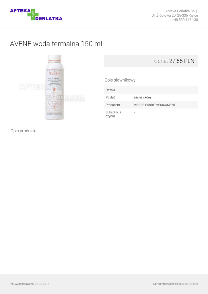 Apteka Derlatka Sp. j. Ul. Źródłowa 20, 25-335 Kielce +48 530 145 138 AVENE woda termalna 150 ml Cena: 27,55 PLN Opis słownikowy Dawka - Postać aer.na skórę Producent PIERRE FABRE MEDICAMENT Substancja czynna - Opis produktu Plik wygenerowano: 08-03-2017 Powered by TCPDF (www.tcpdf.org) Oprogramowanie sklepu: AptusShop