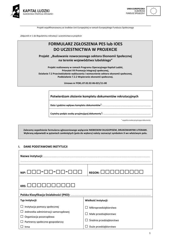 Projekt współfinansowany ze środków Unii Europejskiej w ramach Europejskiego Funduszu Społecznego Załącznik nr 1 do Regulaminu rekrutacji i uczestnictwa w projekcie FORMULARZ ZGŁOSZENIA PES lub IOES DO UCZESTNICTWA W PROJEKCIE Projekt „Budowanie nowoczesnego sektora Ekonomii Społecznej na terenie województwa lubelskiego” Projekt realizowany w ramach Programu Operacyjnego Kapitał Ludzki, Priorytet VII Promocja integracji społecznej, Działanie 7.2 Przeciwdziałanie wykluczeniu i wzmocnienie sektora ekonomii społecznej, Poddziałanie 7.2.2 Wspieranie ekonomii społecznej. Umowa nr POKL.07.02.02-06-021/11-00 Potwierdzam złożenie kompletu dokumentów rekrutacyjnych 1 Data i godzina wpływu kompletu dokumentów : ………………………………………………………………………......... 1 Czytelny podpis osoby przyjmującej dokumenty : …………………………………………………………………………….. 1 wypełnia osoba przyjmująca dokumenty Zalecamy wypełnienie formularza zgłoszeniowego wyłącznie NIEBIESKIM DŁUGOPISEM, DRUKOWANYMI LITERAMI. Wybraną odpowiedź w pytaniach zamkniętych (pola do wyboru) należy zaznaczyć symbolem X we właściwym polu. I. DANE PODSTAWOWE INSTYTUCJI Nazwa instytucji: ………………………………………………………………………………………………………………………………………………………………………………… …………………………………………………………………………………………………………………………………………………………………………………………………………………………. NIP: □□□-□□-□□-□□□ KRS: □□□□□□□□□□ REGON: □□□□□□□□□ Polska Klasyfikacja Działalności (PKD): ………………………………………………………………..………………………………………………………………….. Typ instytucji: Wielkość instytucji: □ Instytucja pomocy społecznej □ Jednostka administracji samorządowej □ Organizacja pozarządowa □ Partnerzy społeczno-gospodarczy □ Inna □ Mikroprzedsiębiorstwo □ Małe przedsiębiorstwo □ Średnie przedsiębiorstwo □ Duże przedsiębiorstwo 1 Projekt współfinansowany ze środków Unii Europejskiej w ramach Europejskiego Funduszu Społecznego Status instytucji: □ Podmiot ekonomii społecznej □ Fundacja □ Spółdzielnia socjalna □ Spółdzielnia pracy □ Spółdzielnia inwalidów □ Stowarzyszenie □ Centrum Integracji Społecznej □ Zakład Aktywności Zawodowej □ Warsztat Terapii Zajęciowej □ Inny (jaki?) ……………………………………………………………………… □ Instytucja otoczenia ekonomii społecznej □ Powiatowy Urząd Pracy □ Regionalny Ośrodek Polityki Społecznej □ Gminny Ośrodek Pomocy Społecznej □ Miejski Ośrodek Pomocy Społecznej □ Miejskie Centrum Pomocy Rodzinie □ Powiatowe Centrum Pomocy Rodzinie □ Koło Gospodyń Wiejskich □ Ochotnicza Straż Pożarna □ Inna (jaka?) …………………………………………………………………… II. DANE TELEADRESOWE INSTYTUCJI Ulica: ………………………………………………………………………………………………………… Kod pocztowy: ……………………………………………… Nr budynku: ……………… Nr lokalu: ……………… Miejscowość: ………………………………………………………………………………………….. Powiat: …………………………………………………………………………….. Województwo: …………………………………………………………………….. Lokalizacja: □ □ obszar miejski [tereny położone w granicach administracyjnych miast] obszar wiejski [tereny położone poza granicami administracyjnymi miast – obszary gmin wiejskich oraz część wiejska (leżąca poza miastem) gminy wiejsko-miejskiej] Telefon kontaktowy: Adres e-mail: ………………………………………………………………………………………………………… ………………………………………………………………………………………………………… III. OŚWIADCZENIE DOTYCZACE PROWADZENIA DZIAŁALNOŚCI GOSPODARCZEJ Czy PES / IOES prowadzi działalność gospodarczą? □ □ TAK 1 NIE 1 W przypadku prowadzenia działalności gospodarczej przez PES / IOES, prosimy o wypełnienie załączników nr 9 i 10 do Regulaminu rekrutacji i uczestnictwa w projekcie. 2 Projekt współfinansowany ze środków Unii Europejskiej w ramach Europejskiego Funduszu Społecznego IV. JAKIMI FORMAMI WSPARCIA W RAMACH PROJEKTU SĄ PAŃSTWO ZAINTERESOWANI? □ Indywidualne doradztwo z zakresu: Prawa Rachunkowości i księgowości Marketingu Pomocy w przygotowaniu biznesplanu i strategii rozwoju podmiotów ekonomii społecznej Przedsiębiorczości □ Szkolenia: Rola lokalnych organizacji pozarządowych w zakresie inicjatyw ekonomii społecznej (16 godz.) Finanse w organizacji – tworzenie biznesplanów i strategii marketingowej (16 godz.) Podstawy organizacyjno-prawne tworzenia spółdzielni socjalnych (16 godz.) Wzmocnienie krajowej gospodarki społecznej – rola animacji społecznej i partnerstwa lokalnego (16 godz.) Nowe sposoby wspierania wchodzenia i powrotu na rynek pracy grup defaworyzowanych (16 godz.) □ Wizyty studyjne dla pracowników organizacji działających w sferze ekonomii społecznej i planujących utworzenie podmiotów ekonomii społecznej (w szczególności spółdzielni socjalnych). □ Animacja mająca na celu tworzenie partnerstw lokalnych na rzecz wspierania ekonomii społecznej. V. DANE OSOBOWE KANDYDATA / KANDYDATKI – PRACOWNIKA INSTYTUCJI Imię/Imiona: …………………………………………………………………… 