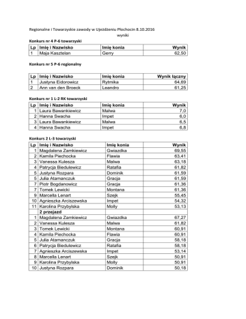 Regionalne i Towarzyskie zawody w Ujeżdżeniu Płochocin 8.10.2016 wyniki Konkurs nr 4 P-6 towarzyski Lp Imię i Nazwisko 1 Maja Kasztelan Imię konia Gerry Wynik 62,50 Imię konia Rytmika Leandro Wynik łączny 64,69 61,25 Imię konia Malwa Impet Malwa Impet Wynik 7,0 6,0 6,5 6,8 Konkurs nr 5 P-6 regionalny Lp Imię i Nazwisko 1 Justyna Eidorowicz 2 Ann van den Broeck Konkurs nr 1 L-2 RK towarzyski Lp 1 2 3 4 Imię i Nazwisko Laura Bawankiewicz Hanna Swacha Laura Bawankiewicz Hanna Swacha Konkurs 2 L-3 towarzyski Lp 1 2 3 4 5 5 7 7 9 10 11 1 2 3 4 5 6 7 8 9 10 Imię i Nazwisko Magdalena Zamkiewicz Kamila Piechocka Vanessa Kulesza Patrycja Biedulewicz Justyna Rozpara Julia Atamanczuk Piotr Bogdanowicz Tomek Lewicki Marcella Lenart Agnieszka Arciszewska Karolina Przybylska 2 przejazd Magdalena Zamkiewicz Vanessa Kulesza Tomek Lewicki Kamila Piechocka Julia Atamanczuk Patrycja Biedulewicz Agnieszka Arciszewska Marcella Lenart Karolina Przybylska Justyna Rozpara Imię konia Gwiazdka Flawia Malwa Ratafia Dominik Gracja Gracja Montana Szejk Impet Molly Wynik 69,55 63,41 63,18 61,82 61,59 61,59 61,36 61,36 55,45 54,32 53,13 Gwiazdka Malwa Montana Flawia Gracja Ratafia Impet Szejk Molly Dominik 67,27 61,82 60,91 60,91 58,18 58,18 53,14 50,91 50,91 50,18 Konkurs 3 L-3 regionalny Lp Imię i Nazwisko 1 Ann van den Broeck Imię konia Leandro Wynik łączny 68,82 Konkurs 6 N-5 regionalny Lp Imię i Nazwisko N Justyna Eidorowicz Imię konia Rozmaryn Wynik łączny 63,58