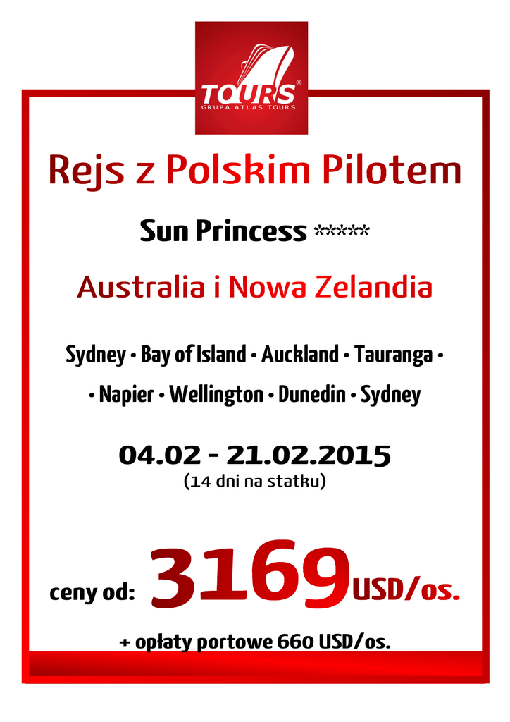 Sun Princess ***** Sydney • Bay of Island • Auckland • Tauranga • • Napier • Wellington • Dunedin • Sydney 04.02 - 21.02.2015 (14 dni na statku) ceny od: + opłaty portowe 660 USD/os.