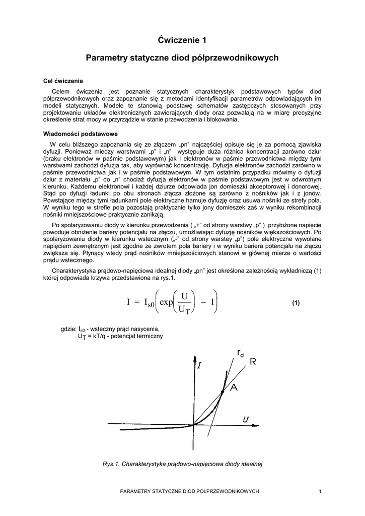 Ćwiczenie 1 Parametry statyczne diod półprzewodnikowych Cel ćwiczenia Celem ćwiczenia jest poznanie statycznych charakterystyk podstawowych typów diod półprzewodnikowych oraz zapoznanie się z metodami identyfikacji parametrów odpowiadających im modeli statycznych. Modele te stanowią podstawę schematów zastępczych stosowanych przy projektowaniu układów elektronicznych zawierających diody oraz pozwalają na w miarę precyzyjne określenie strat mocy w przyrządzie w stanie przewodzenia i blokowania. Wiadomości podstawowe W celu bliższego zapoznania się ze złączem „pn” najczęściej opisuje się je za pomocą zjawiska dyfuzji. Ponieważ miedzy warstwami „p” i „n” występuje duża różnica koncentracji zarówno dziur (braku elektronów w paśmie podstawowym) jak i elektronów w paśmie przewodnictwa między tymi warstwami zachodzi dyfuzja tak, aby wyrównać koncentrację. Dyfuzja elektronów zachodzi zarówno w paśmie przewodnictwa jak i w paśmie podstawowym. W tym ostatnim przypadku mówimy o dyfuzji dziur z materiału „p” do „n” chociaż dyfuzja elektronów w paśmie podstawowym jest w odwrotnym kierunku. Każdemu elektronowi i każdej dziurze odpowiada jon domieszki akceptorowej i donorowej. Stąd po dyfuzji ładunki po obu stronach złącza złożone są zarówno z nośników jak i z jonów. Powstające między tymi ładunkami pole elektryczne hamuje dyfuzję oraz usuwa nośniki ze strefy pola. W wyniku tego w strefie pola pozostają praktycznie tylko jony domieszek zaś w wyniku rekombinacji nośniki mniejszościowe praktycznie zanikają. Po spolaryzowaniu diody w kierunku przewodzenia ( „+” od strony warstwy „p” ) przyłożone napięcie powoduje obniżenie bariery potencjału na złączu, umożliwiając dyfuzję nośników większościowych. Po spolaryzowaniu diody w kierunku wstecznym („-” od strony warstey „p”) pole elektryczne wywołane napięciem zewnętrznym jest zgodne ze zwrotem pola bariery i w wyniku bariera potencjału na złączu zwiększa się. Płynący wtedy prąd nośników mniejszościowych stanowi w głównej mierze o wartości prądu wstecznego. Charakterystyka prądowo-napięciowa idealnej diody „pn” jest określona zależnością wykładniczą (1) której odpowiada krzywa przedstawiona na rys.1. U I = I s0 exp 1 UT (1) gdzie: Is0 - wsteczny prąd nasycenia, UT = kT/q - potencjał termiczny Rys.1. Charakterystyka prądowo-napięciowa diody idealnej PARAMETRY STATYCZNE DIOD PÓŁPRZEWODNIKOWYCH 1 Na rys.1, w obszarze odpowiadającym polaryzacji diody w kierunku przewodzenia zaznaczono punkt pracy A. Dla każdego punktu pracy można wprowadzić dwa parametry opisujące zachowanie się diody w obwodzie elektrycznym. Są to: rezystancja statyczna i rezystancja dynamiczna. Rezystancja statyczna jest określona przez nachylenie prostej łączącej punkt pracy z początkiem układu współrzędnych i jest zdefiniowana wzorem (2): U I R U Rezystancja dynamiczna jest określona przez cotangens do charakterystyki w punkcie pracy i jest zdefiniowana wzorem (3): dU dI rd (2) U I s0 exp 1 UT kąta UT U I s0 exp UT nachylenia stycznej (3) Na rys.1 zaznaczono dla punktu pracy A obie linie określające rezystancję statyczną R i rezystancję dynamiczną rd. Pojęcie rezystancji dynamicznej rd wykorzystano w najprostszym statycznym modelu liniowym diody dla stanu przewodzenia. Istota tego modelu jest przedstawiona na rys.2. Dioda idealna z rys.2a która jest elementem nieliniowym, została zastąpiona przez pokazane na rys.2b szeregowe połączenie źródła napięciowego Up i rezystancji rd. Parametry modelu, Up i rd są określone przez styczną w punkcie pracy, a charakterystyka diody jest aproksymowana przez linię łamaną przedstawioną na rys.2c. A A . . r d Up (a) . . K K (b) (c) Rys.2. Dioda idealna (a), jej schemat zastępczy (b) oraz odpowiadająca mu charakterystyka odcinkowo-liniowa (c) W diodzie rzeczywistej występuje szereg zjawisk, które nie były uwzględnione przy wyznaczaniu równania diody idealnej. Należą do nich m.in. rezystancja obszarów odległych od złącza, prądy upływu związane ze zjawiskami powierzchniowymi, rekombinacja i generacja w obszarze ładunku przestrzennego złącza oraz zjawiska polowej i lawinowej generacji nośników przy polaryzacji wstecznej. Powoduje to, że charakterystyka prądowo-napięciowa diody rzeczywistej ma nieco inny kształt (rys.3). PARAMETRY STATYCZNE DIOD PÓŁPRZEWODNIKOWYCH 2 Rys.3. Przykładowa charakterystyka diody rzeczywistej Aby móc wykorzystać przedstawione w pkt. 2 sposoby opisu diody idealnej do analizy obwodów zawierających diody rzeczywiste można wykorzystać schemat zastępczy diody pokazany na rys.4. Zawiera on diodę idealną Di, rezystancję szeregową Rs oraz konduktancję upływu Gu natomiast nie uwzględnia zjawisk lawinowego i polowego przebicia złącza. Rys.4. Schemat zastępczy diody rzeczywistej Rys.5. Aproksymacja odcinkowo-liniowa charakterystyki statycznej diody rzeczywistej W niektórych zastosowaniach wygodnie jest zastosować model statyczny diody rzeczywistej utworzony poprzez aproksymację charakterystyki diody rzeczywistej trzema odcinkami linii prostej, jak to pokazano na rys.5. Napięcia Up oraz Uz oznaczają odpowiednio napięcie progowe (próg przewodzenia) i napięcie przebicia. Nachylenia poszczególnych odcinków odpowiadają średnim PARAMETRY STATYCZNE DIOD PÓŁPRZEWODNIKOWYCH 3 rezystancjom przyrostowym RF, RR i RB, odpowiednio w obszarze przewodzenia, zaporowym i obszarze przebicia. Rezystancja RR w sposób istotny zależy od materiału, z którego jest wykonana dioda. W diodach krzemowych jest ona większa przeciętnie o dwa rzędy niż w diodach germanowych i może osiągać wartości rzędu 1000 M. Rezystancje RF i RB przyjmują podobne wartości niezależnie od materiału diody i wynoszą od 1 do 100 . Wykonanie ćwiczenia Uproszczone schematy układów pomiarowe pokazane są na rys.6. (a) (b) Rys