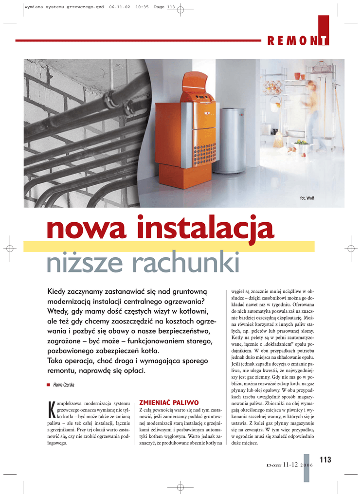 wymiana systemu grzewczego.qxd 06-11-02 10:35 Page 113 REMONT fot. Wolf nowa instalacja niĝsze rachunki Kiedy zaczynamy zastanawiaÊ siÚ nad gruntownÈ modernizacjÈ instalacji centralnego ogrzewania? Wtedy, gdy mamy doĂÊ czÚstych wizyt w kotïowni, ale teĝ gdy chcemy zaoszczÚdziÊ na kosztach ogrzewania i pozbyÊ siÚ obawy o nasze bezpieczeñstwo, zagroĝone – byÊ moĝe – funkcjonowaniem starego, pozbawionego zabezpieczeñ kotïa. Taka operacja, choÊ droga i wymagajÈca sporego remontu, naprawdÚ siÚ opïaci. Hanna Czerska K ompleksowa modernizacja systemu grzewczego oznacza wymianÚ nie tylko kotïa – byÊ moĝe takĝe ze zmianÈ paliwa – ale teĝ caïej instalacji, ïÈcznie z grzejnikami. Przy tej okazji warto zastanowiÊ siÚ, czy nie zrobiÊ ogrzewania podïogowego. ZMIENIAm PALIWO Z caïÈ pewnoĂciÈ warto siÚ nad tym zastanowiÊ, jeĂli zamierzamy poddaÊ gruntownej modernizacji starÈ instalacjÚ z grzejnikami ĝeliwnymi i pozbawionym automatyki kotïem wÚglowym. Warto jednak zaznaczyÊ, ĝe produkowane obecnie kotïy na wÚgiel sÈ znacznie mniej uciÈĝliwe w obsïudze – dziÚki zasobnikowi moĝna go dokïadaÊ nawet raz w tygodniu. Oferowana do nich automatyka pozwala zaĂ na znacznie bardziej oszczÚdnÈ eksploatacjÚ. Moĝna równieĝ korzystaÊ z innych paliw staïych, np. peletów lub prasowanej sïomy. Kotïy na pelety sÈ w peïni zautomatyzowane, ïÈcznie z „dokïadaniem” opaïu podajnikiem. W obu przypadkach potrzeba jednak duĝo miejsca na skïadowanie opaïu. JeĂli jednak zapadïa decyzja o zmianie paliwa, nie ulega kwestii, ĝe najwygodniejszy jest gaz ziemny. Gdy nie ma go w pobliĝu, moĝna rozwaĝaÊ zakup kotïa na gaz pïynny lub olej opaïowy. W obu przypadkach trzeba uwzglÚdniÊ sposób magazynowania paliwa. Zbiorniki na olej wymagajÈ okreĂlonego miejsca w piwnicy i wykonania szczelnej wanny, w których siÚ je ustawia. Z kolei gaz pïynny magazynuje siÚ na zewnÈtrz. W tym wiÚc przypadku, w ogrodzie musi siÚ znaleěÊ odpowiednio duĝe miejsce. 11−12 2006 113 wymiana systemu grzewczego.qxd 06-11-02 10:35 Page 114 REMONT Pomieszczenie z kotïem na olej opaïowy i magazyn oleju doprowadzenie powietrza Ăwieĝego kratka wyciÈgowa wanna zatrzymujÈca wyciek oleju kocioï zbiornik oleju Olej opaïowy musi byÊ magazynowany w specjalnych zbiornikach umieszczonych w szczelnej wannie Miejsce ustawienia kotïa takĝe nie jest dowolne. Ten na gaz pïynny nie moĝe znaleěÊ siÚ w piwnicy, a tylko w pomieszczeniu usytuowanym powyĝej terenu. Z wymianÈ kotïa na paliwa staïe na zasilany innym paliwem wiÈĝe siÚ jeszcze jedno utrudnienie. Konieczne jest zamontowanie w przewodzie kominowym wkïadu ze stali kwasoodpornej, który zabezpieczy jego Ăcianki przed agresywnym oddziaïywaniem skroplin. JAKI KOCIO Gdy podjÚta zostaïa juĝ decyzja co do paliwa, trzeba zastanowiÊ siÚ, jaki kocioï bÚdzie nam potrzebny. Od tego, czy bÚdzie on tradycyjny, niskotemperaturowy czy kondensacyjny, zaleĝy m.in. dobór grzejników, w tym moĝliwoĂÊ zainstalowania specyficznego grzejnika, jakim jest ogrzewanie podïogowe, oraz Ărednica i rodzaj rur. W kotïach tradycyjnych woda osiÈga temperaturÚ 90°C, zaĂ sprawnoĂÊ urzÈdzeñ siÚga 90%. Kotïy niskotemperaturowe osiÈgajÈ wyĝszÈ sprawnoĂÊ; niĝsza temperatura wody (zasilajÈcej 75°C, powrotnej 40 a nawet 30°C), pozwala oszczÚdziÊ na kosztach ogrzewania, wiÚkszy jest teĝ wybór materiaïów do instalacji. Waĝne jest teĝ, jakie funkcje ma peïniÊ nowy kocioï. JeĂli bÚdzie tylko ogrzewaï dom, kupuje siÚ urzÈdzenie jednofunkcyjne. W tym przypadku ciepïÈ wodÚ uzyskuje siÚ najczÚĂciej z podgrzewacza – gazowego lub elektrycznego. Moĝe to byÊ popularna terma, czyli fachowo mó- 114 2006 11−12 KUBATURA spaliny Kotïy zasilane gazem lub olejem opaïowym trzeba instalowaÊ w pomieszczeniach o okreĂlonej kubaturze. UrzÈdzenia z otwartÈ komorÈ spalania wymagajÈ kotïowni majÈcej 8 m3, natomiast dla tych z zamkniÚtÈ wystarczy 6,5 m3. Przepisy nakazujÈ, by nie instalowaÊ kotïa w pomieszczeniach mieszkalnych. Tutaj wyjÈtkiem sÈ jedynie urzÈdzenia z zamkniÚtÈ komorÈ spalania, które sÈ podïÈczone do wyprowadzonej na zewnÈtrz rury powietrznospalinowej. wiÈc – podgrzewacz pojemnoĂciowy – lub urzÈdzenie przepïywowe. To drugie moĝe byÊ przeznaczone do obsïugi jednego lub kilku punktów poboru wody. Gdy kocioï bÚdzie podgrzewaï równieĝ ciepïÈ wodÚ uĝytkowÈ – powinien byÊ dwufunkcyjny lub jednofunkcyjny z zasobnikiem. Kotïy na paliwa staïe sÈ przede wszystkim urzÈdzeniami jednofunkcyjnymi stojÈcymi. Produkowane sÈ wprawdzie kotïy dwufunkcyjne, ale perspektywa obsïugiwania ich nawet w lecie z reguïy zniechÚca do zakupu. Wiele modeli nowoczesnych kotïów moĝe wspóïpracowaÊ takĝe z instalacjami niskotemperaturowymi. Moĝna kupiÊ kocioï z zasobnikiem, dziÚki czemu paliwo dokïada siÚ rzadziej – nawet raz na tydzieñ. SpoĂród urzÈdzeñ na paliwa staïe, najwiÚkszÈ sprawnoĂÊ majÈ kotïy retortowe, w których zamiast rusztu znajduje siÚ specjalny palnik retortowy. MniejszÈ sprawnoĂÊ majÈ kotïy ze spalaniem dolnym, a najniĝszÈ – te ze spalaniem górnym. Kotïy gazowe sÈ jedno- i dwufunkcyjne, z otwartÈ lub zamkniÚtÈ komorÈ spalania. Te drugie majÈ wyĝszÈ sprawnoĂÊ. Kotïy dwufunkcyjne sÈ zazwyczaj wiszÈce, jeĂli majÈ zamkniÚtÈ komorÚ spalania, moĝna je powiesiÊ nawet w przedpokoju czy ciÈgu szafek kuchennych. Konstrukcja kotïów na gaz ziemny i pïynny jest taka sama. Kotïy olejowe w wiÚkszoĂci sÈ urzÈdzeniami jednofunkcyjnymi, dostosowanymi do wspóïpracy z zasobnikami wody. Rów- powietrze wentylator wymiennik ciepïa gaz Przewód powietrzno spalinowy moĝe byÊ wyprowadzony przez ĂcianÚ zewnÚtrznÈ (rzut z góry) nieĝ one osiÈgajÈ wysokÈ sprawnoĂÊ, dochodzÈcÈ do ok. 94%. PewnÈ niedogodnoĂciÈ zwiÈzanÈ z wykorzystywaniem oleju opaïowego jest konieczno