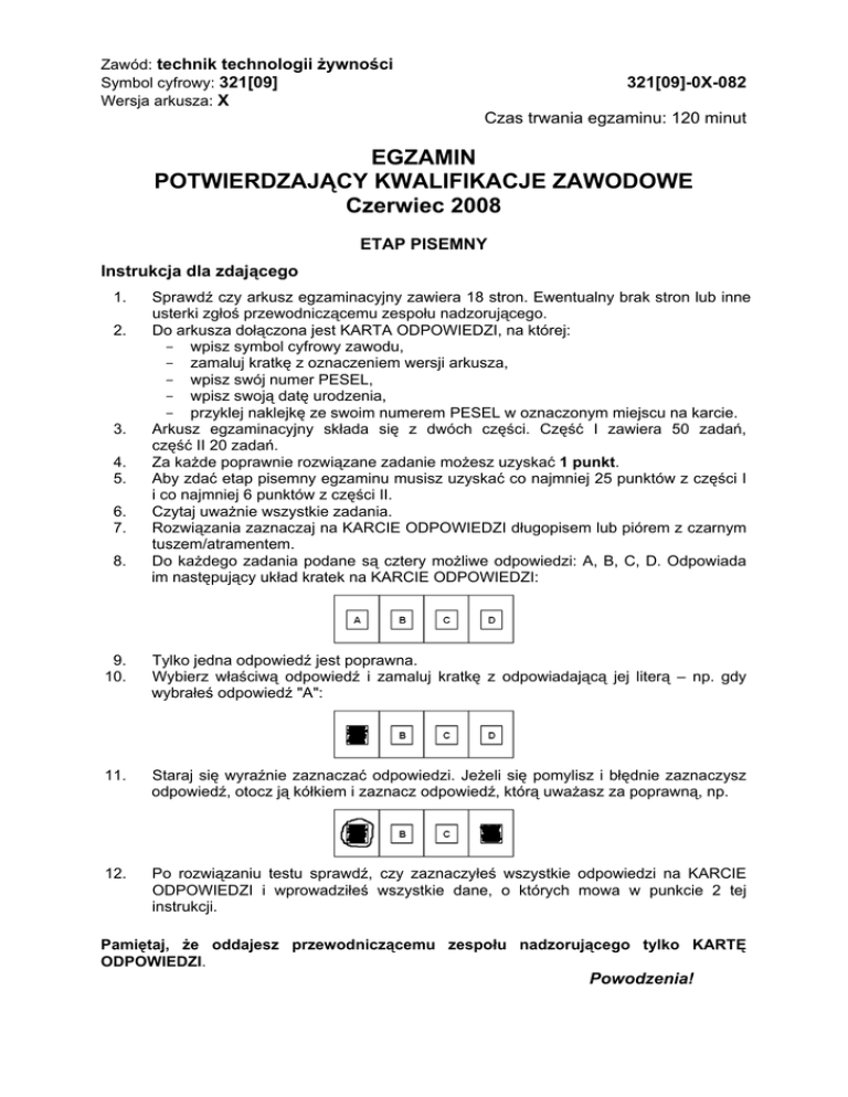 Zawód: technik technologii żywności Symbol cyfrowy: 321[09] Wersja arkusza: X 321[09]-0X-082 Czas trwania egzaminu: 120 minut EGZAMIN POTWIERDZAJĄCY KWALIFIKACJE ZAWODOWE Czerwiec 2008 ETAP PISEMNY Instrukcja dla zdającego 1. 2. 3. 4. 5. 6. 7. 8. Sprawdź czy arkusz egzaminacyjny zawiera 18 stron. Ewentualny brak stron lub inne usterki zgłoś przewodniczącemu zespołu nadzorującego. Do arkusza dołączona jest KARTA ODPOWIEDZI, na której: - wpisz symbol cyfrowy zawodu, - zamaluj kratkę z oznaczeniem wersji arkusza, - wpisz swój numer PESEL, - wpisz swoją datę urodzenia, - przyklej naklejkę ze swoim numerem PESEL w oznaczonym miejscu na karcie. Arkusz egzaminacyjny składa się z dwóch części. Część I zawiera 50 zadań, część II 20 zadań. Za każde poprawnie rozwiązane zadanie możesz uzyskać 1 punkt. Aby zdać etap pisemny egzaminu musisz uzyskać co najmniej 25 punktów z części I i co najmniej 6 punktów z części II. Czytaj uważnie wszystkie zadania. Rozwiązania zaznaczaj na KARCIE ODPOWIEDZI długopisem lub piórem z czarnym tuszem/atramentem. Do każdego zadania podane są cztery możliwe odpowiedzi: A, B, C, D. Odpowiada im następujący układ kratek na KARCIE ODPOWIEDZI: 9. 10. Tylko jedna odpowiedź jest poprawna. Wybierz właściwą odpowiedź i zamaluj kratkę z odpowiadającą jej literą – np. gdy wybrałeś odpowiedź "A": 11. Staraj się wyraźnie zaznaczać odpowiedzi. Jeżeli się pomylisz i błędnie zaznaczysz odpowiedź, otocz ją kółkiem i zaznacz odpowiedź, którą uważasz za poprawną, np. 12. Po rozwiązaniu testu sprawdź, czy zaznaczyłeś wszystkie odpowiedzi na KARCIE ODPOWIEDZI i wprowadziłeś wszystkie dane, o których mowa w punkcie 2 tej instrukcji. Pamiętaj, że oddajesz przewodniczącemu zespołu nadzorującego tylko KARTĘ ODPOWIEDZI. Powodzenia! CZĘŚĆ I Zadanie 1. Norma terminologiczna dotyczy A. B. C. D. ogólnych postanowień w jednej określonej dziedzinie. terminów i ich definicji, objaśnień i przykładów. metod i kolejności badań, pobierania próbek. wymagań, które powinien spełniać wyrób. Zadanie 2. Składniki pokarmowe pełniące funkcje budulcowe w organizmie to A. B. C. D. białka i tłuszcze. białka i sole mineralne. węglowodany i tłuszcze. witaminy i sole mineralne. Zadanie 3. Amylazy to enzymy katalizujące rozkład A. B. C. D. białek. skrobi. pektyn. sacharozy. Zadanie 4. Skrót NNKT oznacza A. B. C. D. niezbędne nasycone kwasy tłuszczowe. niepełnowartościowe nasycone kwasy tłuszczowe. niezbędne nienasycone kwasy tłuszczowe. niepełnowartościowe nienasycone kwasy tłuszczowe. Zadanie 5. Podstawowym białkiem mleka jest A. B. C. D. gluten. kazeina. amyloza. elastyna. Strona 2 z 18 Zadanie 6. Do grupy opakowań nietrwałych zalicza się torebki papierowe oraz A. B. C. D. butelki. puszki metalowe. kartony. folie spożywcze. Zadanie 7. Do napojów mlecznych fermentowanych należą: A. B. C. D. kefir, jogurt. kefir, mleko kawowe. jogurt, mleko zagęszczone. mleko spożywcze, maślanka. Zadanie 8. Które produkty dostarczają pełnowartościowego białka? A. B. C. D. Jaja. Kasze. Grzyby. Ziemniaki. Zadanie 9. Rozparzanie polega na A. B. C. D. ogrzaniu surowca do temperatury wrzenia. silnym ogrzewaniu surowca w gorącym tłuszczu. gwałtownym rozprężaniu uprzednio ogrzanego surowca. ogrzewaniu za pomocą pary w celu przejścia surowca w stan półpłynny. Zadanie 10. Homogenizacja mleka A. B. C. D. zapobiega zbieraniu się tłuszczu na powierzchni mleka. zwiększa jego wartość odżywczą i energetyczną. zmniejsza zawartość tłuszczu w mleku. powoduje jego oczyszczenie. Strona 3 z 18 Zadanie 11. W czasie gotowania skrobia ulega A. B. C. D. karmelizacji. denaturacji. kleikowaniu. fermentacji. Zadanie 12. Substancjami stosowanymi w osmoaktywnych metodach utrwalania żywności są: A. B. C. D. chlorek sodu, cukier. kwas cytrynowy, ocet. kwas winowy, cukier. pektyny, ocet. Zadanie 13. Celem peklowania mięsa jest zwiększenie A. B. C. D. smakowitości i aromatu wyrobu. trwałości i utrwalenie barwy. wydajności produkcji. wartości zdrowotnej. Zadanie 14. Do których metod utrwalania żywności należy wędzenie? A. B. C. D. Mikrobiologicznych. Fizykochemicznych. Chemicznych. Fizycznych. Zadanie 15. Do pomiaru ciśnienia stosuje się A. B. C. D. termometry. manometry. areometry. rotametry. Strona 4 z 18 Zadanie 16. Jak nazywa się urządzenie do rozrostu i fermentacji ciasta? A. B. C. D. Garownik. Masownica. Przesiewacz. Piec obrotowy. Zadanie 17. Jakie urządzenie jest przedstawione na schemacie? A. B. C. D. Masownica. Mieszarka. Kuter. Wilk. Zadanie 18. Metoda Kjeldahla, wykorzystywana w analizie środków spożywczych, służy do oznaczania zawartości A. B. C. D. białek. cukrów. popiołu. tłuszczu. Zadanie 19. Która z metod jest stosowana do oznaczenia gęstości mleka dostarczonego do zakładu mleczarskiego? A. B. C. D. Jodometryczna. Areometryczna. Grawimetryczna. Alkacymetryczna. Zadanie 20. Do oznaczania twardości wody stosuje się metodę A. B. C. D. wersenianową. Bertranda. piknometryczną. Winklera. Strona 5 z 18 Zadanie 21. Przeprowadzanie kolejno zaplanowanych obserwacji w punkcie krytycznym, w celu stwierdzenia czy znajduje się on pod kontrolą to A. B. C. D. działania zapobiegawcze. działania korygujące. analiza zagrożeń. monitoring. Zadanie 22. Surowcem do produkcji piwa w Polsce jest A. B. C. D. jęczmień. gorczyca. owies. żyto. Zadanie 23. Do barwienia serów podpuszczkowych stosuje się A. B. C. D. karmel. annato. chlorofil. koszelinę. Zadanie 24. Do produkcji marcepana wykorzystuje się A. B. C. D. orzechy. migdały. mak. ser. Zadanie 25. Które z metod utrwalania żywności mają zastosowanie przy produkcji marmolad? A. B. C. D. Blanszowanie i słodzenie. Słodzenie i zagęszczanie. Zagęszczanie i solenie. Słodzenie i suszenie. Strona 6 z 18 Zadanie 26. Utrwalanie przez sterylizację stosuje się przy produkcji A. B. C. D. oleju rzepakowego. 