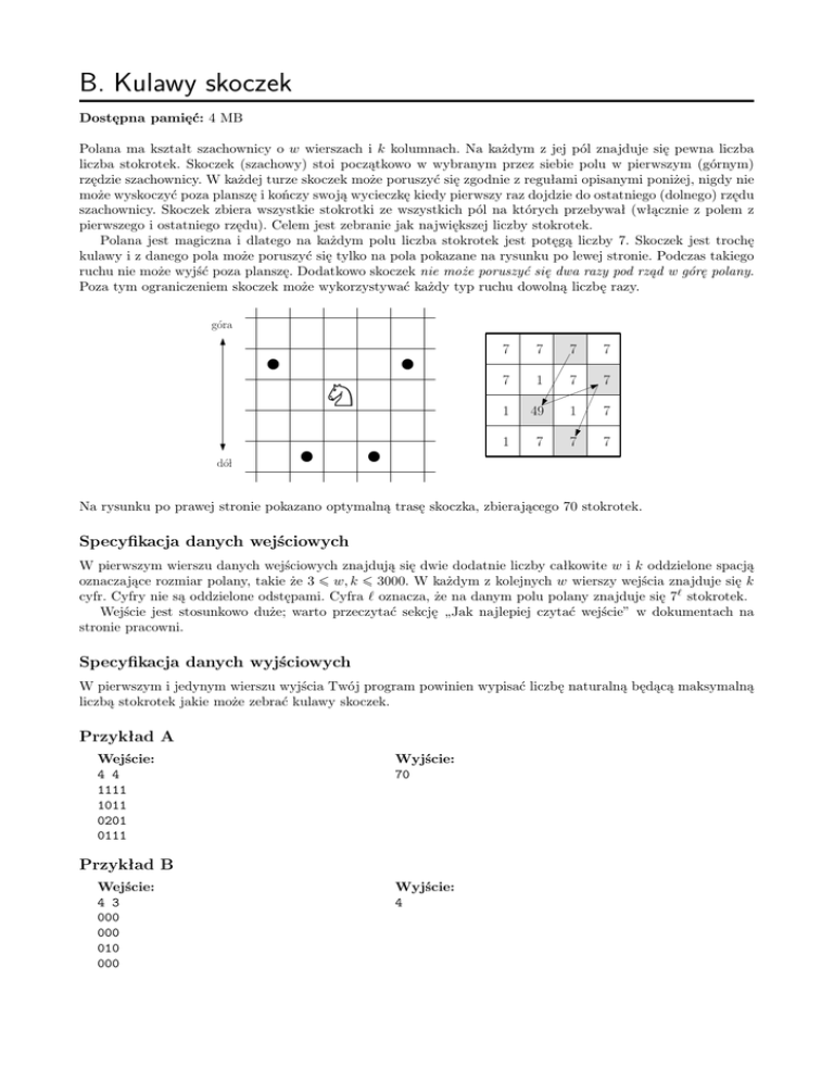 B. Kulawy skoczek Dostępna pamięć: 4 MB Polana ma kształt szachownicy o w wierszach i k kolumnach. Na każdym z jej pól znajduje się pewna liczba liczba stokrotek. Skoczek (szachowy) stoi początkowo w wybranym przez siebie polu w pierwszym (górnym) rzędzie szachownicy. W każdej turze skoczek może poruszyć się zgodnie z regułami opisanymi poniżej, nigdy nie może wyskoczyć poza planszę i kończy swoją wycieczkę kiedy pierwszy raz dojdzie do ostatniego (dolnego) rzędu szachownicy. Skoczek zbiera wszystkie stokrotki ze wszystkich pól na których przebywał (włącznie z polem z pierwszego i ostatniego rzędu). Celem jest zebranie jak największej liczby stokrotek. Polana jest magiczna i dlatego na każdym polu liczba stokrotek jest potęgą liczby 7. Skoczek jest trochę kulawy i z danego pola może poruszyć się tylko na pola pokazane na rysunku po lewej stronie. Podczas takiego ruchu nie może wyjść poza planszę. Dodatkowo skoczek nie może poruszyć się dwa razy pod rząd w górę polany. Poza tym ograniczeniem skoczek może wykorzystywać każdy typ ruchu dowolną liczbę razy. góra 7 7 7 7 7 1 7 7 1 49 1 7 1 7 7 7 dól Na rysunku po prawej stronie pokazano optymalną trasę skoczka, zbierającego 70 stokrotek. Specyfikacja danych wejściowych W pierwszym wierszu danych wejściowych znajdują się dwie dodatnie liczby całkowite w i k oddzielone spacją oznaczające rozmiar polany, takie że 3 ¬ w, k ¬ 3000. W każdym z kolejnych w wierszy wejścia znajduje się k cyfr. Cyfry nie są oddzielone odstępami. Cyfra ` oznacza, że na danym polu polany znajduje się 7` stokrotek. Wejście jest stosunkowo duże; warto przeczytać sekcję „Jak najlepiej czytać wejście” w dokumentach na stronie pracowni. Specyfikacja danych wyjściowych W pierwszym i jedynym wierszu wyjścia Twój program powinien wypisać liczbę naturalną będącą maksymalną liczbą stokrotek jakie może zebrać kulawy skoczek. Przykład A Wejście: 4 4 1111 1011 0201 0111 Wyjście: 70 Przykład B Wejście: 4 3 000 000 010 000 Wyjście: 4 Przykład C Wejście: 4 6 001100 011110 011110 001100 Wyjście: 28 Ogólne specyfikacje i zasady oddawania zadań znajdują się pod adresem: http://www.ii.uni.wroc.pl/~mbi/dyd/