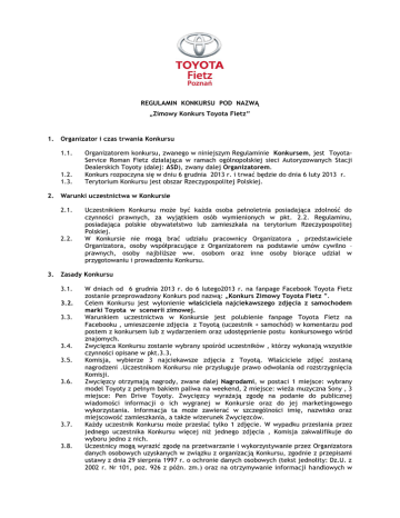 REGULAMIN KONKURSU POD NAZWĄ „Zimowy Konkurs Toyota Fietz” 1. Organizator i czas trwania Konkursu 1.1. 1.2. 1.3. 2. Warunki uczestnictwa w Konkursie 2.1. 2.2. 3. Organizatorem konkursu, zwanego w niniejszym Regulaminie Konkursem, jest ToyotaService Roman Fietz działająca w ramach ogólnopolskiej sieci Autoryzowanych Stacji Dealerskich Toyoty (dalej: ASD), zwany dalej Organizatorem. Konkurs rozpoczyna się w dniu 6 grudnia 2013 r. i trwać będzie do dnia 6 luty 2013 r. Terytorium Konkursu jest obszar Rzeczypospolitej Polskiej. Uczestnikiem Konkursu może być każda osoba pełnoletnia posiadająca zdolność do czynności prawnych, za wyjątkiem osób wymienionych w pkt. 2.2. Regulaminu, posiadająca polskie obywatelstwo lub zamieszkała na terytorium Rzeczypospolitej Polskiej. W Konkursie nie mogą brać udziału pracownicy Organizatora , przedstawiciele Organizatora, osoby współpracujące z Organizatorem na podstawie umów cywilno – prawnych, osoby najbliższe ww. osobom oraz inne osoby biorące udział w przygotowaniu i prowadzeniu Konkursu. Zasady Konkursu 3.1. 3.2. 3.3. 3.4. 3.5. 3.6. 3.7. 3.8. W dniach od 6 grudnia 2013 r. do 6 lutego2013 r. na fanpage Facebook Toyota Fietz zostanie przeprowadzony Konkurs pod nazwą: „Konkurs Zimowy Toyota Fietz ”. Celem Konkursu jest wyłonienie właściciela najciekawszego zdjęcia z samochodem marki Toyota w scenerii zimowej. Warunkiem uczestnictwa w Konkursie jest polubienie fanpage Toyota Fietz na Facebooku , umieszczenie zdjęcia z Toyotą (uczestnik + samochód) w komentarzu pod postem z konkursem lub z wydarzeniem oraz udostępnienie postu konkursowego wśród znajomych. Zwycięzca Konkursu zostanie wybrany spośród uczestników , którzy wykonają wszystkie czynności opisane w pkt.3.3. Komisja, wybierze 3 najciekawsze zdjęcia z Toyotą. Właściciele zdjęć zostaną nagrodzeni .Uczestnikom Konkursu nie przysługuje prawo odwołania od rozstrzygnięcia Komisji. Zwycięzcy otrzymają nagrody, zwane dalej Nagrodami, w postaci 1 miejsce: wybrany model Toyoty z pełnym bakiem paliwa na weekend, 2 miejsce: wieża muzyczna Sony , 3 miejsce: Pen Drive Toyoty. Zwycięzcy wyrażają zgodę na podanie do publicznej wiadomości informacji o ich wygranej w Konkursie oraz do jej marketingowego wykorzystania. Informacja ta może zawierać w szczególności imię, nazwisko oraz miejscowość zamieszkania, a także wizerunek Zwycięzców. Każdy uczestnik Konkursu może przesłać tylko 1 zdjęcie. W wypadku przesłania przez jednego uczestnika Konkursu więcej niż jednego zdjęcia , Komisja zakwalifikuje do wyboru jedno z nich. Uczestnicy mogą wyrazić zgodę na przetwarzanie i wykorzystywanie przez Organizatora danych osobowych uzyskanych w związku z organizacją Konkursu, zgodnie z przepisami ustawy z dnia 29 sierpnia 1997 r. o ochronie danych osobowych (tekst jednolity: Dz.U. z 2002 r. Nr 101, poz. 926 z późn. zm.) oraz na otrzymywanie informacji handlowych w rozumieniu Ustawy z dnia 18 lipca 2002 r. o świadczeniu usług drogą elektroniczną (Dz.U. Nr 144, poz. 1204 z późn. zm.), w celach przedstawionych w Kuponie. 4. Odbiór nagrody 4.1. 4.2. 4.3. 4.4. 5. Organizator powiadomi Zwycięzców o wygraniu Nagrody pocztą elektroniczną w terminie 7 dni od dnia stwierdzenia przez Komisję wygranej w Konkursie oraz ustali ze Zwycięzcą odbiór Nagrody. Odbiór Nagrody nastąpi w sposób ustalony między Zwycięzcą a organizatorem. W wypadku, gdy Zwycięzca nie stawi się w celu odbioru Nagrody lub nie dokona odbioru Nagrody w inny przewidziany w niniejszym Regulaminie sposób, a także nie poinformuje na piśmie o konieczności wyznaczenia innego terminu, traci prawo do Nagrody. Za Nagrodę nie przysługuje ekwiwalent pieniężny. Uprawnienie do korzystania z Nagrody jest niezbywalne. Postanowienia końcowe 5.1. 5.2. Regulamin Konkursu jest dostępny w recepcji Toyota- Service Roman Fietz , na stronie internetowej www.toyota.poznan.pl a także na profilu Facebook Toyota Fietz Poznań .Konkurs nie jest grą losową w rozumieniu ustawy z dnia 29 lipca 1992 r. o grach i zakładach wzajemnych (tekst jednolity: Dz.U. z 2004 r. Nr 4, poz. 27 z późn. zm.). Uczestnicząc w Konkursie zgodnie z postanowieniami niniejszego Regulaminu, uczestnik Konkursu potwierdza, że wyraża zgodę na zasady Konkursu zawarte w niniejszym Regulaminie. Poznań, dnia 6 grudnia 2013 r.