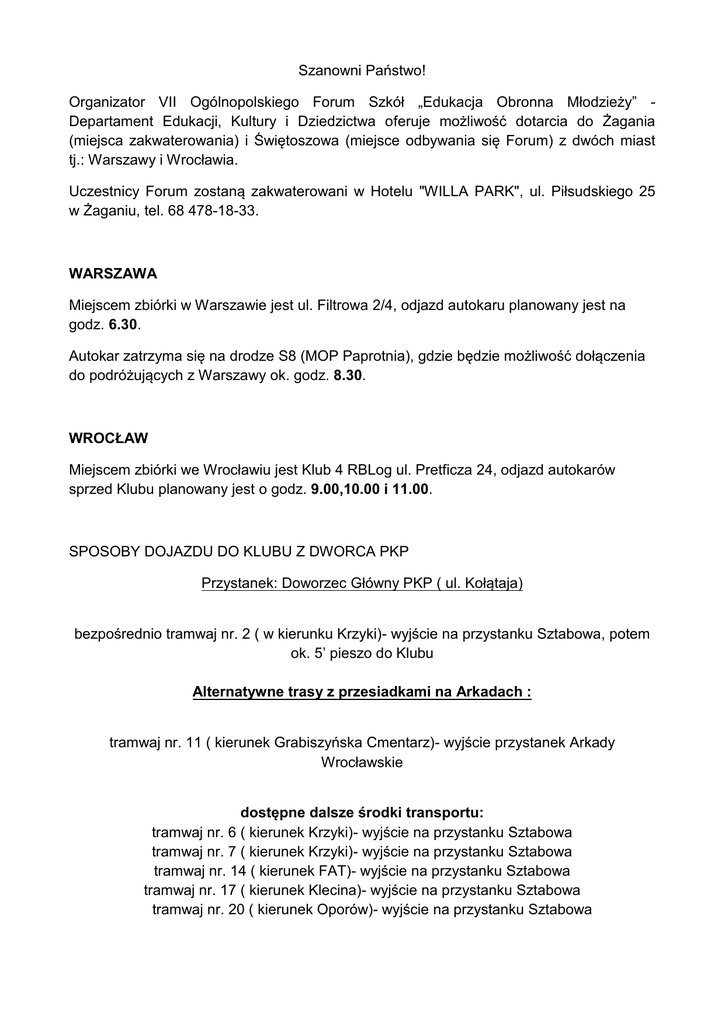 Szanowni Państwo! Organizator VII Ogólnopolskiego Forum Szkół „Edukacja Obronna Młodzieży” Departament Edukacji, Kultury i Dziedzictwa oferuje możliwość dotarcia do Żagania (miejsca zakwaterowania) i Świętoszowa (miejsce odbywania się Forum) z dwóch miast tj.: Warszawy i Wrocławia. Uczestnicy Forum zostaną zakwaterowani w Hotelu "WILLA PARK", ul. Piłsudskiego 25 w Żaganiu, tel. 68 478-18-33. WARSZAWA Miejscem zbiórki w Warszawie jest ul. Filtrowa 2/4, odjazd autokaru planowany jest na godz. 6.30. Autokar zatrzyma się na drodze S8 (MOP Paprotnia), gdzie będzie możliwość dołączenia do podróżujących z Warszawy ok. godz. 8.30. WROCŁAW Miejscem zbiórki we Wrocławiu jest Klub 4 RBLog ul. Pretficza 24, odjazd autokarów sprzed Klubu planowany jest o godz. 9.00,10.00 i 11.00. SPOSOBY DOJAZDU DO KLUBU Z DWORCA PKP Przystanek: Doworzec Główny PKP ( ul. Kołątaja) bezpośrednio tramwaj nr. 2 ( w kierunku Krzyki)- wyjście na przystanku Sztabowa, potem ok. 5’ pieszo do Klubu Alternatywne trasy z przesiadkami na Arkadach : tramwaj nr. 11 ( kierunek Grabiszyńska Cmentarz)- wyjście przystanek Arkady Wrocławskie dostępne dalsze środki transportu: tramwaj nr. 6 ( kierunek Krzyki)- wyjście na przystanku Sztabowa tramwaj nr. 7 ( kierunek Krzyki)- wyjście na przystanku Sztabowa tramwaj nr. 14 ( kierunek FAT)- wyjście na przystanku Sztabowa tramwaj nr. 17 ( kierunek Klecina)- wyjście na przystanku Sztabowa tramwaj nr. 20 ( kierunek Oporów)- wyjście na przystanku Sztabowa Przystanek: Dworzec Główny PKP ( u. Marszałka Piłsudskiego) tramwaj nr. OP ( kierunek Dworzec Nadodrze)- wyjście przystanek Arkady Wrocławskie dostępne dalsze środki transportu: tramwaj nr. 6 ( kierunek Krzyki)- wyjście na przystanku Sztabowa tramwaj nr. 7 ( kierunek Krzyki)- wyjście na przystanku Sztabowa tramwaj nr. 14 ( kierunek FAT)- wyjście na przystanku Sztabowa tramwaj nr. 17 ( kierunek Klecina)- wyjście na przystanku Sztabowa tramwaj nr. 20 ( kierunek Oporów)- wyjście na przystanku Sztabowa Komunikacja Autobusowa. Dworzec PKP ( ul. Sucha). autobus nr. 125 ( kierunek Bukowskiego) - wyjście na przystanku Krucza autobus nr. 325 ( w kierunku Poczta Polska) - wyjście na przystanku Krucza. SPOSOBY DOJAZDU DO KLUBU Z DWORCA AUTOBUSOWEGO Przystanek: Dworzec Autobusowy ( ul. Borowska). tramwaj nr. 32 ( kierunek Dokerska) - wyjście na przystanku Arkady tramwaj nr. 31 ( kierunek Dworzec Miejski)- wyjście przystanek Arkady Wrocławskie dostępne dalsze środki transportu: tramwaj nr. 6 ( kierunek Krzyki)- wyjście na przystanku Sztabowa tramwaj nr. 7 ( kierunek Krzyki)- wyjście na przystanku Sztabowa tramwaj nr. 14 ( kierunek FAT)- wyjście na przystanku Sztabowa tramwaj nr. 17 ( kierunek Klecina)- wyjście na przystanku Sztabowa tramwaj nr. 20 ( kierunek Oporów)- wyjście na przystanku Sztabowa