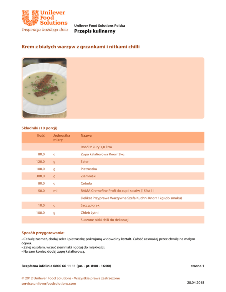 Unilever Food Solutions Polska Przepis kulinarny Krem z białych warzyw z grzankami i nitkami chilli Składniki (10 porcji) Ilość Jednostka miary Nazwa Rosół z kury 1,8 litra 80,0 g Zupa kalafiorowa Knorr 3kg 120,0 g Seler 100,0 g Pietruszka 300,0 g Ziemniaki 80,0 g Cebula 50,0 ml RAMA Cremefine Profi do zup i sosów (15%) 1 l Delikat Przyprawa Warzywna Szefa Kuchni Knorr 1kg (do smaku) 10,0 g Szczypiorek 100,0 g Chleb żytni Suszone nitki chili do dekoracji Sposób przygotowania: • Cebulę zasmaż, dodaj seler i pietruszkę pokrojoną w dowolny kształt. Całość zasmażaj przez chwilę na małym ogniu. • Zalej rosołem, wrzuć ziemniaki i gotuj do miękkości. • Na sam koniec dodaj zupę kalafiorową. Bezpłatna infolinia 0800 66 11 11 (pn. - pt. 8:00 - 16:00) strona 1 © 2012 Unilever Food Solutions - Wszystkie prawa zastrzeżone service.unileverfoodsolutions.com 28.04.2015 Unilever Food Solutions Polska Przepis kulinarny • Zmiksuj, dopraw do smaku Delikatem warzywnym i zabiel Ramą Cremefine. • Serwuj z młodym szczypiorkiem, grzankami z ciemnego pieczywa i nitkami chilli. Bezpłatna infolinia 0800 66 11 11 (pn. - pt. 8:00 - 16:00) strona 2 © 2012 Unilever Food Solutions - Wszystkie prawa zastrzeżone service.unileverfoodsolutions.com 28.04.2015