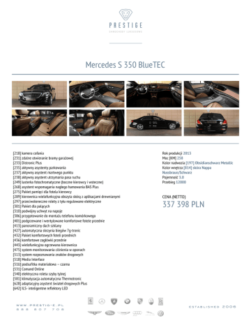 Mercedes S 350 BlueTEC [218] kamera cofania [231] zdalne otwieranie bramy garażowej [233] Distronic Plus [235] aktywny asystenty parkowania [237] aktywny asystent martwego punktu [238] aktywny asystent utrzymania pasa ruchu [249] lusterka fotochromatyczne (boczne kierowcy i wsteczne) [268] asystent wspomagania nagłego hamowania BAS Plus [275] Pakiet pamięci dla fotela kierowcy [289] kierownica wielofunkcyjna obszyta skórą z aplikacjami drewnianymi [297] przeciwsłoneczne rolety z tyłu regulowane elektryczne [301] Pakiet dla palących [310] podwójny uchwyt na napoje [386] przygotowanie do montażu telefonu komórkowego [401] podgrzewane i wentylowane komfortowe fotele przednie [413] panoramiczny dach szklany [427] automatyczna skrzynia biegów 7g-tronic [432] Pakiet komfortowych foteli przednich [436] komfortowe zagłówki przednie [443] wielofunkcyjna ogrzewana kierownica [475] system monitorowania ciśnienia w oponach [513] system rozpoznawania znaków drogowych [518] Media Interface [51U] podsufitka materiałowa – czarna [531] Comand Online [540] elektryczna roleta szyby tylnej [581] klimatyzacja automatyczna Thermotronic [628] adaptacyjny asystent świateł drogowych Plus [642] ILS- inteligentne reflektory LED Rok produkcji 2013 Moc [KM] 258 Kolor nadwozia [197] Obsidianschwarz Metallic Kolor wnętrza [814] skóra Nappa Nussbraun/Schwarz Pojemność 3.0 Przebieg 12000 CENA (NETTO) 337 398 PLN [729] elementy wykończenia wnętrza w drewnie topoli [810] system nagłaśniający Burmester Surround [814] zmieniarka DVD [865] Tuner TV [872] ogrzewane fotele tylne [874] MAGIC VISION CONTROL - wycieraczki przedniej szyby z podgrzewanym płynem spryskiwaczy [877] oświetlenie ambientowe [883] wspomaganie zamykania drzwi [889] Keyless-Go [P09] Pakiet przeciwsłoneczny - rolety przeciwsłoneczne w drzwiach tylnych; elektrycznie sterowana roleta tylnej szyby [P17] Pakiet Keyless-Go obejmujący zdalne blokowanie klapy bagażnika ze wspomaganiem zamykania klapy bagażnika; Keyless-Go [P20] Pakiet asystenta jazdy (DISTRONIC PLUS wraz z BAS PLUS oraz hamulcem PRE-SAFE®, aktywny asystent utrzymania pasa ruchu, aktywny asystent martwego pola, automatyczne rozpoznawanie fotelika dziecięcego - AKSE) [P35] Pakiet inteligentnych reflektorów w technologii LED obejmujący LED Intelligent Light System; adaptacyjny asystent świateł drogowych / adaptacyjny asystent świateł drogowych Plus [P44] Pakiet pomocy parkowania (kamera cofania, aktywny asystent parkowania) [P54] Pakiet antykradzieżowy [P64] Pakiet pamięci z przodu [P69] Pakiet komfortowego ogrzewania (podgrzewana kierownica oraz podłokietnik z przodu i z tyłu) - podgrzewane koło kierownicy; ogrzewanie komfortowe tylnych zewnętrznych foteli Plus; ogrzewany podłokietnik z przodu; ogrzewany podłokietnik z tyłu [R17] obręcze ze stopu metali lekkich 5-ramienne, podwójne 19" [U67] gniazdo 230V z tyłu Cena BRUTTO - 415.000 PLN Faktura 23% VAT Powered by TCPDF (www.tcpdf.org)