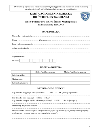 karta zgłoszenia dziecka - Szkoła Podstawowa Nr 3 w Środzie