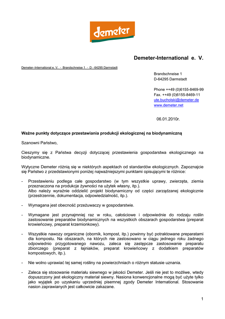 Demeter-International e. V. Demeter–International e. V. Brandschneise 1 D - 64295 Darmstadt Brandschneise 1 D-64295 Darmstadt Phone ++49 (0)6155-8469-99 Fax. ++49 (0)6155-8469-11 [email protected] www.demeter.net 06.01.2010r. Ważne punkty dotyczące przestawiania produkcji ekologicznej na biodynamiczną Szanowni Państwo, Cieszymy się z Państwa decyzji dotyczącej przestawienia gospodarstwa ekologicznego na biodynamiczne. Wytyczne Demeter różnią się w niektórych aspektach od standardów ekologicznych. Zapoznajcie się Państwo z przedstawionymi poniżej najważniejszymi punktami opisującymi te różnice: - Przestawieniu podlega całe gospodarstwo (w tym wszystkie uprawy, zwierzęta, ziemia przeznaczona na produkcje żywności na użytek własny, itp.). Albo należy wyraźnie oddzielić projekt biodynamiczny od części zarządzanej ekologicznie (przestrzennie, dokumentacja, odpowiedzialność, itp.). - Wymagana jest obecność przeżuwaczy w gospodarstwie. - Wymagane jest przynajmniej raz w roku, całościowe i odpowiednie do rodzaju roślin zastosowanie preparatów biodynamicznych na wszystkich obszarach gospodarstwa (preparat krowieńcowy, preparat krzemionkowy). - Wszystkie nawozy organiczne (obornik, kompost, itp.) powinny być potraktowane preparatami dla kompostu. Na obszarach, na których nie zastosowano w ciągu jednego roku żadnego odpowiednio przygotowanego nawozu, zaleca się zastępcze zastosowanie preparatu zbiorczego (preparat z łajniaków, preparat krowieńcowy z dodatkiem preparatów kompostowych, itp.). - Nie wolno uprawiać tej samej rośliny na powierzchniach o różnym statusie uznania. - Zaleca się stosowanie materiału siewnego w jakości Demeter. Jeśli nie jest to możliwe, wtedy dopuszczony jest ekologiczny materiał siewny. Nasiona konwencjonalne mogą być użyte tylko jako wyjątek po uzyskaniu uprzedniej pisemnej zgody Demeter International. Stosowanie nasion zaprawianych jest całkowicie zakazane. 1 - Zgodnie z załącznikiem do standardów Demeter zawierającym wykaz dozwolonych do stosowania środków, zabronione jest na przykład używanie miedzi w uprawie warzyw, dla upraw wieloletnich jej użycie ograniczone jest do maksymalnie 3 kg miedzi na hektar. - Wymagana jest deklaracja o niestosowaniu genetycznie modyfikowanych organizmów (GMO) dla wszystkich ryzykownych upraw. - Wymagany jest jasny podział przepływu towarów w produkcji, transporcie, przetwórstwie, przechowywaniu i eksporcie. Wprowadzenie systemu numerowania partii produktu (z ang. Lot Number System) jest konieczne, aby móc prześledzić obieg produktu krok po kroku, aż do gospodarstwa, z którego pochodzi. - Wymagane jest wyznaczenie pracowników, którzy są odpowiedzialni za produkcję Demeter (produkcja na poziomie gospodarstwa, przy przetwórstwie, eksporcie) i sporządzenie listy wszystkich uczestniczących handlowców, takich jak przetwórcy, magazyny, itp. Mamy nadzieję, że te informacje są dla Państwa pomocne. Z poważaniem, Demeter International e.V. (Ute Bucholski) 2