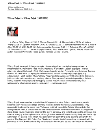 Wilczy Pająk – Wilczy Pająk (1988/2009) Written by bluesever Sunday, 04 October 2015 16:31 - Wilczy Pająk – Wilczy Pająk (1988/2009) 1. Zadna Ofiary Twarz 01:56 2. Nocny Strach 05:01 3. Memento Mori 07:34 4. Ksiaze Wojny 03:28 5. Upadek Imeprium 04:10 6. Grozba 03:39 7. Zemsta Msciciela 02:52 8. Noz w Dloni 03:27 9. M.C. 04:56 10. Dziewczyna Na Sprzedaz 5:49 11. Telewizja Uczy Zyc 03:50 12. Thrashers 03:22 Leszek Szpigiel - vocal; Piotr Mańkowski - guitar; Maciej Matuszak guitar; Mariusz Przybylski - bass guitar; Tomasz Goehs – drums. Wilczy Pająk to zespół, którego muzyka plasuje się gdzieś pomiędzy heavymetalem a thrashmetalem. Powstał w 1985 roku w Poznaniu w składzie: Leszek Szpiegiel - wokal, gitarzyści Maciej Matuszak i Piotr Mańkowski, basista Marian Przybylski oraz bębniarz Tomasz Goehs. W 1988 roku, po występie na Metalmanii, zmienił nazwę na jej anglojęzyczny odpowiednik - Wolf Spider. Płyta "Wilczy Pająk" została wydana w 1989 roku i była debiutem, jeśli chodzi o pełnowymiarowy, studyjny album. Płytą tą zespół wniósł do polskiego świata nową, zupełnie nie spotykaną do tej pory jakość. Album został zremasterowany oraz wzbogacony o bonusowe utwory - polecamy! --- wsm.serpent.pl Wilczy Pająk were another splendid late 80’s group from the Poland metal scene, which became soon veterans on stage of many festivals before their debut was released. They recorded this album the same year Turbo put out their incredible Ostatni Wojownik in that unforgettable 1987, a crucial time for the consolidation of the Polish movement. During those days, those young musicians tried hard to play it as heavy and violent as possible, giving us the chance to enjoy truly rough records, although in the eastern Europe country they also had a big admiration for classic rock, which was constantly on early 80’s radio stations along with the punk of The Damned, UK Subs, Sex Pistols and friends. An influence they combined with the presence of NWOBHM and the Big 4 elements in their music, as you can check on this one. 1/3 Wilczy Pająk – Wilczy Pająk (1988/2009) Written by bluesever Sunday, 04 October 2015 16:31 - The album starts with a couple of absolutely outrageous thrash numbers: “Żądna Ofiary Twarz” and “Nocny Strach”, which are more than just a topical attempt. They are so frantic, vibrant, constructed by loose riffs and an insatiable speed metal tempo, total overwhelming aggression and energy, fascinating beginning! However, not each cut here follows the same uniform pattern, “Memento Mori” or “Upadek Imperium” are also extreme and lethal, though not that thrashy, rather rapid heavy metal featuring pretty dynamic rhythms and greater instrumental progression. Soon raging thrash guitar lines reappear but there’s a majority of weightier intense huge riffing whose variations are quite constant. Structures are getting complex, instrumentally those compositions difficulty increases and the elaborated arrangements make them obtain vital consistency, keeping them away from no poor configuration. Other tunes of the pack like “Zemsta Mściciela”and “Książę Wojny” combine both vicious thrash with those amazingly slower heavy riffs, making an extraordinary combination, putting emphasis on complexity in a certainly serious professional effort plenty of stunning details and admirable virtuosism. Some of the sequences are polished, you can even find a few harmonies, Szpigiel’s vocals even get a bit mellow on “Groźba”, but don’t worry because merciless brutality is the rule here as the immense final track “M.C.” proves, alternated with certain class and sophistication in tunes like “Nóż W Dłoni”. In conclusion, a magnificent display of power and musical competence you might didn’t expect from a thrash band debut, they made a difference from the rest for sure. This record is a bit of a mixture of both Testament and Death Angel’s debut, scandalously unpolished with some extra melody inherited from one of the Polish audience favorite groups: Iron Maiden. Still sonic violence is present in a bigger percentage than sophistication in this album, they would go further into a much technical refined pattern later but here the emphasis is mostly put on making these songs as heavy as possible. Luckily, direction is clear, each tune is properly focused and developed, with convincing creativity, skilled riffing progression and serious passages. Solos are surprisingly elaborated too, so professional, proving the great efficiency of both Mańkowski & Matuszak. Frontman Leszek’s voice is ideal for this stuff, sometimes as scruffy and dirty as Tony Portaro, other times varied and getting sentimental, totally different to the later band’s albums singer Jacky Piotrowski. Wilczy Pająk’s line-up is completed with Przybylski & the mighty Goehs on rhythmic section, which is probably not so precise and talented yet. However, those terminal speed tempos are very accurate and well-defined, while drum rolls are kinda poor and bass disappears too often. Expect no good production either, the final mix makes the whole thing sound so noisy and poor, the texture and strength of instruments is inevitably weak and cheesy but as most of young bands back then, I’m sure they couldn’t afford anything better. On other hand, production might be terrible but it doesn’t affect the motivation, attitude and promising talent of these guys music, who perform an absolutely passionate performance, trying their best aware of their limitations but avoiding simplicity, without emulating anybody else or ripping-off any riffs like other generic acts. So here we got another superb masterpiece, terribly underrated and ignored behind the 2/3 Wilczy Pająk – Wilczy Pająk (1988/2009) Written by bluesever Sunday, 04 October 2015 16:31 - subgenre acclaimed heroes releases that hasn’t been heard enough times at all, it deserves much more attention, just l