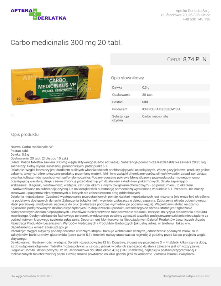 Skład: Każda tabletka zawiera 300 mg węgla aktywnego (Carbo activatus). Substancja pomocnicza Każda tabletka zawiera 283,5 mg