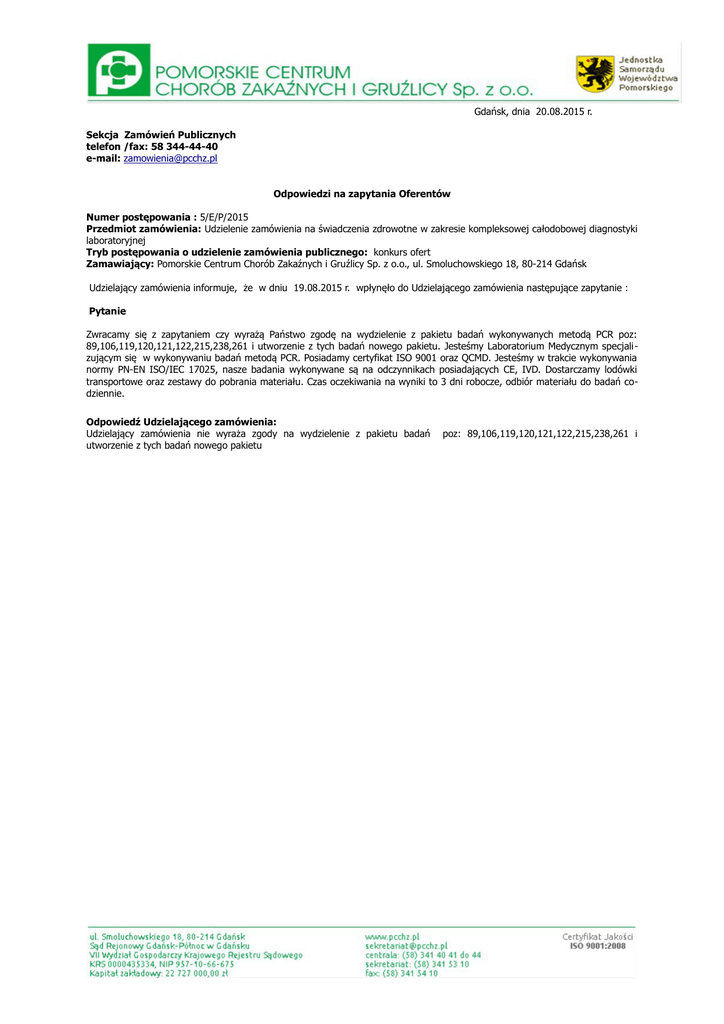 Gdańsk, dnia 20.08.2015 r. Sekcja Zamówień Publicznych telefon /fax: 58 344-44-40 e-mail: [email protected] Odpowiedzi na zapytania Oferentów Numer postępowania : 5/E/P/2015 Przedmiot zamówienia: Udzielenie zamówienia na świadczenia zdrowotne w zakresie kompleksowej całodobowej diagnostyki laboratoryjnej Tryb postępowania o udzielenie zamówienia publicznego: konkurs ofert Zamawiający: Pomorskie Centrum Chorób Zakaźnych i Gruźlicy Sp. z o.o., ul. Smoluchowskiego 18, 80-214 Gdańsk Udzielający zamówienia informuje, że w dniu 19.08.2015 r. wpłynęło do Udzielającego zamówienia następujące zapytanie : Pytanie Zwracamy się z zapytaniem czy wyrażą Państwo zgodę na wydzielenie z pakietu badań wykonywanych metodą PCR poz: 89,106,119,120,121,122,215,238,261 i utworzenie z tych badań nowego pakietu. Jesteśmy Laboratorium Medycznym specjalizującym się w wykonywaniu badań metodą PCR. Posiadamy certyfikat ISO 9001 oraz QCMD. Jesteśmy w trakcie wykonywania normy PN-EN ISO/IEC 17025, nasze badania wykonywane są na odczynnikach posiadających CE, IVD. Dostarczamy lodówki transportowe oraz zestawy do pobrania materiału. Czas oczekiwania na wyniki to 3 dni robocze, odbiór materiału do badań codziennie. Odpowiedź Udzielającego zamówienia: Udzielający zamówienia nie wyraża zgody na wydzielenie z pakietu badań utworzenie z tych badań nowego pakietu poz: 89,106,119,120,121,122,215,238,261 i