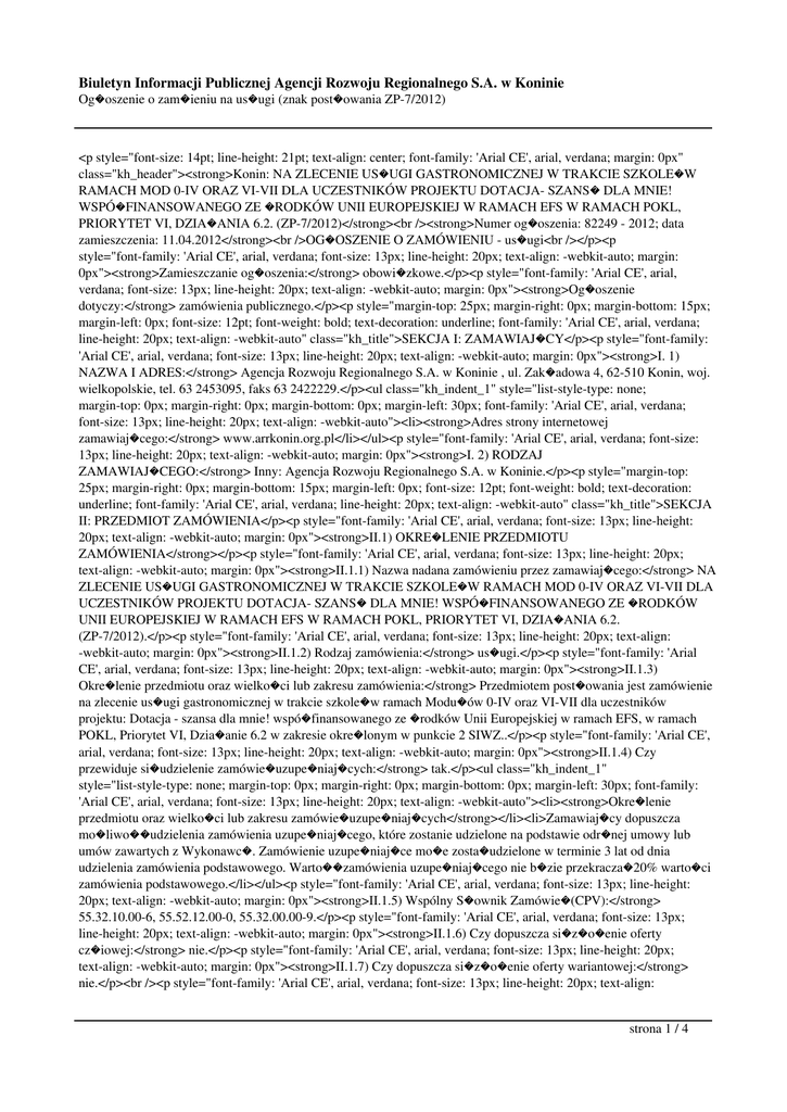 Biuletyn Informacji Publicznej Agencji Rozwoju Regionalnego S.A. w Koninie Og�oszenie o zam�ieniu na us�ugi (znak post�owania ZP-7/2012) <p style="font-size: 14pt; line-height: 21pt; text-align: center; font-family: 'Arial CE', arial, verdana; margin: 0px" class="kh_header"><strong>Konin: NA ZLECENIE US�UGI GASTRONOMICZNEJ W TRAKCIE SZKOLE�W RAMACH MOD 0-IV ORAZ VI-VII DLA UCZESTNIKÓW PROJEKTU DOTACJA- SZANS� DLA MNIE! WSPÓ�FINANSOWANEGO ZE �RODKÓW UNII EUROPEJSKIEJ W RAMACH EFS W RAMACH POKL, PRIORYTET VI, DZIA�ANIA 6.2. (ZP-7/2012)</strong><br /><strong>Numer og�oszenia: 82249 - 2012; data zamieszczenia: 11.04.2012</strong><br />OG�OSZENIE O ZAMÓWIENIU - us�ugi<br /></p><p style="font-family: 'Arial CE', arial, verdana; font-size: 13px; line-height: 20px; text-align: -webkit-auto; margin: 0px"><strong>Zamieszczanie og�oszenia:</strong> obowi�zkowe.</p><p style="font-family: 'Arial CE', arial, verdana; font-size: 13px; line-height: 20px; text-align: -webkit-auto; margin: 0px"><strong>Og�oszenie dotyczy:</strong> zamówienia publicznego.</p><p style="margin-top: 25px; margin-right: 0px; margin-bottom: 15px; margin-left: 0px; font-size: 12pt; font-weight: bold; text-decoration: underline; font-family: 'Arial CE', arial, verdana; line-height: 20px; text-align: -webkit-auto" class="kh_title">SEKCJA I: ZAMAWIAJ�CY</p><p style="font-family: 'Arial CE', arial, verdana; font-size: 13px; line-height: 20px; text-align: -webkit-auto; margin: 0px"><strong>I. 1) NAZWA I ADRES:</strong> Agencja Rozwoju Regionalnego S.A. w Koninie , ul. Zak�adowa 4, 62-510 Konin, woj. wielkopolskie, tel. 63 2453095, faks 63 2422229.</p><ul class="kh_indent_1" style="list-style-type: none; margin-top: 0px; margin-right: 0px; margin-bottom: 0px; margin-left: 30px; font-family: 'Arial CE', arial, verdana; font-size: 13px; line-height: 20px; text-align: -webkit-auto"><li><strong>Adres strony internetowej zamawiaj�cego:</strong> www.arrkonin.org.pl</li></ul><p style="font-family: 'Arial CE', arial, verdana; font-size: 13px; line-height: 20px; text-align: -webkit-auto; margin: 0px"><strong>I. 2) RODZAJ ZAMAWIAJ�CEGO:</strong> Inny: Agencja Rozwoju Regionalnego S.A. w Koninie.</p><p style="margin-top: 25px; margin-right: 0px; margin-bottom: 15px; margin-left: 0px; font-size: 12pt; font-weight: bold; text-decoration: underline; font-family: 'Arial CE', arial, verdana; line-height: 20px; text-align: -webkit-auto" class="kh_title">SEKCJA II: PRZEDMIOT ZAMÓWIENIA</p><p style="font-family: 'Arial CE', arial, verdana; font-size: 13px; line-height: 20px; text-align: -webkit-auto; margin: 0px"><strong>II.1) OKRE�LENIE PRZEDMIOTU ZAMÓWIENIA</strong></p><p style="font-family: 'Arial CE', arial, verdana; font-size: 13px; line-height: 20px; text-align: -webkit-auto; margin: 0px"><strong>II.1.1) Nazwa nadana zamówieniu przez zamawiaj�cego:</strong> NA ZLECENIE US�UGI GASTRONOMICZNEJ W TRAKCIE SZKOLE�W RAMACH MOD 0-IV ORAZ VI-VII DLA UCZESTNIKÓW PROJEKTU DOTACJA- SZANS� DLA MNIE! WSPÓ�FINANSOWANEGO ZE �RODKÓW UNII EUROPEJSKIEJ W RAMACH EFS W RAMACH POKL, PRIORYTET VI, DZIA�ANIA 6.2. (ZP-7/2012).</p><p style="font-family: 'Arial CE', arial, verdana; font-size: 13px; line-height: 20px; text-align: -webkit-auto; margin: 0px"><strong>II.1.2) Rodzaj zamówienia:</strong> us�ugi.</p><p style="font-family: 'Arial CE', arial, verdana; font-size: 13px; line-height: 20px; text-align: -webkit-auto; margin: 0px"><strong>II.1.3) Okre�lenie przedmiotu oraz wielko�ci lub zakresu zamówienia:</strong> Przedmiotem post�owania jest zamówienie na zlecenie us�ugi gastronomicznej w trakcie szkole�w ramach Modu�ów 0-IV oraz VI-VII dla uczestników projektu: Dotacja - szansa dla mnie! wspó�finansowanego ze �rodków Unii Europejskiej w ramach EFS, w ramach POKL, Priorytet VI, Dzia�anie 6.2 w zakresie okre�lonym w punkcie 2 SIWZ..</p><p style="font-family: 'Arial CE', arial, verdana; font-size: 13px; line-height: 20px; text-align: -webkit-auto; margin: 0px"><strong>II.1.4) Czy przewiduje si�udzielenie zamówie�uzupe�niaj�cych:</strong> tak.</p><ul class="kh_indent_1" style="list-style-type: none; margin-top: 0px; margin-right: 0px; margin-bottom: 0px; margin-left: 30px; font-family: 'Arial CE', arial, verdana; font-size: 13px; line-height: 20px; text-align: -webkit-auto"><li><strong>Okre�lenie przedmiotu oraz wielko�ci lub zakresu zamówie�uzupe�niaj�cych</strong></li><li>Zamawiaj�cy dopuszcza mo�liwo��udzielenia zamówienia uzupe�niaj�cego, które zostanie udzielone na podstawie odr�nej umowy lub umów zawartych z Wykonawc�. Zamówienie uzupe�niaj�ce mo�e zosta�udzielone w terminie 3 lat od dnia udzielenia zamówienia podstawowego. Warto��zamówienia uzupe�niaj�cego nie b�zie przekracza�20% warto�ci zamówienia podstawowego.</li></ul><p style="font-family: 'Arial CE', arial, verdana; font-size: 13px; line-height: 20px; text-align: -webkit-auto; margin: 0px"><strong>II.1.5) Wspólny S�ownik Zamówie�(CPV):</strong> 55.32.10.00-6, 55.52.12.00-0, 55.32.00.00-9.</p><p style="font-family: 'Arial CE', arial, verdana; font-size: 13px; line-height: 20px; text-align: -webkit-auto; margin: 0px"><strong>II.1.6) Czy dopuszcza si�z�o�enie oferty cz�iowej:</strong> nie.</p><p style="font-family: 'Arial CE', arial, verdana; font-size: 13px; line-height: 20px; text-align: -webkit-auto; margin: 0px"><strong>II.1.7) Czy dopuszcza si�z�o�enie oferty wariantowej:</strong> nie.</p><br /><p style="font-family: 'Arial CE', arial, verdana; font-size: 13px; line-height: 20px; text-align: strona 1 / 4 Biuletyn Informacji Publicznej Agencji Rozwoju Regionalnego S.A. w Koninie Og�oszenie o zam�ieniu na us�ugi (znak post�owania ZP-7/2012) -webkit-auto; margin: 0px"><strong>II.2) CZAS TRWANIA ZAMÓWIENIA LUB TERMIN WYKONANIA:</strong> Zako�zenie: 28.02.2013.</p><p style="margin-top: 25px; margin-right: 0px; margin-botto
