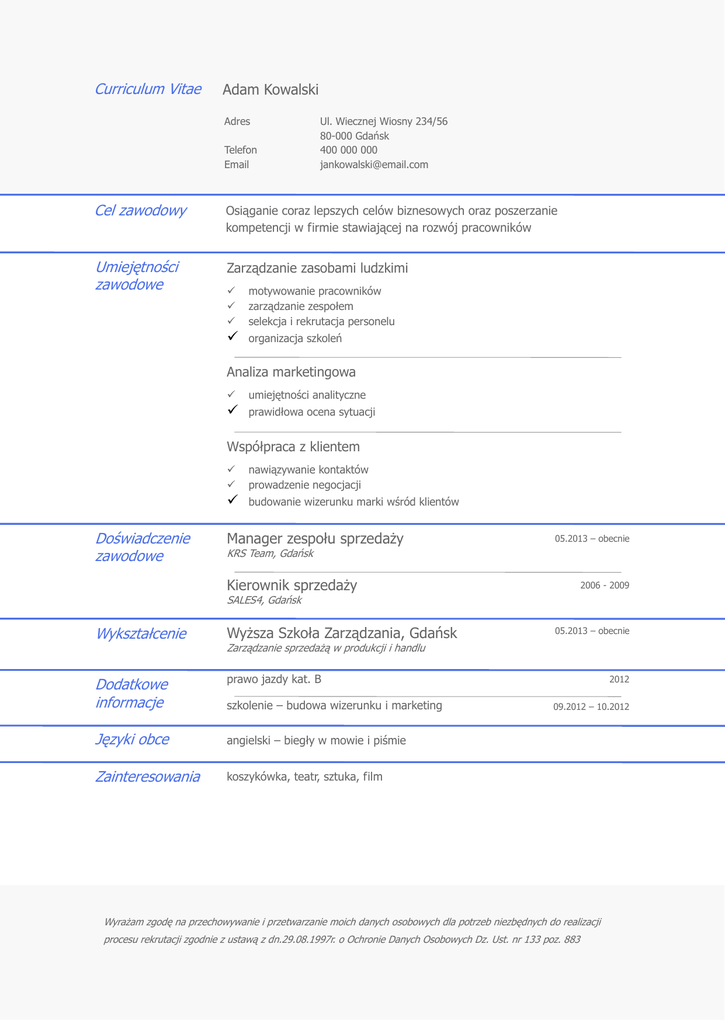Curriculum Vitae Adam Kowalski Adres Telefon Email Ul. Wiecznej Wiosny 234/56 80-000 Gdańsk 400 000 000 [email protected] Cel zawodowy Osiąganie coraz lepszych celów biznesowych oraz poszerzanie kompetencji w firmie stawiającej na rozwój pracowników Umiejętności zawodowe Zarządzanie zasobami ludzkimi motywowanie pracowników zarządzanie zespołem selekcja i rekrutacja personelu organizacja szkoleń Analiza marketingowa umiejętności analityczne prawidłowa ocena sytuacji Współpraca z klientem Doświadczenie zawodowe nawiązywanie kontaktów prowadzenie negocjacji budowanie wizerunku marki wśród klientów Manager zespołu sprzedaży 05.2013 – obecnie KRS Team, Gdańsk Kierownik sprzedaży 2006 - 2009 SALES4, Gdańsk Wykształcenie Wyższa Szkoła Zarządzania, Gdańsk Dodatkowe informacje prawo jazdy kat. B Języki obce angielski – biegły w mowie i piśmie Zainteresowania koszykówka, teatr, sztuka, film 05.2013 – obecnie Zarządzanie sprzedażą w produkcji i handlu szkolenie – budowa wizerunku i marketing 2012 09.2012 – 10.2012 Wyrażam zgodę na przechowywanie i przetwarzanie moich danych osobowych dla potrzeb niezbędnych do realizacji procesu rekrutacji zgodnie z ustawą z dn.29.08.1997r. o Ochronie Danych Osobowych Dz. Ust. nr 133 poz. 883