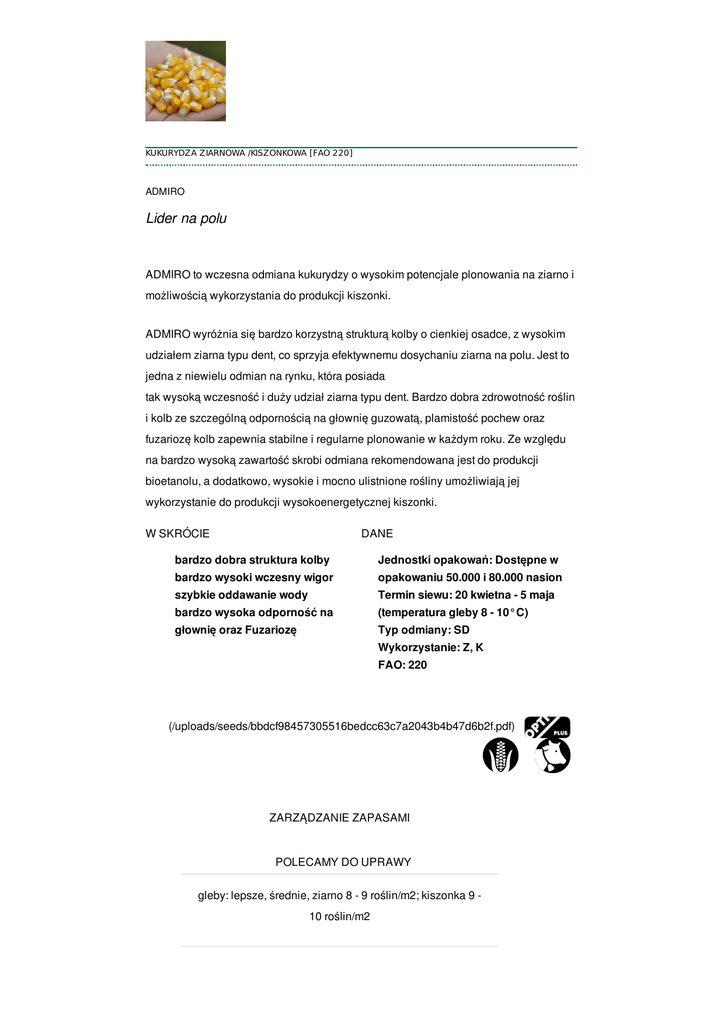 KUKURYDZA ZIARNOWA /KISZONKOWA [FAO 220] ADMIRO Lider na polu ADMIRO to wczesna odmiana kukurydzy o wysokim potencjale plonowania na ziarno i możliwością wykorzystania do produkcji kiszonki. ADMIRO wyróżnia się bardzo korzystną strukturą kolby o cienkiej osadce, z wysokim udziałem ziarna typu dent, co sprzyja efektywnemu dosychaniu ziarna na polu. Jest to jedna z niewielu odmian na rynku, która posiada tak wysoką wczesność i duży udział ziarna typu dent. Bardzo dobra zdrowotność roślin i kolb ze szczególną odpornością na głownię guzowatą, plamistość pochew oraz fuzariozę kolb zapewnia stabilne i regularne plonowanie w każdym roku. Ze względu na bardzo wysoką zawartość skrobi odmiana rekomendowana jest do produkcji bioetanolu, a dodatkowo, wysokie i mocno ulistnione rośliny umożliwiają jej wykorzystanie do produkcji wysokoenergetycznej kiszonki. W SKRÓCIE DANE bardzo dobra struktura kolby Jednostki opakowań: Dostępne w bardzo wysoki wczesny wigor opakowaniu 50.000 i 80.000 nasion szybkie oddawanie wody Termin siewu: 20 kwietna - 5 maja bardzo wysoka odporność na (temperatura gleby 8 - 10°C) głownię oraz Fuzariozę Typ odmiany: SD Wykorzystanie: Z, K FAO: 220 (/uploads/seeds/bbdcf98457305516bedcc63c7a2043b4b47d6b2f.pdf) ZARZĄDZANIE ZAPASAMI POLECAMY DO UPRAWY gleby: lepsze, średnie, ziarno 8 - 9 roślin/m2; kiszonka 9 10 roślin/m2