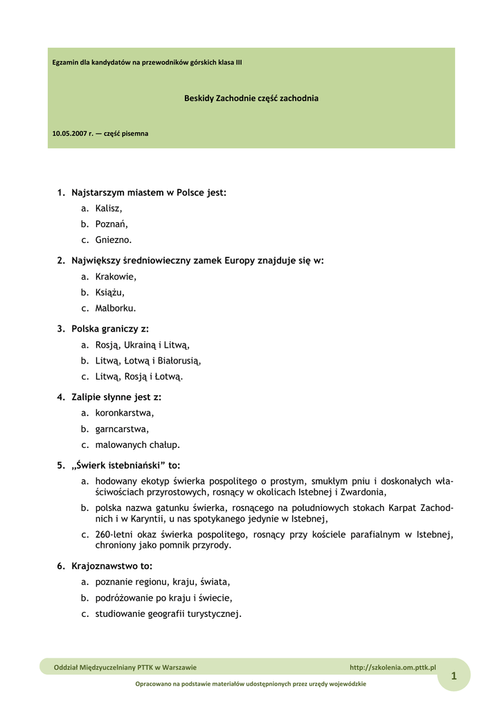 Egzamin dla kandydatów na przewodników górskich klasa III Beskidy Zachodnie część zachodnia 10.05.2007 r. — część pisemna 1. Najstarszym miastem w Polsce jest: a. Kalisz, b. Poznań, c. Gniezno. 2. Największy średniowieczny zamek Europy znajduje się w: a. Krakowie, b. Książu, c. Malborku. 3. Polska graniczy z: a. Rosją, Ukrainą i Litwą, b. Litwą, Łotwą i Białorusią, c. Litwą, Rosją i Łotwą. 4. Zalipie słynne jest z: a. koronkarstwa, b. garncarstwa, c. malowanych chałup. 5. „Świerk istebniański” to: a. hodowany ekotyp świerka pospolitego o prostym, smukłym pniu i doskonałych właściwościach przyrostowych, rosnący w okolicach Istebnej i Zwardonia, b. polska nazwa gatunku świerka, rosnącego na południowych stokach Karpat Zachodnich i w Karyntii, u nas spotykanego jedynie w Istebnej, c. 260-letni okaz świerka pospolitego, rosnący przy kościele parafialnym w Istebnej, chroniony jako pomnik przyrody. 6. Krajoznawstwo to: a. poznanie regionu, kraju, świata, b. podróżowanie po kraju i świecie, c. studiowanie geografii turystycznej. Oddział Międzyuczelniany PTTK w Warszawie http://szkolenia.om.pttk.pl Opracowano na podstawie materiałów udostępnionych przez urzędy wojewódzkie 1 10.05.2007 Egzamin dla kandydatów na przewodników górskich klasa III — Beskidy Zachodnie część zachodnia 7. Prowadzący grupę przewodnik idzie: a. na czele grupy, b. w środku grupy, c. na końcu grupy. 8. Górskie przejścia drogowe między Polską i Słowacją to: a. Górna Leszna, Gołkowice, Rudyszwałd, b. Muszyna, Jaworki, Niedzica, c. Barwinek, Konieczna, Przełęcz Glinne. 9. Miejscowości leżące na Orawie to: a. Spytkowice, Pieniążkowice, Chyżne, b. Harkabuz, Podszkle, Podwilk, c. Chabówka, Podsamie, Lasek. 10. Sztuczne zbiorniki wodne beskidzkie obejrzeć można w: a. Tresnej, Solinie, Goczałkowicach, b. Otmuchowie, Myczkowcach, Wiśle, c. Wiśle, Rożnowie, Tresnej. 11. Najwyższą formą ochrony przyrody w Polsce jest: a. park narodowy, b. park krajobrazowy, c. zespół przyrodniczo-krajobrazowy. 12. Autorem polichromii kościoła pw. Dobrego Pasterza w Istebnej jest: a. Ludwik Konarzewski junior, b. Jan Wałach, c. Czesław Kuryatto. 13. Pierwszy w języku polskim opis wyprawy do źródeł Wisły, wymieniając prowadzącego go przewodnika Jakuba Szarca, podał: a. Leopold Szersznik, b. Wincenty Pol, c. Apoloniusz Tomkowicz. 14. Jeżeli w górach zobaczysz nisko lecący śmigłowiec i nic będziesz potrzebował pomocy to: a. pomachasz mu ręką, b. przyjmiesz pozycję uniesionej prawej ręki w górę, a lewej opuszczonej w dół tworząc linię ukośną na znak litery „N”, co oznacza w międzynarodowym kodzie, „no” — nie potrzebuję pomocy, c. rzucisz w górę białą chustkę. 2 http://szkolenia.om.pttk.pl Oddział Międzyuczelniany PTTK w Warszawie Opracowano na podstawie materiałów udostępnionych przez urzędy wojewódzkie Egzamin dla kandydatów na przewodników górskich klasa III — Beskidy Zachodnie część zachodnia 10.05.2007 15. Dobra aklimatyzacja zależy od: a. stopniowania wysokości nad poziomem morza i indywidualnych cech człowieka, b. szybkiego zdobywania wysokości, c. wychodzenia w góry tylko przy dobrej pogodzie. 16. Miasto Bielsko-Biała powstało z połączenia Bielska i Białej w roku: a. 1949, b. 1951, c. 1953. 17. Najwybitniejszym księciem cieszyńskim, budowniczym gotyckiego zamku w Cieszynie, był: a. Przemko I Noszak, b. Przemko II Cieszyński, c. Adam Wacław. 18. Kaskady Rodła to: a. wychodnie skalne, b. ujęcie wody mineralnej, c. wodospady. 19. Stawki w masywie Babiej Góry są pochodzenia: a. krasowego, b. polodowcowcgo, c. osuwiskowego. 20. Żętyca (żentyca) to: a. napój z odtłuszczonego i sfermentowanego mleka owczego, b. serwatka owcza — produkt uboczny otrzymywany przy produkcji sera owczego, c. świeży, rzadki, jeszcze nie odciśnięty ser owczy. 21. Wałasi (Wołosi) to ogólna nazwa: a. grup ludności, która doprowadziła do kolonizacji terenów górskich, b. ludu pochodzenia cygańskiego, c. mieszkańców Gospodarstwa Wołoskiego — historycznej krainy na Bałkanach, zwanej też popularnie Wołoszczyzną. 22. Zabytkowy drewniany kościół na Orawie, z bogatą polichromią, znajduje się w: a. Zubrzycy Dolnej, b. Orawce, c. Lipnicy Wielkiej. Oddział Międzyuczelniany PTTK w Warszawie http://szkolenia.om.pttk.pl.pl Opracowano na podstawie materiałów udostępnionych przez urzędy wojewódzkie 3 10.05.2007 Egzamin dla kandydatów na przewodników górskich klasa III — Beskidy Zachodnie część zachodnia 23. Granice Polski, Czech i Słowacji zbiegają się w rejonie: a. Koniakowa, b. Istebnej, c. Jaworzynki. 24. Kolej linowo-terenowa wiedzie na szczyt: a. Żaru, b. Mosornego Groma, c. Szyndzielni. 25. Ostrzysz, Przysłopski Wierch i Kotoń to nazwy wzniesień w: a. Paśmie Jałowieckim w Beskidzie Żywieckim, b. Paśmie Koskowej Góry w Beskidzie Makowskim, c. grupie Łamanej Skały w Beskidzie Małym. 26. Łodygowice, Twardorzeczka i Leśna to miejscowości leżące w (na): a. Beskidzie Makowskim, b. Pogórzu Śląskim, c. Kotlinie Żywieckiej. 27. Kolej linowa krzesełkowa nie prowadzi na szczyt: a. Skrzyczne, b. Rachowiec, c. Czantoria. 28. Droga ze Straconki do Międzybrodzia Bialskiego biegnie przez przełęcz: a. U Panienki, b. Kocierską, c. Przegibek. 29. Karczma „Rzym” znajduje się w: a. Suchej Beskidzkiej, b. Makowie Podhalańskim, c. Zawoi Centrum. 30. Kazimierz Sosnowski i Władysław Krygowski byli autorami przewodników turystycznych po: a. Pieninach, b. Orawie i Spiszu, c. Beskidach. 4 http://szkolenia.om.pttk.pl Oddział Międzyuczelniany PTTK w Warszawie Opracowano na podstawie materiałów udostępnionych przez urzędy wojewódzkie