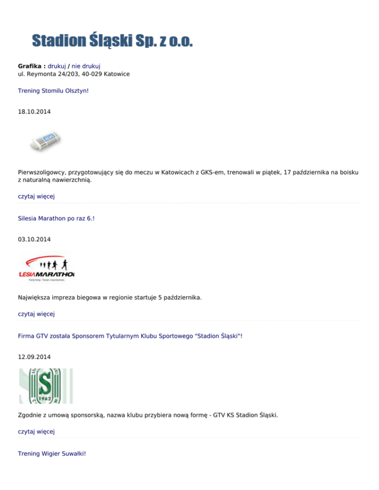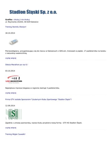 Grafika : drukuj / nie drukuj ul. Reymonta 24/203, 40-029 Katowice Trening Stomilu Olsztyn! 18.10.2014 Pierwszoligowcy, przygotowujący się do meczu w Katowicach z GKS-em, trenowali w piątek, 17 października na boisku z naturalną nawierzchnią. czytaj więcej Silesia Marathon po raz 6.! 03.10.2014 Największa impreza biegowa w regionie startuje 5 października. czytaj więcej Firma GTV została Sponsorem Tytularnym Klubu Sportowego "Stadion Śląski"! 12.09.2014 Zgodnie z umową sponsorską, nazwa klubu przybiera nową formę - GTV KS Stadion Śląski. czytaj więcej Trening Wigier Suwałki! 05.09.2014 Pierwszoligowcy, przygotowujący się do meczu w Katowicach z GKS-em, trenowali na boisku z naturalną nawierzchnią. czytaj więcej Trening Lecha Poznań! 24.08.2014 Boisko treningowe Stadionu Śląskiego miejscem przygotowań do meczu z Ruchem Chorzów. czytaj więcej Trening Jagiellonii Białystok! 07.08.2014 Podopieczni Michała Probierza gościli na boisku treningowym przed meczem ekstraklasy piłkarskiej z Górnikiem Zabrze. czytaj więcej Euzebiusz Smolarek zakończył karierę! 28.07.2014 Wejdź do naszej galerii video i zobacz jak "Ebi" zdobywał bramki dla reprezentacji Polski w meczach eliminacyjnych ME z Portugalią i Belgią na Stadionie Śląskim! czytaj więcej Gratulujemy piłkarzom Nadwiślana Góra awansu do II ligi! 29.06.2014 Podopieczni Adama Noconia wygrali finałową rywalizację w barażach z Sokołem Ostróda. Zespół Nadwiślana do rundy wiosennej przygotowywał się na obiektach treningowych Stadionu Śląskiego. czytaj więcej Medale dla najlepszych w II Mistrzostwach Śląska w speedmintonie już czekają! 19.06.2014 Turniej w ramach ogólnopolskiego cyklu Grand Prix Speedminton®STARS Poland 2014 rusza w sobotę, 21 czerwca o godz. 10.00. Biuro zawodów czynne od 9.00! czytaj więcej Jeszcze przyjmujemy zapisy na II Mistrzostwa Śląska w speedmintonie! 17.06.2014 Termin zapisów mija o północy, zawody rozpoczynają się w sobotę, 21 czerwca o godz. 9.00! czytaj więcej 1 2 3 4 5 6 7 8 9 10 > Ostatnia »