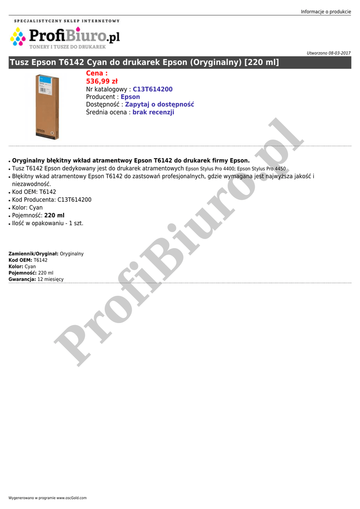Informacje o produkcie Utworzono 08-03-2017 Tusz Epson T6142 Cyan do drukarek Epson (Oryginalny) [220 ml] Cena : 536,99 zł ● ● ● ● ● ● Oryginalny błękitny wkład atramentwoy Epson T6142 do drukarek firmy Epson. Tusz T6142 Epson dedykowany jest do drukarek atramentowych Epson Stylus Pro 4400; Epson Stylus Pro 4450 Błękitny wkad atramentowy Epson T6142 do zastsowań profesjonalnych, gdzie wymagana jest najwyższa jakość i niezawodność. Kod OEM: T6142 Kod Producenta: C13T614200 Kolor: Cyan Pojemność: 220 ml Ilość w opakowaniu - 1 szt. Pr of Zamiennik/Oryginał: Oryginalny Kod OEM: T6142 Kolor: Cyan Pojemność: 220 ml Gwarancja: 12 miesięcy iu r ● iB ● o. pl Nr katalogowy : C13T614200 Producent : Epson Dostępność : Zapytaj o dostępność Średnia ocena : brak recenzji Wygenerowano w programie www.oscGold.com