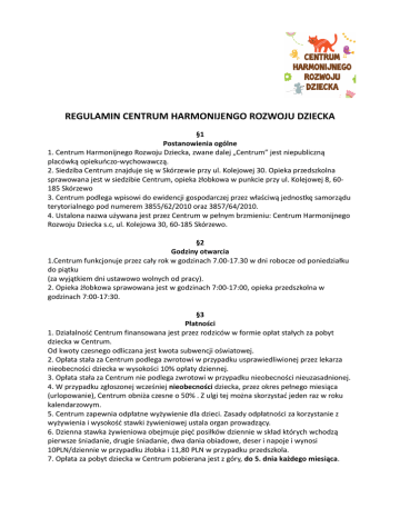 REGULAMIN CENTRUM HARMONIJENGO ROZWOJU DZIECKA §1 Postanowienia ogólne 1. Centrum Harmonijnego Rozwoju Dziecka, zwane dalej „Centrum” jest niepubliczną placówką opiekuńczo-wychowawczą. 2. Siedziba Centrum znajduje się w Skórzewie przy ul. Kolejowej 30. Opieka przedszkolna sprawowana jest w siedzibie Centrum, opieka żłobkowa w punkcie przy ul. Kolejowej 8, 60185 Skórzewo 3. Centrum podlega wpisowi do ewidencji gospodarczej przez właściwą jednostkę samorządu terytorialnego pod numerem 3855/62/2010 oraz 3857/64/2010. 4. Ustalona nazwa używana jest przez Centrum w pełnym brzmieniu: Centrum Harmonijnego Rozwoju Dziecka s.c, ul. Kolejowa 30, 60-185 Skórzewo. §2 Godziny otwarcia 1.Centrum funkcjonuje przez cały rok w godzinach 7.00-17.30 w dni robocze od poniedziałku do piątku (za wyjątkiem dni ustawowo wolnych od pracy). 2. Opieka żłobkowa sprawowana jest w godzinach 7:00-17:00, opieka przedszkolna w godzinach 7:00-17:30. §3 Płatności 1. Działalność Centrum finansowana jest przez rodziców w formie opłat stałych za pobyt dziecka w Centrum. Od kwoty czesnego odliczana jest kwota subwencji oświatowej. 2. Opłata stała za Centrum podlega zwrotowi w przypadku usprawiedliwionej przez lekarza nieobecności dziecka w wysokości 10% opłaty dziennej. 3. Opłata stała za Centrum nie podlega zwrotowi w przypadku nieobecności nieuzasadnionej. 4. W przypadku zgłoszonej wcześniej nieobecności dziecka, przez okres pełnego miesiąca (urlopowanie), Centrum obniża czesne o 50% . Z ulgi tej można skorzystać jeden raz w roku kalendarzowym. 5. Centrum zapewnia odpłatne wyżywienie dla dzieci. Zasady odpłatności za korzystanie z wyżywienia i wysokość stawki żywieniowej ustala organ prowadzący. 6. Dzienna stawka żywieniowa obejmuje pięć posiłków dziennie w skład których wchodzą pierwsze śniadanie, drugie śniadanie, dwa dania obiadowe, deser i napoje i wynosi 10PLN/dziennie w przypadku żłobka i 11,80 PLN w przypadku przedszkola. 7. Opłata za pobyt dziecka w Centrum pobierana jest z góry, do 5. dnia każdego miesiąca. 8. Pierwsza opłata za wyżywienie dziecka w Centrum pobierana jest z góry. Następne miesiące rozliczane są z dołu. 9. Ostatniego miesiąca pobytu dziecka w Centrum rozliczana jest nadpłata pobrana w pierwszym miesiącu pobytu w przedszkolu/żłobku. 10. Opłata za wyżywienie jest to kwota stawki żywieniowej pomnożona przez ilość dni obecności dziecka w Centrum. W przypadku zgłoszenia nieobecności dziecka w danym dniu zgodnie z pkt 3 ust. 13 Regulaminu, opłata żywieniowa za dany dzień ulega zwrotowi w kolejnym miesiącu rozliczeniowym, do 5 dnia tego miesiąca. 11. Centrum ma prawo do naliczania maksymalnych odsetek umownych za każdy dzień opóźnienia w regulowaniu opłat począwszy od 6go dnia każdego miesiąca. 12. Przy zapisywaniu dziecka do Centrum obowiązuje opłata wpisowa 390PLN (trzysta dziewięćdziesiąt złotych), która zawiera ubezpieczenie NNW roczne dziecka, przygotowanie wyprawki dla dziecka (w tym wyprawki plastycznej) dla przedszkola, natomiast dla żłobka przygotowanie pościeli, nocnika oraz zestawu higienicznego. Wpłata wpisowego i złożenie wypełnionej Karty Zgłoszenia Dziecka są równoznaczne z zarezerwowaniem miejsca w Centrum. 13. Wpisowe ma charakter bezzwrotny, za wyjątkiem sytuacji, gdy Rodzic/Opiekun rozwiązał umowę z przyczyn leżących po stronie Centrum 14. Przy zapisywaniu drugiego dziecka przysługuje zniżka w wysokości 10% kwoty czesnego (punkt ten obowiązuje dla rodzeństwa zapisanego od 01.09.13r.). 15. Nieobecności należy zgłaszać najpóźniej do godz. 8:00 danego dnia (SMSowo, mailowo lub telefonicznie), w przeciwnym razie może być pobierana opłata za wyżywienie jak za dzień obecności. 16. Jeśli odbiór dziecka nastąpi po godzinie 17:30 dziecka zapisanego do przedszkola, lub po godzinie 17:00 dziecka zapisanego do żłobka, naliczana jest opłata 50 zł od każdej rozpoczętej godziny spóźnienia. 17. W przypadku nieuregulowania opłat w terminie, po dwukrotnym upomnieniu pisemnym sprawa uregulowania zostanie skierowana na drogę sądową §4 1. Centrum zapewnia świadczenia w zakresie realizacji części podstawy programowej wychowania przedszkolnego, określonej przez Ministra Edukacji Narodowej, w wymiarze trzech godzin dziennie. 2. Centrum realizuje program wychowania przedszkolnego uzgodniony, razem z rodzicami, na spotkaniu przed rozpoczęciem roku szkolnego. 3. Dzieci, w ramach opłaty stałej, mogą uczestniczyć także w części zajęć dodatkowych, odbywających się w Centrum. 4. Organizacja i terminy zajęć dodatkowych ustalane są przez organ prowadzący, a czas ich trwania dostosowany jest do możliwości rozwojowych dzieci. 5. Część zajęć dodatkowych jest dodatkowo płatna, dla chętnych. §5 Cele i zadania 1. Centrum realizuje cele i zadania określone w podstawie programowej wychowania przedszkolnego, poprzez: - wspomaganie indywidualnego rozwoju dziecka zgodnie z jego wrodzonym potencjałem i możliwościami rozwojowymi, - sprawowanie opieki nad dziećmi odpowiednio do ich potrzeb oraz możliwości Centrum, - współdziałanie z rodziną poprzez wspomaganie rodziny w wychowywaniu dzieci i przygotowanie ich do nauki szkolnej. 2. Wynikające z powyższych celów zadania Centrum realizuje w ramach następujących obszarów edukacyjnych: - zapewnienie opieki i wspomaganie rozwoju dziecka w przyjaznym, bezpiecznym i zdrowym środowisku, - uwzględnianie indywidualnych potrzeb dziecka, troska o zapewnienie równych szans, umacnianie wiary we własne siły i możliwości osiągania sukcesu, - stwarzanie warunków do rozwijania samodzielności, dążenie do osiągania celów, podejmowania odpowiedzialności za siebie i za najbliższe otoczenie, - rozwijanie wrażliwości moralnej, - kształtowanie umiejętności obserwacji, ułatwianie rozumienia zjawisk zachodzących w dostępnym doświadczeniu dziecka, otoczeniu przyrodniczym, 
