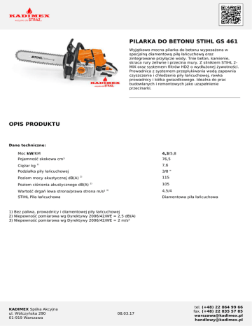 PILARKA DO BETONU STIHL GS 461 Wyjątkowo mocna pilarka do betonu wyposażona w specjalną diamentową piłę łańcuchową oraz zintegrowane przyłącze wody. Tnie beton, kamienie, skraca rury żeliwne i przecina mury. Z silnikiem STIHL 2MIX oraz systemem filtrów HD2 o wydłużonej żywotności. Prowadnica z systemem przepłukiwania wodą zapewnia czyszczenie i chłodzenie piły łańcuchowej, rowka prowadnicy i kółka gwiazdkowego. Idealna do prac budowlanych i remontowych jako uzupełnienie przecinarki. OPIS PRODUKTU Dane techniczne: Moc kW/KM 4,3/5,8 Pojemność skokowa cm³ 76,5 Ciężar kg 7,6 1) Podziałka piły łańcuchowej Poziom mocy akustycznej dB(A) 3/8 " 115 2) Poziom ciśnienia akustycznego dB(A) 105 2) Wartość drgań lewa strona/prawa strona m/s² 4,5/4 3) STIHL Piła łańcuchowa Diamentowa piła łańcuchowa 1) Bez paliwa, prowadnicy i diamentowej piły łańcuchowej 2) Niepewność pomiarowa wg Dyrektywy 2006/42/WE = 2,5 dB(A) 3) Niepewność pomiarowa wg Dyrektywy 2006/42/WE = 2 m/s² KADIMEX Spóka Akcyjna ul. Wólczyńska 290 01-919 Warszawa 08.03.17 tel. (+48) 22 864 99 66 fax. (+48) 22 835 57 85 [email protected] [email protected] Wyposażenie: • Diamentowa piła łańcuchowa 36 GBM - piła łańcuchowa STIHL do cięcia na mokro posiada diamentowe segmenty ostrzone fabrycznie, dzięki czemu już przy pierwszym cięciu jest w pełni wydajna. Piła łańcuchowa STIHL na każdym ogniwie posiada jeden diamentowy segment umożliwiający szybkie cięcie. Konstrukcja piły z ogniwem prowadzącym gwarantuje spokojną pracę przy niskim poziomie wibracji. • Prowadnica Rollomatic G - prowadnica Rollomatic G z systemem przepłukiwania wodą. Dzięki temu piła łańcuchowa, rowek prowadnicy i kółko gwiazdkowe są płukane i chłodzone. Zwiększa to żywotność prowadnicy i piły łańcuchowej oraz zapewnia ochronę użytkownika przed zapyleniem. Ponadto prowadnica wyposażona jest w dodatkowy otwór do napinania i hartowaną bieżnię prowadnicy. • Przyłącze wody - przyłącze wody znajduje się bezpośrednio na urządzeniu. Umożliwia to bardzo łatwe doprowadzenie wody. Woda jest wykorzystywana do płukania i wiązania pyłu oraz smarowania i chłodzenia prowadnicy i piły łańcuchowej. • Pokrywa koła napędowego - optymalne wyprowadzenie wody na elementy tnące umieszczone na pokrywie koła napędowego. Woda skierowana na koło napędowe i selektywnie wprowadzana z powrotem do szczeliny, zapewnia minimalne straty wody. • Osłona gumowa - specjalna konstrukcja osłony chroni skrzynię korbową przed uszkodzeniami. Dodatkowo pełni również funkcję ogranicznika podczas wcinania. • Silnik STIHL 2-MIX - w pilarce do betonu STIHL GS 461 zastosowano specjalny silnik 2-MIX skonstruowany z zastosowaniem nowoczesnej technologii kanałowej 1-w-4 o niskim zużyciu paliwa – powodującej do 20 % mniejsze zużycie paliwa w porównaniu do dwusuwowych modeli o tej samej mocy bez technologii 2-MIX. Zapewnia wysoki moment obrotowy w szerokim zakresie obrotów. • System antywibracyjny - mocne wibracje przenoszone przez uchwyty urządzeń mechanicznych mogą prowadzić do choroby wibracyjnej. Z tego powodu STIHL stworzył system antywibracyjny. W urządzeniach mechanicznych wyposażonych w system AV strefy uchwytów znacznie redukują liczbę drgań wytwarzanych przez silnik spalinowy i pracujące narzędzie. • Zawór dekompresyjny - zawór dekompresyjny pozwala podczas uruchamiania usunąć z cylindra część sprężonej mieszanki. Umożliwia to znaczną redukcję siły potrzebnej do pociągnięcia za linkę rozrusznika, odciążenie osoby obsługującej urządzenie i ochronę całego systemu rozruchu urządzenia. • System filtrów powietrza o długiej żywotności - system filtrów powietrza o długiej żywotności ze wstępnym filtrem cyklonowym zapewnia oddzielenie 80% cząstek kurzu zawartych w zasysanym powietrzu już w pierwszym etapie filtrowania. Cząstki kurzu nie osadzają się - jak to ma miejsce w przypadku zwykłych systemów filtrujących - na filtrze piankowym, lecz zostają odseparowane i ponownie odprowadzone na zewnątrz. W ten sposób zlikwidowana zostaje konieczność czyszczenia filtra piankowego. • Boczny napinacz piły łańcuchowej - śruba napinacza obracana jest specjalnym pokrętłem przechodzącym przez pokrywę koła napędowego piły łańcuchowej. Umożliwia to uniknięcie kontaktu dłoni z ostrą piłą łańcuchową i ostrymi zębami zderzaka oporowego. • STIHL ElastoStart - ciśnienie sprężania powoduje podczas uruchamiania silników spalinowych powstawanie odbić obciążających mięśnie i stawy operatora. Element amortyzujący umieszczony w specjalnym uchwycie rozrusznika pochłania i przekazuje występujące siły zgodnie z przebiegiem cyklu sprężania umożliwiając tym samym płynne uruchomienie urządzenia bez szarpnięć. • Praktyczny korek zbiornika - umożliwiają łatwe otwieranie i zamykanie zbiorników paliwa i oleju bez użycia narzędzi. Specjalna konstrukcja korków zabezpiecza paliwo przed zabrudzeniami. KADIMEX Spóka Akcyjna ul. Wólczyńska 290 01-919 Warszawa 08.03.17 tel. (+48) 22 864 99 66 fax. (+48) 22 835 57 85 [email protected] [email protected]