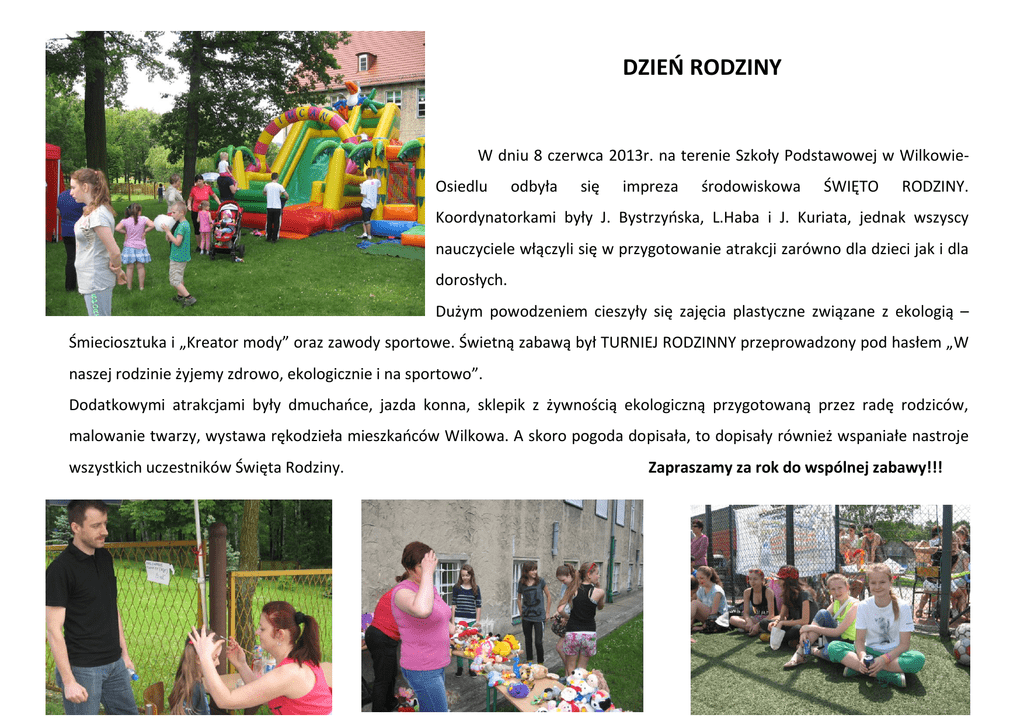 DZIEŃ RODZINY W dniu 8 czerwca 2013r. na terenie Szkoły Podstawowej w WilkowieOsiedlu odbyła się impreza środowiskowa ŚWIĘTO RODZINY. Koordynatorkami były J. Bystrzyoska, L.Haba i J. Kuriata, jednak wszyscy nauczyciele włączyli się w przygotowanie atrakcji zarówno dla dzieci jak i dla dorosłych. Dużym powodzeniem cieszyły się zajęcia plastyczne związane z ekologią – Śmieciosztuka i „Kreator mody” oraz zawody sportowe. Świetną zabawą był TURNIEJ RODZINNY przeprowadzony pod hasłem „W naszej rodzinie żyjemy zdrowo, ekologicznie i na sportowo”. Dodatkowymi atrakcjami były dmuchaoce, jazda konna, sklepik z żywnością ekologiczną przygotowaną przez radę rodziców, malowanie twarzy, wystawa rękodzieła mieszkaoców Wilkowa. A skoro pogoda dopisała, to dopisały również wspaniałe nastroje wszystkich uczestników Święta Rodziny. Zapraszamy za rok do wspólnej zabawy!!!