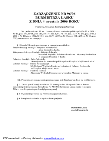 ZARZĄDZENIE NR 96/06 BURMISTRZA ŁASKU Z DNIA 4 września 2006 ROKU w sprawie powołania Komisji przetargowej Na podstawie art. 19 ust. 1 ustawy Prawo zamówień publicznych (Dz.U. z 2004 r. Nr 19, poz. 177, Nr 96, poz. 959, Nr 116, poz. 1207, Nr 145, poz. 1537, Nr 273, poz. 2703, z 2005 r. Nr 163, poz. 1362, Nr 184, poz. 1539, z 2006 r. Nr 79, poz. 551 z 2006 r. Nr 79, poz. 551) postanawiam, co następuje: § 1.Powołać Komisję przetargową w następującym składzie: Przewodniczący Komisji – Krzysztof Nowakowski /Z-ca Burmistrza Łasku/ Wiceprzewodnicząca Komisji – Wioletta Rabenda /Naczelnik Wydziału Rolnictwa Leśnictwa i Ochrony Środowiska w Urzędzie Miejskim w Łasku Sekretarz Komisji – Julita Ściegińska /Koordynator ds. zamówień publicznych w Urzędzie Miejskim w Łasku/ Członek Komisji – Michał Kołodziejczyk /Mł. Referent Wydziału Rolnictwa Leśnictwa i Ochrony Środowiska w Urzędzie Miejskim w Łasku / Członek Komisji – Wiesława Jasińska /Naczelnik Wydziału Finansowego w Urzędzie Miejskim w Łasku / § 2. Przedmiotem postępowania przetargowego jest: Przebudowa drogi we wsi Karszew. § 3. Zakres prac Komisji określa art. 20 ustawy z dnia 29 stycznia 2004 r. Prawo zamówień publicznych oraz Zarządzenie Nr 92/2006 Burmistrza Łasku z dnia 16 sierpnia 2006 r. oraz Regulamin prac komisji przetargowej. § 4. Wykonanie powierza się Przewodniczącemu Komisji. § 5. Zarządzenie wchodzi w życie z dniem podjęcia. Burmistrz Łasku Jacek Pałuszyński PDF created with pdfFactory trial version www.pdffactory.com