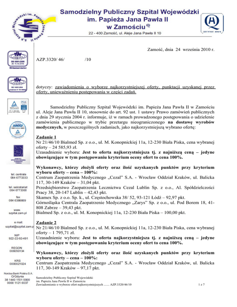 Zamość, dnia 24 września 2010 r. AZP.3320/ 46/ /10 dotyczy: zawiadomienia o wyborze najkorzystniejszej oferty, punktacji uzyskanej przez oferty, unieważnieniu postępowania w części zadań. Samodzielny Publiczny Szpital Wojewódzki im. Papieża Jana Pawła II w Zamościu ul. Aleje Jana Pawła II 10, stosownie do art. 92 ust. 1 ustawy Prawo zamówień publicznych z dnia 29 stycznia 2004 r. informuje, iż w ramach prowadzonego postępowania o udzielenie zamówienia publicznego w trybie przetargu nieograniczonego na dostawę wyrobów medycznych, w poszczególnych zadaniach, jako najkorzystniejszą wybrano ofertę: Zadanie 1 Nr 21/46/10 Bialmed Sp. z o.o., ul. M. Konopnickiej 11a, 12-230 Biała Piska, cena wybranej oferty – 24 585,93 zł. Uzasadnienie wyboru: Jest to oferta najkorzystniejsza tj. z najniższą ceną – jedyne obowiązujące w tym postępowaniu kryterium oceny ofert to cena 100%. Wykonawcy, którzy złożyli oferty oraz ilość uzyskanych punktów przy kryterium wyboru oferty – cena – 100%: Centrum Zaopatrzenia Medycznego „Cezal” S.A. - Wrocław Oddział Kraków, ul. Balicka 117, 30-149 Kraków – 31,04 pkt. Przedsiębiorstwo Zaopatrzenia Lecznictwa Cezal Lublin Sp. z o.o., Al. Spółdzielczości Pracy 38, 20-147 Lublin – 42,43 pkt. Skamex Sp. z o.o. Sp. k., ul. Częstochowska 38/ 52, 93-121 Łódź – 92,97 pkt. Górnośląska Centrala Zaopatrzenie Medycznego „Zarys” Sp. z o.o., ul. Pod Borem 18, 41808 Zabrze – 39,43 pkt. Bialmed Sp. z o.o., ul. M. Konopnickiej 11a, 12-230 Biała Piska – 100,00 pkt. Zadanie 2 Nr 21/46/10 Bialmed Sp. z o.o., ul. M. Konopnickiej 11a, 12-230 Biała Piska, cena wybranej oferty – 1 795,71 zł. Uzasadnienie wyboru: Jest to oferta najkorzystniejsza tj. z najniższą ceną – jedyne obowiązujące w tym postępowaniu kryterium oceny ofert to cena 100%. Wykonawcy, którzy złożyli oferty oraz ilość uzyskanych punktów przy kryterium wyboru oferty – cena – 100%: Centrum Zaopatrzenia Medycznego „Cezal” S.A. - Wrocław Oddział Kraków, ul. Balicka 117, 30-149 Kraków – 97,17 pkt. Samodzielny Publiczny Szpital Wojewódzki im. Papieża Jana Pawła II w Zamościu Zawiadomienie o wyborze ofert najkorzystniejszych ....... AZP.3320/46/10 1z7 Skamex Sp. z o.o. Sp. k., ul. Częstochowska 38/ 52, 93-121 Łódź – 61,58 pkt. Bialmed Sp. z o.o., ul. M. Konopnickiej 11a, 12-230 Biała Piska – 100,00 pkt. Zadanie 3 Nr 14/46/10 – Grena Ltd., 1 Saxon Court Hadlow Down, East Sussex TN 224DT, UK, cena wybranej oferty – 54 923,10 zł. Uzasadnienie wyboru: Jest to oferta najkorzystniejsza tj. z najniższą ceną – jedyne obowiązujące w tym postępowaniu kryterium oceny ofert to cena 100%. Wykonawcy, którzy złożyli oferty oraz ilość uzyskanych punktów przy kryterium wyboru oferty – cena – 100%: Grena Ltd., 1 Saxon Court Hadlow Down, East Sussex TN 224DT, UK – 100,00 pkt. Skamex Sp. z o.o. Sp. k., ul. Częstochowska 38/ 52, 93-121 Łódź – 95,13 pkt. Zadanie 4 Nr 13/ 46/10 JKT Wytwórnia Materiałów Higienicznych Sp. z o.o., ul. Zwycięstwa 17a, 15703 Białystok, cena wybranej oferty – 29 376,85 zł. Uzasadnienie wyboru: Jest to oferta najkorzystniejsza tj. z najniższą ceną, spośród ofert nieodrzuconych – jedyne obowiązujące w tym postępowaniu kryterium oceny ofert to cena 100%. Wykonawcy, którzy złożyli oferty oraz ilość uzyskanych punktów przy kryterium wyboru oferty – cena – 100%: Euro – Centrum Bożena i Cezariusz Wirkowscy Sp. J., ul. Chodakowska 10, 96-503 Sochaczew – Wykonawca wykluczony, oferta odrzucona. Toruńskie Zakłady Materiałów Opatrunkowych S.A., ul. Żółkiewskiego 20/ 26, 87-100 Toruń – oferta odrzucona. JKT Wytwórnia Materiałów Higienicznych Sp. z o.o., ul. Zwycięstwa 17a, 15-703 Białystok –100,00 pkt. Zadanie 5 Nr 13/ 46/10 JKT Wytwórnia Materiałów Higienicznych Sp. z o.o., ul. Zwycięstwa 17a, 15703 Białystok, cena wybranej oferty – 11 031,70 zł. Uzasadnienie wyboru: Jest to oferta najkorzystniejsza tj. z najniższą ceną, spośród ofert nieodrzuconych – jedyne obowiązujące w tym postępowaniu kryterium oceny ofert to cena 100%. Wykonawcy, którzy złożyli oferty oraz ilość uzyskanych punktów przy kryterium wyboru oferty – cena – 100%: Euro – Centrum Bożena i Cezariusz Wirkowscy Sp. j., ul. Chodakowska 10, 96-503 Sochaczew – Wykonawca wykluczony, oferta odrzucona. Tomed Sp. z o.o., ul. Strzeleckiego 8 m. 75, 02-776 Warszawa – 44,71 pkt. Toruńskie Zakłady Materiałów Opatrunkowych S.A., ul. Żółkiewskiego 20/ 26, 87-100 Toruń – 76,60 pkt. JKT Wytwórnia Materiałów Higienicznych Sp. z o.o., ul. Zwycięstwa 17a, 15-703 Białystok – 100,00 pkt. Zadanie 6 Nr 13/46/10 JKT Wytwórnia Materiałów Higienicznych Sp. z o.o., ul. Zwycięstwa 17a, 15Samodzielny Publiczny Szpital Wojewódzki im. Papieża Jana Pawła II w Zamościu Zawiadomienie o wyborze ofert najkorzystniejszych ....... AZP.3320/46/10 2z7 703 Białystok, cena wybranej oferty – 96 631,70 zł. Uzasadnienie wyboru: Jest to oferta najkorzystniejsza tj. z najniższą ceną, spośród ofert nieodrzuconych – jedyne obowiązujące w tym postępowaniu kryterium oceny ofert to cena 100%. Wykonawcy, którzy złożyli oferty oraz ilość uzyskanych punktów przy kryterium wyboru oferty – cena – 100%: Euro – Centrum Bożena i Cezariusz Wirkowscy Sp. j., ul. Chodakowska 10, 96-503 Sochaczew – Wykonawca wykluczony, oferta odrzucona. JKT Wytwórnia Materiałów Higienicznych Sp. z o.o., ul. Zwycięstwa 17a, 15-703 Białystok – 100,00 pkt. Zadanie 7 Nr 22/46/10 Aesculap Chifa Sp. z o.o., ul. Tysiąclecia 14, 64-300 Nowy Tomyśl, cena wybranej oferty – 4 532,54 zł. Uzasadnienie wyboru: Jest to oferta najkorzystniejsza tj. z najniższą ceną – jedyne obowiązujące w tym postępowaniu kryterium oceny ofert to cena 100%. Wykonawcy, którzy złożyli oferty oraz ilość uzyskanych punktów przy kryterium wyboru oferty – cena – 100%: Aesculap Chi