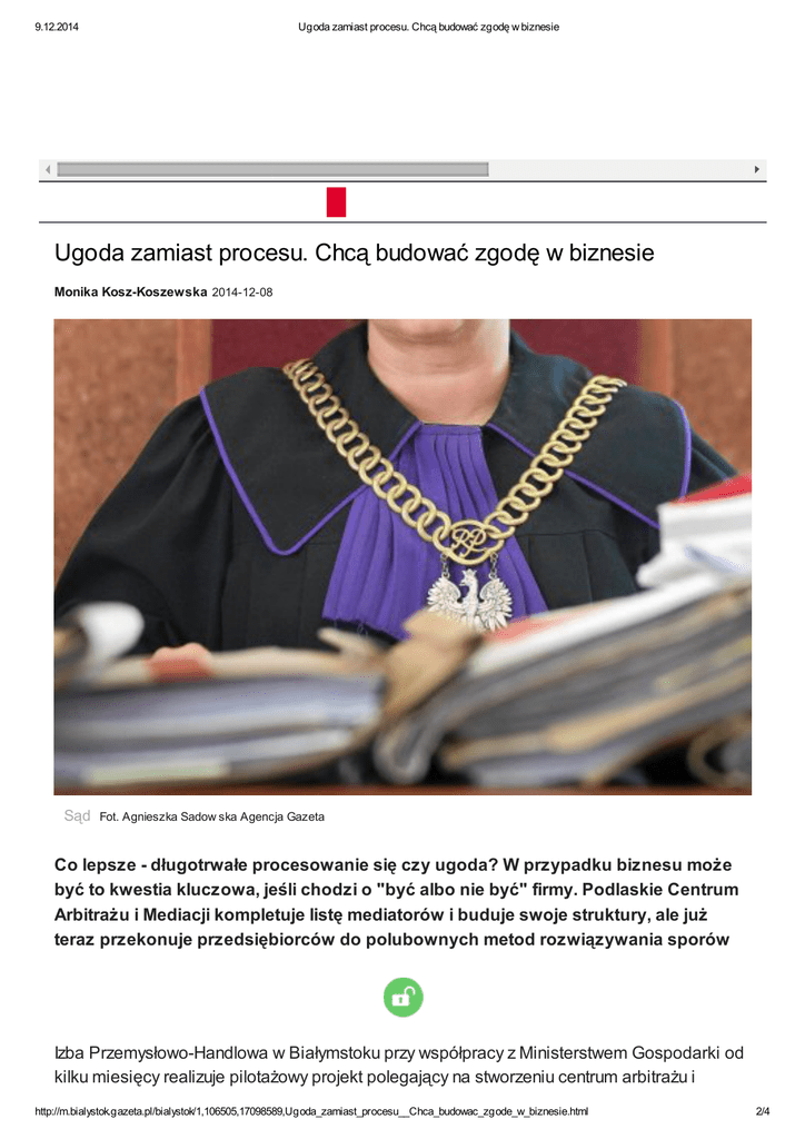 9.12.2014 Ugoda zamiast procesu. Chcą budować zgodę w biznesie Ugoda zamiast procesu. Chcą budować zgodę w biznesie Monika Kosz-Koszewska 2014-12-08 Sąd Fot. Agnieszka Sadow ska Agencja Gazeta Co lepsze - długotrwałe procesowanie się czy ugoda? W przypadku biznesu może być to kwestia kluczowa, jeśli chodzi o "być albo nie być" firmy. Podlaskie Centrum Arbitrażu i Mediacji kompletuje listę mediatorów i buduje swoje struktury, ale już teraz przekonuje przedsiębiorców do polubownych metod rozwiązywania sporów Izba Przemysłowo-Handlowa w Białymstoku przy współpracy z Ministerstwem Gospodarki od kilku miesięcy realizuje pilotażowy projekt polegający na stworzeniu centrum arbitrażu i http://m.bialystok.gazeta.pl/bialystok/1,106505,17098589,Ugoda_zamiast_procesu__Chca_budowac_zgode_w_biznesie.html 2/4 9.12.2014 Ugoda zamiast procesu. Chcą budować zgodę w biznesie mediacji (jednego z sześciu w Polsce). W poniedziałek w Sądzie Rejonowym w Białymstoku zorganizowano pierwsze spotkanie dla przedsiębiorców, przedstawicieli samorządu, ludzi związanych ze środowiskiem naukowym i prawniczym, aby przedstawić ideę centrum i możliwości, jakie daje skierowanie sporu do takiej instytucji. Tego typu spotkań ma być zresztą więcej. Powstaje lista mediatorów - W tej chwili jesteśmy na etapie kompletowania listy mediatorów, którzy będą służyli pomocą przy rozpatrywaniu sporów. W ciągu dwóch miesięcy powinniśmy być już gotowi do przyjmowania zgłoszeń od firm. Ale także przedsiębiorcy muszą się przekonać, że mediacja to skuteczne narzędzie. Przekonać trzeba też samorządy oraz środowiska prawnicze i sądowe - mówi Witold Karczewski, prezes Izby Przemysłowo-Handlowej w Białymstoku. Jak przytacza Maciej Bobrowicz, radca prawny, mediator gospodarczy i prezes Polskiego Stowarzyszenia Mediacji Gospodarczej, w krajach zachodnich około 80-90 procent sporów rozstrzyganych jest w drodze mediacji i kończy się ugodą. Taki instrument świetnie działa w Niemczech, Kanadzie czy USA, u nas dopiero jest wdrażany. - Korzyści to oszczędność czasu i pieniędzy, a także to, że spory, w przeciwieństwie do drogi sądowej, są rozpatrywane przez mediatorów bez udziału osób trzecich, co nie naraża firm na utratę renomy - zaznacza. Partnerzy projektu podkreślają też, że obecność Centrum Arbitrażu i Mediacji może być dobrze postrzegane przez potencjalnych inwestorów. Spory z partnerami z zagranicy - Długofalowy aspekt tego procesu to doprowadzenie do uruchomienia sądu arbitrażowego. Myśląc o nazwie, zastanawiamy się nad Wschodnim Sądem Arbitrażowym, co podkreślałoby transgraniczny wymiar - mówi Maciej Perkowski, prodziekan Wydziału Prawa Uniwersytetu w Białymstoku. To oznacza, że w Białymstoku mogłyby być rozstrzygane spory gospodarcze dotyczące współpracy z partnerami zza wschodniej granicy. A to oznacza z kolei, że działalnością takiego sądu i powierzeniem mu swoich spraw byliby zainteresowani przedsiębiorcy z całej Polski. Witold Karczewski mówił o wyjazdach roboczych do Brześcia i Grodna, które służyły m.in. nawiązaniu współpracy, tak, by w przyszłości na liście mediatorów, pojawiły się także nazwiska akceptowane przez stronę białoruską. - Dzięki takiemu rozwiązywaniu sporów, przedsiębiorcy mogą iść z biznesem dalej, sprzęt, o który toczy się spór, nie zarasta pokrzywami. Prace nad innymi centrami w kraju idą równym tempem i mam nadzieję, że wraz z Nowym rokiem zaczną one funkcjonować - mówi Mariusz Haładyj, podsekretarz stanu w Ministerstwie Gospodarki. http://m.bialystok.gazeta.pl/bialystok/1,106505,17098589,Ugoda_zamiast_procesu__Chca_budowac_zgode_w_biznesie.html 3/4 9.12.2014 Ugoda zamiast procesu. Chcą budować zgodę w biznesie Tylko w okresie świątecznym 40% zniżki na prenumeratę Wszystkie pakiety tańsze, oszczędź nawet 150 zł Książka "Polish Your English. Angielski z Premierem" w atrakcyjnej cenie dla Prenumeratorów Wybierz pakiet dla siebie Podziel się: Facebook Najpopularniejsze Gazeta.pl Ścięła krzyż przy posesji przez modlące się sąsiadki. Prokurator nie po Słynna akcja Góra Grosza: jedynie połowa z 2,4 mln trafiła do dzieci.... Powrót Do góry Wszystkie serwisy Zgłoś błąd Pełna wersja strony Copyright © Agora SA http://m.bialystok.gazeta.pl/bialystok/1,106505,17098589,Ugoda_zamiast_procesu__Chca_budowac_zgode_w_biznesie.html 4/4