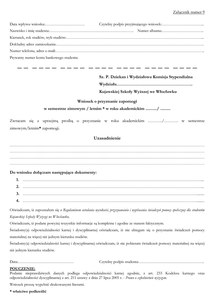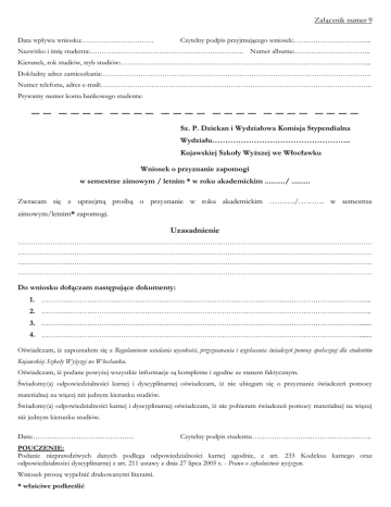 Załącznik numer 9 Data wpływu wniosku:………………………… Czytelny podpis przyjmującego wniosek:…………………………... Nazwisko i imię studenta:………………………………………………………. Numer albumu:………………………….. Kierunek, rok studiów, tryb studiów:…………………………………………………………………………………………... Dokładny adres zamieszkania:…………………………………………………………………………………………………. Numer telefonu, adres e-mail:………………………………………………………………………………………………….. Prywatny numer konta bankowego studenta: __ ____ ____ ____ ____ ____ ____ Sz. P. Dziekan i Wydziałowa Komisja Stypendialna Wydziału…………………………………………….. Kujawskiej Szkoły Wyższej we Włocławku Wniosek o przyznanie zapomogi w semestrze zimowym / letnim * w roku akademickim ........../ ......... Zwracam się z uprzejmą prośbą o przyznanie w roku akademickim ………./………. w semestrze zimowym/letnim* zapomogi. Uzasadnienie ……………………………………………………………………………………………………………………………………………… ……………………………………………………………………………………………………………………………………………… ……………………………………………………………………………………………………………………………………………… ……………………………………………………………………………………………………………………………………………… Do wniosku dołączam następujące dokumenty: 1. ………………………………………………………………………………………………………………………... 2. ………………………………………………………………………………………………………………………... 3. ……………………………………………………………………………………………………………………........ 4. ……………………………………………………………………………………………………………………........ Oświadczam, iż zapoznałem się z Regulaminem ustalania wysokości, przyznawania i wypłacania świadczeń pomocy społecznej dla studentów Kujawskiej Szkoły Wyższej we Włocławku. Oświadczam, iż podane powyżej wszystkie informacje są kompletne i zgodne ze stanem faktycznym. Świadomy(a) odpowiedzialności karnej i dyscyplinarnej oświadczam, iż nie ubiegam się o przyznanie świadczeń pomocy materialnej na więcej niż jednym kierunku studiów. Świadomy(a) odpowiedzialności karnej i dyscyplinarnej oświadczam, iż nie pobieram świadczeń pomocy materialnej na więcej niż jednym kierunku studiów. Data:…………………………………… Czytelny podpis studenta:………………………………………….. POUCZENIE: Podanie nieprawdziwych danych podlega odpowiedzialności karnej zgodnie, z art. 233 Kodeksu karnego oraz odpowiedzialności dyscyplinarnej z art. 211 ustawy z dnia 27 lipca 2005 r. - Prawo o szkolnictwie wyższym. Wniosek proszę wypełnić drukowanymi literami. * właściwe podkreślić