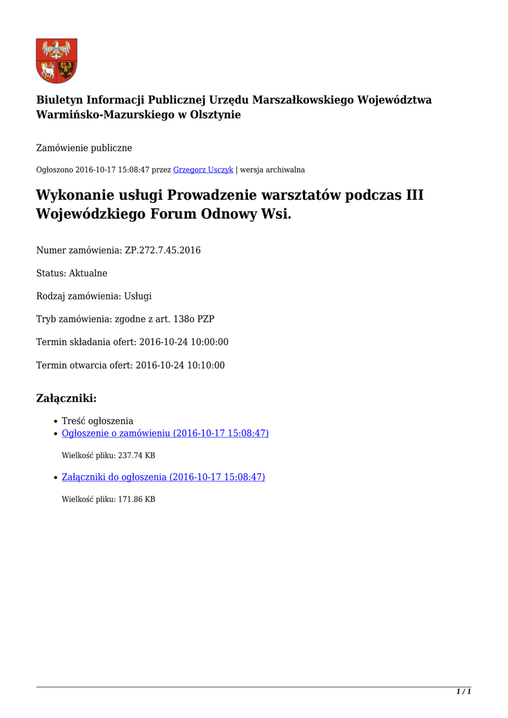 Biuletyn Informacji Publicznej Urzędu Marszałkowskiego Województwa Warmińsko-Mazurskiego w Olsztynie Zamówienie publiczne Ogłoszono 2016-10-17 15:08:47 przez Grzegorz Usczyk | wersja archiwalna Wykonanie usługi Prowadzenie warsztatów podczas III Wojewódzkiego Forum Odnowy Wsi. Numer zamówienia: ZP.272.7.45.2016 Status: Aktualne Rodzaj zamówienia: Usługi Tryb zamówienia: zgodne z art. 138o PZP Termin składania ofert: 2016-10-24 10:00:00 Termin otwarcia ofert: 2016-10-24 10:10:00 Załączniki: Treść ogłoszenia Ogłoszenie o zamówieniu (2016-10-17 15:08:47) Wielkość pliku: 237.74 KB Załączniki do ogłoszenia (2016-10-17 15:08:47) Wielkość pliku: 171.86 KB 1/1