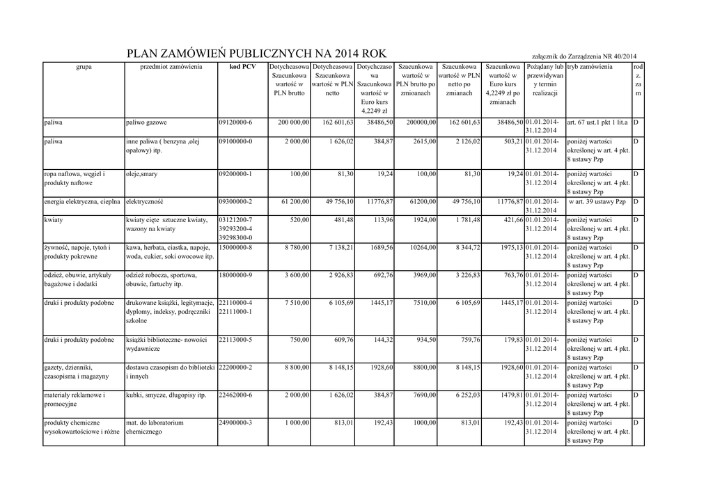 PLAN ZAMÓWIEŃ PUBLICZNYCH NA 2014 ROK grupa przedmiot zamówienia kod PCV Dotychcasowa Dotychcasowa Dotychczaso Szacunkowa Szacunkowa Szacunkowa wa wartość w wartość w PLN wartość w Szacunkowa Szacunkowa wartość w wartość w PLN Szacunkowa PLN brutto po netto po Euro kurs PLN brutto netto wartość w zmioanach zmianach 4,2249 zł po Euro kurs zmianach 4,2249 zł załącznik do Zarządzenia NR 40/2014 Pożądany lub tryb zamówienia rod przewidywan z. y termin za realizacji m paliwa paliwo gazowe 09120000-6 200 000,00 162 601,63 38486,50 200000,00 162 601,63 38486,50 01.01.201431.12.2014 paliwa inne paliwa ( benzyna ,olej opałowy) itp. 09100000-0 2 000,00 1 626,02 384,87 2615,00 2 126,02 503,21 01.01.201431.12.2014 poniżej wartości D określonej w art. 4 pkt. 8 ustawy Pzp ropa naftowa, węgiel i produkty naftowe oleje,smary 09200000-1 100,00 81,30 19,24 100,00 81,30 19,24 01.01.201431.12.2014 energia elektryczna, cieplna elektryczność 09300000-2 61 200,00 49 756,10 11776,87 61200,00 49 756,10 kwiaty kwiaty cięte sztuczne kwiaty, wazony na kwiaty 520,00 481,48 113,96 1924,00 1 781,48 żywność, napoje, tytoń i produkty pokrewne kawa, herbata, ciastka, napoje, woda, cukier, soki owocowe itp. 03121200-7 39293200-4 39298300-0 15000000-8 11776,87 01.01.201431.12.2014 421,66 01.01.201431.12.2014 poniżej wartości D określonej w art. 4 pkt. 8 ustawy Pzp w art. 39 ustawy Pzp D 8 780,00 7 138,21 1689,56 10264,00 8 344,72 1975,13 01.01.201431.12.2014 odzież, obuwie, artykuły bagażowe i dodatki odzież robocza, sportowa, obuwie, fartuchy itp. 18000000-9 3 600,00 2 926,83 692,76 3969,00 3 226,83 763,76 01.01.201431.12.2014 druki i produkty podobne drukowane książki, legitymacje, 22110000-4 dyplomy, indeksy, podręczniki 22111000-1 szkolne 7 510,00 6 105,69 1445,17 7510,00 6 105,69 1445,17 01.01.201431.12.2014 druki i produkty podobne książki biblioteczne- nowości wydawnicze 22113000-5 750,00 609,76 144,32 934,50 759,76 179,83 01.01.201431.12.2014 gazety, dzienniki, czasopisma i magazyny dostawa czasopism do biblioteki 22200000-2 i innych 8 800,00 8 148,15 1928,60 8800,00 8 148,15 1928,60 01.01.201431.12.2014 materiały reklamowe i promocyjne kubki, smycze, długopisy itp. 22462000-6 2 000,00 1 626,02 384,87 7690,00 6 252,03 1479,81 01.01.201431.12.2014 24900000-3 1 000,00 813,01 192,43 1000,00 813,01 192,43 01.01.201431.12.2014 produkty chemiczne mat. do laboratorium wysokowartościowe i różne chemicznego art. 67 ust.1 pkt 1 lit.a ustawy D Pzp poniżej wartości określonej w art. 4 pkt. 8 ustawy Pzp poniżej wartości określonej w art. 4 pkt. 8 ustawy Pzp poniżej wartości określonej w art. 4 pkt. 8 ustawy Pzp poniżej wartości określonej w art. 4 pkt. 8 ustawy Pzp D poniżej wartości określonej w art. 4 pkt. 8 ustawy Pzp poniżej wartości określonej w art. 4 pkt. 8 ustawy Pzp poniżej wartości określonej w art. 4 pkt. 8 ustawy Pzp poniżej wartości określonej w art. 4 pkt. 8 ustawy Pzp D D D D D D D materiały biurowe formularze, skoroszyty itp. Sprzęt biurowy, wyroby biurowe, organizatory i akcesoria, przybory kreślarskie, tablice, kalendarze, drobny sprzęt biurowy, papeterie i inne wyroby 22800000-8 30191000-4 30192000-1 30193000-8 30194000-5 30195000-2 30196000-9 30197000-6 30199000-0 8 760,00 7 121,95 1685,71 9559,50 7 771,95 1839,56 01.01.201431.12.2014 poniżej wartości D określonej w art. 4 pkt. 8 ustawy Pzp części i akcesoria do aparatów fotokopiujących /zakup komputerowych mat. eksploatacyjnych wkłady barwiące, tonery do drukarek laserowych, fotokopiarek i faksów, taśmy do drukarek itp. płyty CD, DVD, kopert na CD, taśmy , płyny, pianki i ściereczki do czyszczenia sprzętu komputerowego 30125000-1 30192320-0 30234300-1 30234400-2 30234400-2 30234600-4 30236000-2 30237250-6 14 000,00 11 382,11 2694,06 18725,66 15 224,11 3603,43 01.01.201431.12.2014 poniżej wartości D określonej w art. 4 pkt. 8 ustawy Pzp wyrób pieczęci pieczątki z napisami 30192153-8 920,00 747,97 177,04 920,00 747,97 177,04 01.01.201431.12.2014 sprzęt peryferyjny drukarki, plotery, centralna jednostka sterująca, pendrive 30234300-1 30234400-2 30234400-2 30234600-4 30236000-2 30237250-6 250,00 203,25 48,11 250,00 203,25 48,11 01.01.201431.12.2014 poniżej wartości U określonej w art. 4 pkt. 8 ustawy Pzp poniżej wartości D określonej w art. 4 pkt. 8 ustawy Pzp części komputerów interfejs USB, klawiatury komputerowe, myszka komputerowa itp. aparatura do przesyłu i eksploatacji energii elektrycznej; drut i kabel izolacyjny; akumulatory i baterie galwaniczne; urządzenia oświetleniowe i lampy elektryczne ; sprzęt i aparatura elektryczna elektrody, oporniki, artykuły elektroniczne itp. 30237100-0 3 100,00 2 520,33 596,54 3100,00 2 520,33 596,54 01.01.201431.12.2014 31200000-8 31300000-9 31400000-0 31500000-1 31600000-2 31700000-3 2 500,00 2 032,52 481,08 2992,00 2 432,52 575,76 01.01.201431.12.2014 32500000-8 200,00 162,60 38,49 200,00 162,60 38,49 01.01.201431.12.2014 maszyny aparatura, urządzenia i wyroby elektryczne; oświetlenie urządzenia elektryczne, elektromechaniczne i elektryczne urządzenia i artykuły telekomunikacyjne kable telekomunikacyjne, centrale, kable telefoniczne i podobny sprzęt poniżej wartości D określonej w art. 4 pkt. 8 ustawy Pzp poniżej wartości D określonej w art. 4 pkt. 8 ustawy Pzp poniżej wartości D określonej w art. 4 pkt. 8 ustawy Pzp produkty farmaceutyczne medykamenty, i inne na wyposażenie apteczek 33600000-6 100,00 81,30 19,24 223,00 181,30 42,91 01.01.201431.12.2014 33760000-5 środki do pielęgnacji ciała, papier,toaletowy,chusteczki środki czystości i polerujące higieniczne, ręczniki papierowe 39800000-0 pasty,odświeżacze powietrza, zmiotki, preparaty czyszczące, automatyczne dozowniki do mydła, 10 000,00 8 130,08 1924,33 10000,00 8 130,08 1924,33 01.01.201431.12.2014 poniżej wartości D określonej w art. 4 pkt. 8 ustawy Pzp poniżej wartości D określonej w art. 4 pkt. 8 ustawy Pzp ma