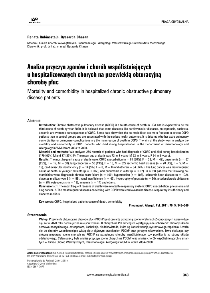 PRACA ORYGINALNA Renata Rubinsztajn, Ryszarda Chazan Katedra i Klinika Chorób Wewnętrznych, Pneumonologii i Alergologii Warszawskiego Uniwersytetu Medycznego Kierownik: prof. dr hab. n. med. Ryszarda Chazan Analiza przyczyn zgonów i chorób współistniejących u hospitalizowanych chorych na przewlekłą obturacyjną chorobę płuc Mortality and comorbidity in hospitalized chronic obstructive pulmonary disease patients Abstract Introduction: Chronic obstructive pulmonary disease (COPD) is a fourth cause of death in USA and is expected to be the third cause of death by year 2020. It is believed that some diseases like cardiovascular diseases, osteoporosis, cachexia, anaemia are systemic consequences of COPD. Some data show that the co-morbidities are more frequent in severe COPD patients than in control groups and are associated with the serious health outcomes. It is debated whether extra pulmonary comorbidities or pulmonary complications are the main reason of death in COPD. The aim of the study was to analyze the mortality and comorbidity in COPD patients who died during hospitalization in the Department of Pneumonology and Allergology in WMU from 2004 to 2008. Material and methods: We analyzed 266 records of patients who had diagnosis of COPD and died during hospitalization (179 [67%] M and 87 [33%] F). The mean age at death was 73 ± 8 years (M 73 ± 8 years, F 74 ± 9 years). Results: The most frequent cause of death were: COPD exacerbation (n = 81 [30%], F = 32, M = 49), pneumonia (n = 67 [25%], F = 17, M = 50), lung cancer (n = 50 [19%], F = 18, M = 32), ischemic heart disease (n = 20 [7%], F = 5, M = 15), cardiovascular insufficiency (n = 14 [5%], F = 6, M = 8) and other (n = 34 [14%]). The lung cancer was more frequent cause of death in younger patients (p = 0.002), and pneumonia in older (p = 0.02). In COPD patients the following comorbidities were diagnosed: chronic heart failure (n = 169), hypertension (n = 103), ischaemic heart disease (n = 102), diabetes mellitus type 2 (n = 55), renal insufficiency (n = 43), hypertrophy of prostate (n = 36), arteriosclerosis obliterans (n = 28), osteoporosis (n = 19), anaemia (n = 14) and others. Conclusions: 1. The most frequent reasons of death were related to respiratory system: COPD exacerbation, pneumonia and lung cancer. 2. The most frequent diseases coexisting with COPD were cardiovascular disease, respiratory insufficiency and diabetes mellitus. Key words: COPD, hospitalized patients cause of death, comorbidity Pneumonol. Alergol. Pol. 2011; 79, 5: 343–346 Streszczenie Wstęp: Przewlekła obturacyjna choroba płuc (POChP) jest czwartą przyczyną zgonu w Stanach Zjednoczonych i przewiduje się, że w 2020 roku będzie już na miejscu trzecim. U chorych na POChP często występują inne schorzenia: choroby układu sercowo-naczyniowego, osteoporoza, kacheksja, niedokrwistość, które są konsekwencją systemowego zapalenia. Uważa się, że choroby współistniejące wiążą się z cięższym przebiegiem POChP oraz gorszym rokowaniem. Trwa dyskusja, czy główną przyczyną zgonu chorych na POChP są pozapłucne choroby współistniejące, czy powikłania ze strony układu oddechowego. Celem pracy była analiza przyczyn zgonu chorych na POChP oraz analiza chorób współistniejących u zmarłych w Klinice Chorób Wewnętrznych, Pneumonologii i Alergologii WUM w latach 2004–2008. Adres do korespondencji: dr n. med. Renata Rubinsztajn, Katedra i Klinika Chorób Wewnętrznych, Pneumonologii i Alergologii WUM, ul. Banacha 1a, 02–097 Warszawa, tel.: 22 599 28 52, 606 858 550, e-mail: [email protected] Praca wpłynęła do Redakcji: 28.01.2011 r. Copyright © 2011 Via Medica ISSN 0867–7077 www.pneumonologia.viamedica.pl 343 Pneumonologia i Alergologia Polska 2011, tom 79, nr 5, strony 343–346 Materiał i metody: Analizie poddano 266 kolejnych historii chorób pacjentów z POChP, którzy zmarli podczas hospitalizacji. Było wśród nich 179 (67%) mężczyzn i 87 (33%) kobiet. Średni wiek zmarłych wyniósł 73 ± 8 lat (73 ± 8 M, 74 ± 9 K). Wyniki: Przyczynami zgonu w analizowanej grupie chorych były: zaostrzenie POChP (n = 81 [30%], K = 32, M = 49), zapalenie płuc (n = 67 [25%], K = 17, M = 50), rak płuca (n = 50 [19%], K = 18, M = 32), choroba niedokrwienna serca (n = 20 [7%], K = 5, M = 15), niewydolność serca (n = 14 [5%], K = 6, M = 8) i inne (n = 34, 14%). Zgony z powodu raka płuca dotyczyły osób młodszych (p = 0,002), a z powodu zapalenia płuc — osób starszych (p = 0,02). W badanej grupie do najczęstszych chorób współistniejących należały: przewlekła niewydolność serca (n = 169), nadciśnienie tętnicze (n = 103), choroba niedokrwienna serca (n = 102), cukrzyca typu 2 (n = 55), niewydolność nerek (n = 43), przerost prostaty (n = 36), miażdżyca tętnic kończyn dolnych (n = 28), osteoporoza (n = 19), niedokrwistość (n = 14). Wnioski: 1. Najczęstszymi przyczynami zgonu w badanej grupie były patologie związane z układem oddechowym: zaostrzenie POChP, zapalenie płuc i rak płuca. 2. W analizowanym materiale do schorzeń najczęściej współistniejących z POChP należały choroby układu krążenia i cukrzyca typu 2. Słowa kluczowe: POChP, przyczyna zgonu u hospitalizowanych, choroby współistniejące Pneumonol. Alergol. Pol. 2011; 79, 5: 343–346 Wstęp Materiał i metody Istotą przewlekłej obturacyjnej choroby płuc (POChP) jest postępujące, słabo odwracalne ograniczenie przepływu powietrza przez drogi oddechowe spowodowane nadmierną odpowiedzią zapalną układu oddechowego na szkodliwe pyły lub gazy (w szczególności dym tytoniowy). Od niedawna POChP jest uważana za chorobę ogólnoustrojową, gdyż zmianom w układzie oddechowym towarzyszą istotne zmiany pozapłucne, takie jak kacheksja, osteoporoza, zanik beztłuszczowej masy ciała, depresja, niedokrwistość i częstsza zapadalność na choroby układu krążenia. W definicji zawartej w raporcie Global Initiative 