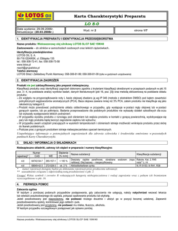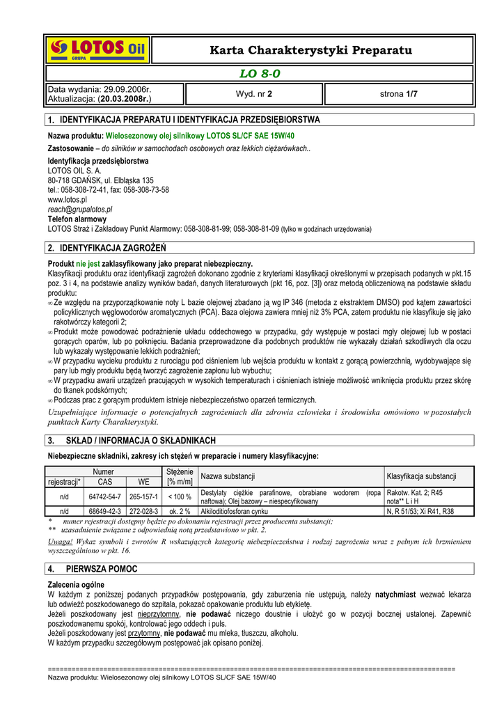 Karta Charakterystyki Preparatu LO 8-0 Data wydania: 29.09.2006r. Aktualizacja: (20.03.2008r.) Wyd. nr 2 strona 1/7 1. IDENTYFIKACJA PREPARATU I IDENTYFIKACJA PRZEDSIĘBIORSTWA Nazwa produktu: Wielosezonowy olej silnikowy LOTOS SL/CF SAE 15W/40 Zastosowanie – do silników w samochodach osobowych oraz lekkich cięŜarówkach.. Identyfikacja przedsiębiorstwa LOTOS OIL S. A. 80-718 GDAŃSK, ul. Elbląska 135 tel.: 058-308-72-41, fax: 058-308-73-58 www.lotos.pl [email protected] Telefon alarmowy LOTOS StraŜ i Zakładowy Punkt Alarmowy: 058-308-81-99; 058-308-81-09 (tylko w godzinach urzędowania) 2. IDENTYFIKACJA ZAGROśEŃ Produkt nie jest zaklasyfikowany jako preparat niebezpieczny. Klasyfikacji produktu oraz identyfikacji zagroŜeń dokonano zgodnie z kryteriami klasyfikacji określonymi w przepisach podanych w pkt.15 poz. 3 i 4, na podstawie analizy wyników badań, danych literaturowych (pkt 16, poz. [3]) oraz metodą obliczeniową na podstawie składu produktu: • Ze względu na przyporządkowanie noty L bazie olejowej zbadano ją wg IP 346 (metoda z ekstraktem DMSO) pod kątem zawartości policyklicznych węglowodorów aromatycznych (PCA). Baza olejowa zawiera mniej niŜ 3% PCA, zatem produktu nie klasyfikuje się jako rakotwórczy kategorii 2; • Produkt moŜe powodować podraŜnienie układu oddechowego w przypadku, gdy występuje w postaci mgły olejowej lub w postaci gorących oparów, lub po połknięciu. Badania przeprowadzone dla podobnych produktów nie wykazały działań szkodliwych dla oczu lub wykazały występowanie lekkich podraŜnień; • W przypadku wycieku produktu z rurociągu pod ciśnieniem lub wejścia produktu w kontakt z gorącą powierzchnią, wydobywające się pary lub mgły produktu będą tworzyć zagroŜenie zapłonu lub wybuchu; • W przypadku awarii urządzeń pracujących w wysokich temperaturach i ciśnieniach istnieje moŜliwość wniknięcia produktu przez skórę do tkanek podskórnych; • Podczas prac z gorącym produktem istnieje niebezpieczeństwo oparzeń termicznych. Uzupełniające informacje o potencjalnych zagroŜeniach dla zdrowia człowieka i środowiska omówiono w pozostałych punktach Karty Charakterystyki. 3. SKŁAD / INFORMACJA O SKŁADNIKACH Niebezpieczne składniki, zakresy ich stęŜeń w preparacie i numery klasyfikacyjne: rejestracji* Numer CAS WE StęŜenie Nazwa substancji [% m/m] Klasyfikacja substancji Destylaty cięŜkie parafinowe, obrabiane wodorem (ropa Rakotw. Kat. 2; R45 naftowa); Olej bazowy – niespecyfikowany nota** L i H n/d 68649-42-3 272-028-3 ok. 2 % Alkiloditiofosforan cynku N, R 51/53; Xi R41, R38 * numer rejestracji dostępny będzie po dokonaniu rejestracji przez producenta substancji; ** uzasadnienie związane z odpowiednią notą przedstawiono w pkt. 2. n/d 64742-54-7 265-157-1 < 100 % Uwaga! Wykaz symboli i zwrotów R wskazujących kategorię niebezpieczeństwa i rodzaj zagroŜenia wraz z pełnym ich brzmieniem wyszczególniono w pkt. 16. 4. PIERWSZA POMOC Zalecenia ogólne W kaŜdym z poniŜszej podanych przypadków postępowania, gdy zaburzenia nie ustępują, naleŜy natychmiast wezwać lekarza lub odwieźć poszkodowanego do szpitala, pokazać opakowanie produktu lub etykietę. JeŜeli poszkodowany jest nieprzytomny, nie podawać niczego doustnie i ułoŜyć go w pozycji bocznej ustalonej. Zapewnić poszkodowanemu spokój, kontrolować jego oddech i puls. JeŜeli poszkodowany jest przytomny, nie podawać mu mleka, tłuszczu, alkoholu. W kaŜdym przypadku szczegółowym postępować jak opisano poniŜej. ======================================================================================================= Nazwa produktu: Wielosezonowy olej silnikowy LOTOS SL/CF SAE 15W/40 Karta Charakterystyki Preparatu LO 8-0 Data wydania: 29.09.2006r. Aktualizacja: (20.03.2008r.) Wyd. nr 2 strona 2/7 Po wdychaniu Jeśli obserwuje się szkodliwy wpływ oparów na poszkodowanego, naleŜy wyprowadzić lub wynieść go z zagroŜonego miejsca na świeŜe powietrze. Zdjąć zanieczyszczoną odzieŜ. Zapewnić poszkodowanemu spokój i ciepło (okryć kocami). Kontrolować jego oddech i tętno. Przy występowaniu zaburzeń w oddychaniu podawać tlen. W przypadku zatrzymania oddechu stosować sztuczne oddychanie za pomocą aparatu AMBU, po uprzednim oczyszczeniu jamy ustnej z ciał obcych i śluzu. JeŜeli stanie się to konieczne, wykonać masaŜ serca. W przypadku kontaktu ze skórą Zdjąć zanieczyszczoną odzieŜ. Miejsce kontaktu, a w razie potrzeby całe ciało, naleŜy dokładnie umyć wodą z mydłem, o ile nie ma oparzeń gorącym produktem. Do mycia nie wolno uŜywać rozpuszczalników organicznych takich jak: nafta, lekkie destylaty czy benzyna. W przypadku kontaktu gorącego produktu ze skórą oparzone miejsce naleŜy natychmiast zanurzyć w zimnej wodzie lub poddawać działaniu strumienia bieŜącej zimnej wody przez co najmniej 10 minut. Jeśli produkt wniknął pod ciśnieniem do tkanek podskórnych, naleŜy natychmiast udzielić poszkodowanemu pomocy medycznej. Po dostaniu się do oczu Natychmiast zdjąć szkła kontaktowe i przemywać oczy duŜą ilością wody przez co najmniej 15 min. (przy odwiniętych powiekach). W przypadku zanieczyszczenia tylko jednego oka - drugie chronić przed zanieczyszczeniem w trakcie przemywania. Unikać silnego strumienia wody ze względu na ryzyko uszkodzenia rogówki. Uwaga! Osoby naraŜone na skaŜenie oczu powinny być pouczone o konieczności i sposobie ich natychmiastowego płukania. Po połknięciu Nie naleŜy wywoływać wymiotów, gdyŜ istnieje moŜliwość przedostania się produktu do dróg oddechowych, co moŜe powodować zachłystowe zapalenie płuc, a to wymaga natychmiastowego leczenia. W przypadku zanieczyszczenia jamy ustnej wypłukać ją dokładnie wodą, aŜ zniknie smak produktu. JeŜeli poszkodowany jest przytomny, podać mu ok. 200 ml (szklankę) płynnej parafiny do wypicia. W przypadku wystąpienia wymiotów połoŜyć poszkodowanego twarz
