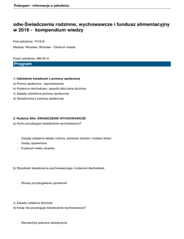 Polexpert - informacje o szkoleniu odw-Świadczenia rodzinne, wychowawcze i fundusz alimentacyjny w 2016 - kompendium wiedzy Kod szkolenia: 741916 Miejsce: Wrocław, Wrocław - Centrum miasta Koszt szkolenia: 490.00 zł Program 1. Udzielanie świadczeń z pomocy społecznej a) Pomoc społeczna - wprowadzenie b) Kryterium dochodowe i sposób obliczania dochodu c) Zasady udzielania pomocy społecznej d) Świadczenia z pomocy społecznej 2. Rodzina 500+ ŚWIADCZENIE WYCHOWAWCZE a) Komu przysługuje świadczenie wychowawcze? - Zasady ustalania składu rodziny, pierwsze dziecko i kolejne dzieci - Osoby uprawnione - Kryterium wieku dziecka b) Wysokość świadczenia wychowawczego i kryterium dochodowe - Okresy przysługiwania uprawnień c) Zasady ustalania dochodu d) Kiedy nie przysługuje świadczenie wychowawcze? - Nienależnie pobrane świadczenie Polexpert - informacje o szkoleniu e) Decyzje f) Wniosek o ustalenie świadczenia wychowawczego oraz dokumentacja. g) Słownik użytych pojęć 3. Świadczenia rodzinne a) Świadczenia rodzinne - wprowadzenie b) Zasady ustalania dochodu c) ZASIŁEK RODZINNY - kryterium dochodowe i warunki przyznania d) ZASIŁEK RODZINNY - kryterium wiekowe e) ZASIŁEK RODZINNY - komu przysługuje? f) ZASIŁEK RODZINNY - wysokość zasiłku g) ZASIŁEK RODZINNY - kiedy nie przysługuje? h) Dodatek do zasiłku rodzinnego z tytułu urodzenia dziecka i) Dodatek do z.r. z tyt. opieki nad dzieckiem w okresie korzystania z urlopu wychowawczego j) Dodatek do z.r. z tytułu samotnego wychowywania dziecka k) Dodatek do z.r. z tytułu wychowywania dziecka w rodzinie wielodzietnej l) Dodatek do z.r. z tytułu kształcenia i rehabilitacji dziecka m) Dodatek do z.r. z tytułu rozpoczęcia roku szkolnego n) Dod. do z.r. z tyt. podjęcia przez dziecko nauki w szkole poza m. zamieszk. o) JEDNORAZOWA ZAPOMOGA Z TYTUŁU URODZENIA SIĘ DZIECKA - BECIKOWE p) ŚWIADCZENIA OPIEKUŃCZE - zasiłek pielęgnacyjny q) ŚWIADCZENIA OPIEKUŃCZE - specjalny zasiłek opiekuńczy r) ŚWIADCZENIA OPIEKUŃCZE - świadczenie pielęgnacyjne s) Świadczenie rodzicielskie t) Informacja oświadczeniach nienależnie pobranych 4. Fundusz alimentacyjny a) Osoby uprawnione b) Ustalanie prawa do świadczenia z Funduszu Alimentacyjnego c) Wysokość świadczeń d) Kryterium dochodowe e) Zasady ustalania dochodu f) Kiedy nie przysługują świadczenia z funduszu alimentacyjnego? g) Procedury wobec dłużnika alimentacyjnego. h) Zwrot świadczeń wypłaconych z funduszu alimentacyjnego w tym świadczenia nienależnie pobrane. i) Realizatorzy, decyzje. Organy egzekucyjne a organ właściwy. j) Słownik użytych pojęć Polexpert - informacje o szkoleniu 5. Udzielanie świadczeń - dodatki mieszkaniowe a) Komu przysługuje dodatek mieszkaniowy? b) Wysokość i okres przyznawania dodatku mieszkaniowego c) Zasady obliczania dochodu przy ustalaniu prawa do dodatku mieszkaniowego d) Kryterium powierzchniowe do dodatku mieszkaniowego Prowadzący