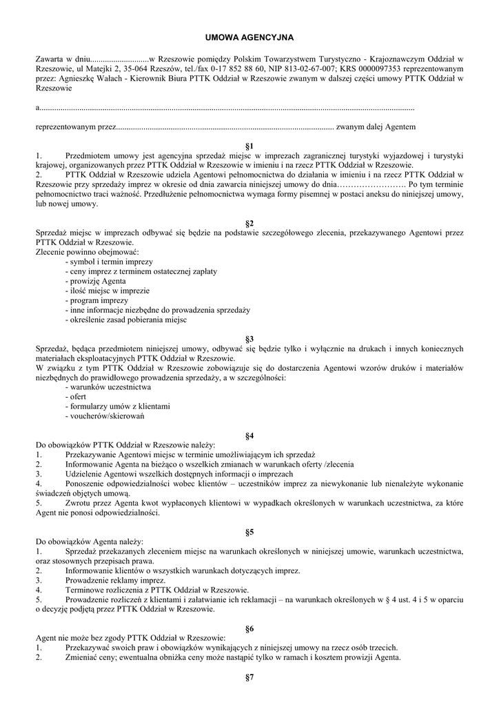 UMOWA AGENCYJNA Zawarta w dniu............................w Rzeszowie pomiędzy Polskim Towarzystwem Turystyczno - Krajoznawczym Oddział w Rzeszowie, ul Matejki 2, 35-064 Rzeszów, tel./fax 0-17 852 88 60, NIP 813-02-67-007; KRS 0000097353 reprezentowanym przez: Agnieszkę Wałach - Kierownik Biura PTTK Oddział w Rzeszowie zwanym w dalszej części umowy PTTK Oddział w Rzeszowie a................................................................................................................................................................................... reprezentowanym przez........................................................................................................ zwanym dalej Agentem §1 1. Przedmiotem umowy jest agencyjna sprzedaż miejsc w imprezach zagranicznej turystyki wyjazdowej i turystyki krajowej, organizowanych przez PTTK Oddział w Rzeszowie w imieniu i na rzecz PTTK Oddział w Rzeszowie. 2. PTTK Oddział w Rzeszowie udziela Agentowi pełnomocnictwa do działania w imieniu i na rzecz PTTK Oddział w Rzeszowie przy sprzedaży imprez w okresie od dnia zawarcia niniejszej umowy do dnia……………………. Po tym terminie pełnomocnictwo traci ważność. Przedłużenie pełnomocnictwa wymaga formy pisemnej w postaci aneksu do niniejszej umowy, lub nowej umowy. §2 Sprzedaż miejsc w imprezach odbywać się będzie na podstawie szczegółowego zlecenia, przekazywanego Agentowi przez PTTK Oddział w Rzeszowie. Zlecenie powinno obejmować: - symbol i termin imprezy - ceny imprez z terminem ostatecznej zapłaty - prowizję Agenta - ilość miejsc w imprezie - program imprezy - inne informacje niezbędne do prowadzenia sprzedaży - określenie zasad pobierania miejsc §3 Sprzedaż, będąca przedmiotem niniejszej umowy, odbywać się będzie tylko i wyłącznie na drukach i innych koniecznych materiałach eksploatacyjnych PTTK Oddział w Rzeszowie. W związku z tym PTTK Oddział w Rzeszowie zobowiązuje się do dostarczenia Agentowi wzorów druków i materiałów niezbędnych do prawidłowego prowadzenia sprzedaży, a w szczególności: - warunków uczestnictwa - ofert - formularzy umów z klientami - voucherów/skierowań §4 Do obowiązków PTTK Oddział w Rzeszowie należy: 1. Przekazywanie Agentowi miejsc w terminie umożliwiającym ich sprzedaż 2. Informowanie Agenta na bieżąco o wszelkich zmianach w warunkach oferty /zlecenia 3. Udzielenie Agentowi wszelkich dostępnych informacji o imprezach 4. Ponoszenie odpowiedzialności wobec klientów – uczestników imprez za niewykonanie lub nienależyte wykonanie świadczeń objętych umową. 5. Zwrotu przez Agenta kwot wypłaconych klientowi w wypadkach określonych w warunkach uczestnictwa, za które Agent nie ponosi odpowiedzialności. §5 Do obowiązków Agenta należy: 1. Sprzedaż przekazanych zleceniem miejsc na warunkach określonych w niniejszej umowie, warunkach uczestnictwa, oraz stosownych przepisach prawa. 2. Informowanie klientów o wszystkich warunkach dotyczących imprez. 3. Prowadzenie reklamy imprez. 4. Terminowe rozliczenia z PTTK Oddział w Rzeszowie. 5. Prowadzenie rozliczeń z klientami i załatwianie ich reklamacji – na warunkach określonych w § 4 ust. 4 i 5 w oparciu o decyzję podjętą przez PTTK Oddział w Rzeszowie. §6 Agent nie może bez zgody PTTK Oddział w Rzeszowie: 1. Przekazywać swoich praw i obowiązków wynikających z niniejszej umowy na rzecz osób trzecich. 2. Zmieniać ceny; ewentualna obniżka ceny może nastąpić tylko w ramach i kosztem prowizji Agenta. §7 1. 2. 3. 4. Z tytułu prowadzonej sprzedaży Agentowi przysługuje prowizja. Wysokość prowizji każdorazowo jest określona w ofercie imprez kierowanej do agenta. Prowizja potrącana jest z przekazywanej w całości wpłaty klienta. Prowizja jest sumą brutto zawierającą podatek VAT. §8 1. Rozliczenie należności z tytułu sprzedanych miejsc winno nastąpić zgodnie z niniejszą umową. Agent zobowiązany jest do niezwłocznego wystawienia i przekazania do PTTK Oddział w Rzeszowie faktury VAT za otrzymaną prowizję. 2. Agent zobowiązany jest do przekazania wpłat klientów z tytułu zawarcia umowy sprzedaży najpóźniej w terminie 5 dni od daty otrzymania wpłaty od klienta, jednak nie później niż przed rozpoczęciem imprezy. Jeżeli z powodu niedotrzymania tych terminów klient, którego wpłata dotyczy nie zostanie umieszczony na liście uczestników, Agent zobowiązany będzie do pokrycia wszelkich kosztów wynikających z roszczeń dochodzonych przez klienta od PTTK Oddział Rzeszów. 3. Przekazując należności na konto lub do kasy PTTK Oddział w Rzeszowie a także na fakturach VAT Agent zobowiązany jest podawać symbol imprezy, której wpłata dotyczy. 4. Wpłat należy dokonywać na konto PTTK Oddział Rzeszów w Banku PEKAO S.A. II O/Rzeszów nr 90 1240 2614 1111 0000 3958 8742 5. Terminy wpłat klientów i ich wysokość określają „Warunki uczestnictwa”. 6. W przypadku rezygnacji klienta, wszelkie potrącenia z tego tytułu Agent przekazuje do PTTK Oddział w Rzeszowie, na zasadach wskazanych w punkcie 3-5 niniejszego paragrafu. §9 Strony niniejszej umowy oświadczają, że są płatnikami podatku VAT uprawnionymi do wystawiania faktur VAT. Upoważniają się nawzajem do wystawienia faktur VAT bez podpisu nabywcy. §10 Agent ponosi w stosunku do PTTK Oddział w Rzeszowie i do klienta całkowitą odpowiedzialność, w tym finansową, za niewykonanie lub nienależyte wykonanie zadań wynikających z niniejszej umowy. §11 Integralną częścią niniejszej umowy są „Warunki uczestnictwa” w imprezach organizowanych przez PTTK Oddział w Rzeszowie i z tego tytułu ich postanowienia są obowiązujące dla Agenta. 1. §12 Niniejsza umowa została zawarta na czas (określony / nieokreślony) i obowiązuje do dnia 2. Każda ze stron ma prawo do wypowiedzenia niniejszej umowy z zachowaniem terminu miesięcznego, przy czym nie zwalnia to stron od wykonania w tym czasie czynności