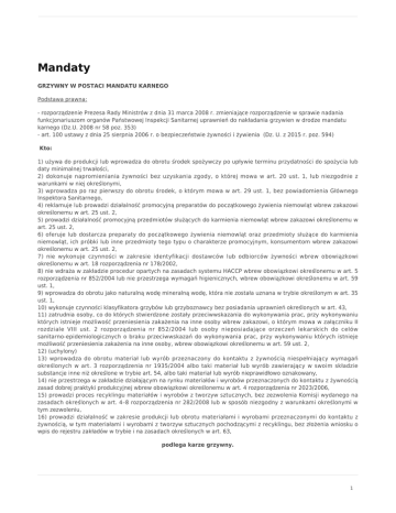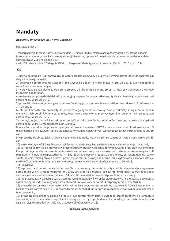 Mandaty GRZYWNY W POSTACI MANDATU KARNEGO Podstawa prawna: - rozporządzenie Prezesa Rady Ministrów z dnia 31 marca 2008 r. zmieniające rozporządzenie w sprawie nadania funkcjonariuszom organów Państwowej Inspekcji Sanitarnej uprawnień do nakładania grzywien w drodze mandatu karnego (Dz.U. 2008 nr 58 poz. 353) - art. 100 ustawy z dnia 25 sierpnia 2006 r. o bezpieczeństwie żywności i żywienia (Dz. U. z 2015 r. poz. 594) Kto: 1) używa do produkcji lub wprowadza do obrotu środek spożywczy po upływie terminu przydatności do spożycia lub daty minimalnej trwałości, 2) dokonuje napromieniania żywności bez uzyskania zgody, o której mowa w art. 20 ust. 1, lub niezgodnie z warunkami w niej określonymi, 3) wprowadza po raz pierwszy do obrotu środek, o którym mowa w art. 29 ust. 1, bez powiadomienia Głównego Inspektora Sanitarnego, 4) reklamuje lub prowadzi działalność promocyjną preparatów do początkowego żywienia niemowląt wbrew zakazowi określonemu w art. 25 ust. 2, 5) prowadzi działalność promocyjną przedmiotów służących do karmienia niemowląt wbrew zakazowi określonemu w art. 25 ust. 2, 6) oferuje lub dostarcza preparaty do początkowego żywienia niemowląt oraz przedmioty służące do karmienia niemowląt, ich próbki lub inne przedmioty tego typu o charakterze promocyjnym, konsumentom wbrew zakazowi określonemu w art. 25 ust. 2, 7) nie wykonuje czynności w zakresie identyfikacji dostawców lub odbiorców żywności wbrew obowiązkowi określonemu w art. 18 rozporządzenia nr 178/2002, 8) nie wdraża w zakładzie procedur opartych na zasadach systemu HACCP wbrew obowiązkowi określonemu w art. 5 rozporządzenia nr 852/2004 lub nie przestrzega wymagań higienicznych, wbrew obowiązkowi określonemu w art. 59 ust. 1, 9) wprowadza do obrotu jako naturalną wodę mineralną wodę, która nie została uznana w trybie określonym w art. 35 ust. 1, 10) wykonuje czynności klasyfikatora grzybów lub grzyboznawcy bez posiadania uprawnień określonych w art. 43, 11) zatrudnia osoby, co do których stwierdzone zostały przeciwwskazania do wykonywania prac, przy wykonywaniu których istnieje możliwość przeniesienia zakażenia na inne osoby wbrew zakazowi, o którym mowa w załączniku II rozdziale VIII ust. 2 rozporządzenia nr 852/2004 lub osoby nieposiadające orzeczeń lekarskich do celów sanitarno-epidemiologicznych o braku przeciwwskazań do wykonywania prac, przy wykonywaniu których istnieje możliwość przeniesienia zakażenia na inne osoby, wbrew obowiązkowi określonemu w art. 59 ust. 2, 12) (uchylony) 13) wprowadza do obrotu materiał lub wyrób przeznaczony do kontaktu z żywnością niespełniający wymagań określonych w art. 3 rozporządzenia nr 1935/2004 albo taki materiał lub wyrób zawierający w swoim składzie substancje inne niż określone w trybie art. 54, albo taki materiał lub wyrób nieprawidłowo oznakowany, 14) nie przestrzega w zakładzie działającym na rynku materiałów i wyrobów przeznaczonych do kontaktu z żywnością zasad dobrej praktyki produkcyjnej wbrew obowiązkowi określonemu w art. 4 rozporządzenia nr 2023/2006, 15) prowadzi proces recyklingu materiałów i wyrobów z tworzyw sztucznych, bez zezwolenia Komisji wydanego na zasadach określonych w art. 4–8 rozporządzenia nr 282/2008 lub w sposób niezgodny z warunkami określonymi w tym zezwoleniu, 16) prowadzi działalność w zakresie produkcji lub obrotu materiałami i wyrobami przeznaczonymi do kontaktu z żywnością, w tym materiałami i wyrobami z tworzyw sztucznych pochodzącymi z recyklingu, bez złożenia wniosku o wpis do rejestru zakładów w trybie i na zasadach określonych w art. 63, podlega karze grzywny. 1 Jeżeli sprawca dopuszcza się czynu, o którym mowa w ust. 1 pkt 1, w stosunku do środków spożywczych po upływie ich terminu przydatności do spożycia, o znacznej wartości, podlega karze aresztu, ograniczenia wolności albo grzywny. W sprawach o czyny, o których mowa wyżej, orzekanie następuje w trybie przepisów Kodeksu postępowania w sprawach o wykroczenia. 2