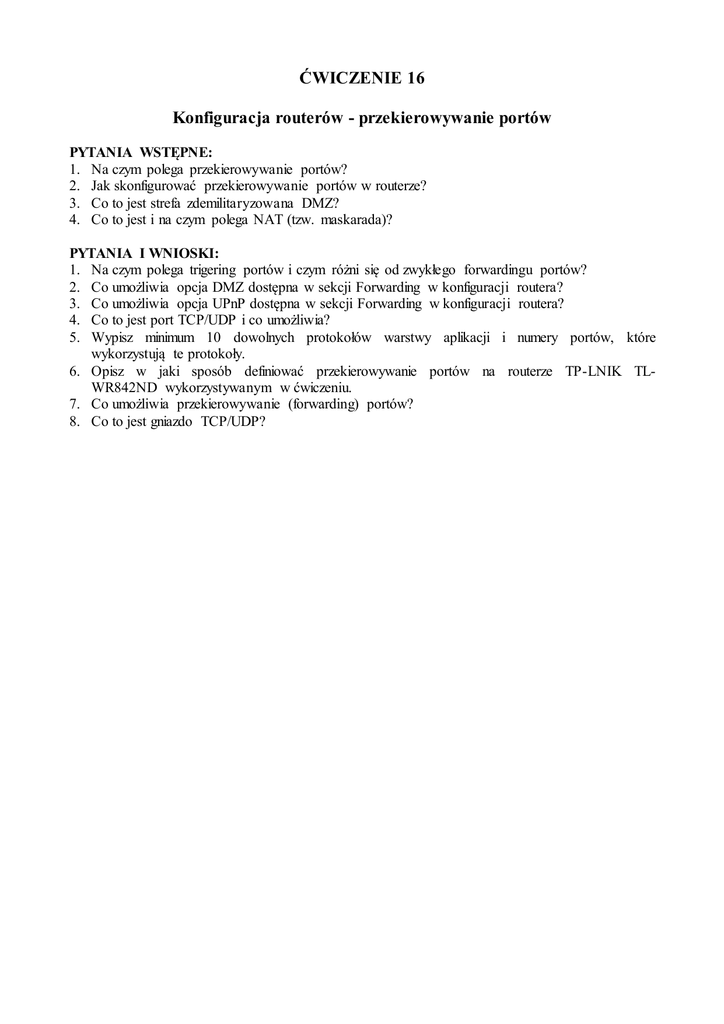ĆWICZENIE 16 Konfiguracja routerów - przekierowywanie portów PYTANIA WSTĘPNE: 1. Na czym polega przekierowywanie portów? 2. Jak skonfigurować przekierowywanie portów w routerze? 3. Co to jest strefa zdemilitaryzowana DMZ? 4. Co to jest i na czym polega NAT (tzw. maskarada)? PYTANIA I WNIOSKI: 1. Na czym polega trigering portów i czym różni się od zwykłego forwardingu portów? 2. Co umożliwia opcja DMZ dostępna w sekcji Forwarding w konfiguracji routera? 3. Co umożliwia opcja UPnP dostępna w sekcji Forwarding w konfiguracji routera? 4. Co to jest port TCP/UDP i co umożliwia? 5. Wypisz minimum 10 dowolnych protokołów warstwy aplikacji i numery portów, które wykorzystują te protokoły. 6. Opisz w jaki sposób definiować przekierowywanie portów na routerze TP-LNIK TLWR842ND wykorzystywanym w ćwiczeniu. 7. Co umożliwia przekierowywanie (forwarding) portów? 8. Co to jest gniazdo TCP/UDP?