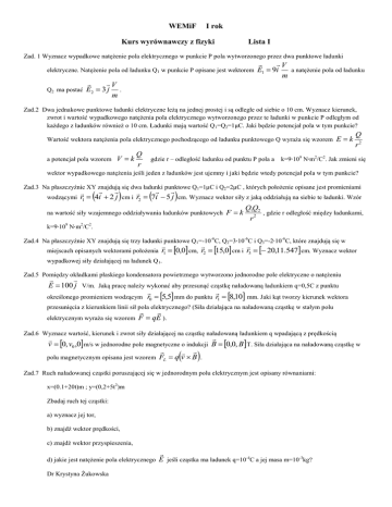 WEMiF I rok Kurs wyrównawczy z fizyki Lista I Zad. 1 Wyznacz wypadkowe natężenie pola elektrycznego w punkcie P pola wytworzonego przez dwa punktowe ładunki elektryczne. Natężenie pola od ładunku Q1 w punkcie P opisane jest wektorem Q2 ma postać V E2 3 j . m V a natężenie pola od ładunku E1 9i m Zad.2 Dwa jednakowe punktowe ładunki elektryczne leżą na jednej prostej i są odległe od siebie o 10 cm. Wyznacz kierunek, zwrot i wartość wypadkowego natężenia pola elektrycznego wytworzonego przez te ładunki w punkcie P odległym od każdego z ładunków również o 10 cm. Ładunki mają wartość Q 1=Q2=1μC. Jaki będzie potencjał pola w tym punkcie? Wartość wektora natężenia pola elektrycznego pochodzącego od ładunku punktowego Q wyraża się wzorem a potencjał pola wzorem V k Q r gdzie r – odległość ładunku od punktu P pola a Ek Q r2 k=9∙109 N∙m2/C2. Jak zmieni się wektor wypadkowego natężenia jeśli jeden z ładunków jest ujemny i jaki będzie wtedy potencjał pola w tym punkcie? Zad.3 Na płaszczyźnie XY znajdują się dwa ładunki punktowe Q1=1μC i Q2=2μC , których położenie opisane jest promieniami wodzącymi r1 4i 2 j cm i r2 7i 5 j cm. Wyznacz wektor siły z jaką oddziałują na siebie te ładunki. Wzór na wartość siły wzajemnego oddziaływania ładunków punktowych F k Q1Q2 , gdzie r odległość między ładunkami, r2 k=9∙109 N∙m2/C2. Zad.4 Na płaszczyźnie XY znajdują się trzy ładunki punktowe Q1=-10-6C, Q2=3∙10-6C i Q3=-2∙10-6C, które znajdują się w miejscach opisanych wektorami położenia r1 0,0 cm, r2 15,0 cm i r3 20,11.547 cm. Wyznacz wektor wypadkowej siły działającej na ładunek Q1. Zad.5 Pomiędzy okładkami płaskiego kondensatora powietrznego wytworzono jednorodne pole elektryczne o natężeniu E 100 j V/m. Jaką pracę należy wykonać aby przesunąć cząstkę naładowaną ładunkiem q=0,5C z punktu określonego promieniem wodzącym r0 5,5 mm do punktu r1 8,10 mm. Jaki kąt tworzy kierunek wektora przesunięcia z kierunkiem linii sił pola elektrycznego? (Siła działająca na naładowaną cząstkę w stałym polu elektrycznym wyraża się wzorem F qE ). Zad.6 Wyznacz wartość, kierunek i zwrot siły działającej na cząstkę naładowaną ładunkiem q wpadającą z prędkością v 0, v0 ,0m/s w jednorodne pole magnetyczne o indukcji B 0,0, B T. Siła działająca na naładowaną cząstkę w polu magnetycznym opisana jest wzorem FL q v B . Zad.7 Ruch naładowanej cząstki poruszającej się w jednorodnym polu elektrycznym jest opisany równaniami: x=(0.1+20t)m ; y=(0,2+5t2)m Zbadaj ruch tej cząstki: a) wyznacz jej tor, b) znajdź wektor prędkości, c) znajdź wektor przyspieszenia, d) jakie jest natężenie pola elektrycznego Dr Krystyna Żukowska E jeśli cząstka ma ładunek q=10-4C a jej masa m=10-3kg?