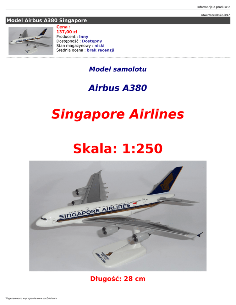 Informacje o produkcie Utworzono 08-03-2017 Model Airbus A380 Singapore Cena : 137,00 zł Producent : Inny Dostępność : Dostępny Stan magazynowy : niski Średnia ocena : brak recenzji Model samolotu Airbus A380 Singapore Airlines Skala: 1:250 Długość: 28 cm Wygenerowano w programie www.oscGold.com Rozpiętość skrzydeł: 32 cm Bardzo dobrej jakości tworzywo, kadłub z grubego plastiku, wysokiej jakości malowanie. Informacje o produkcie Produkt do szybkiego i bardzo łatwego złożenia bezklejowego, składa się z kilku elementów - kwestia WPIĘCIA skrzydeł i stateczników w kadłub. Elementy zabezpieczone w plastikowych blistrach, całość opakowana w pudełko. Przed wysyłką opakowanie z modelem dodatkowo zabezpieczamy przed uszkodzeniem. Wygenerowano w programie www.oscGold.com