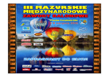 W dniach 5-8 sierpnia w Ełku odbędą się III Mazurskie Międzynarodowe Zawody Balonowe o Puchar Prezydenta Ełku. Na mazurskim niebie zobaczymy około 50 balonów, 5 sterowców, zarówno z Polski jak i z zagranicy. Dzięki współpracy z mediami przy kampanii promocyjnej zawodów oraz udziale ekip z Polski i Europy ranga imprezy będzie wysoka. . Nie zabraknie również balonów o unikalnych kształtach przybyłych z zagranicy. Największe zawody balonowe w Europie Wschodniej !! Dlaczego latamy na Mazurach? ¾ bezpieczny i atrakcyjny widokowo teren pięknych mazurskich jezior ¾ brak fabryk i zakładów przemysłowych ¾ dziesiątki tysięcy turystów odwiedzających Warmię i Mazury, w tym Ełk jako jeden z ważniejszych ośrodków turystycznych ¾ wspierające nas władze Ełku i województwa ¾ wiele atrakcji i imprez kulturalnych odbywających się w tym czasie (koncerty, wystawy, plenery, imprezy sportowe) ¾ atrakcyjny teren w centrum Ełku idealny do wspólnego startu balonów ¾ dobra baza hotelowa i gastronomiczna ¾ dobry dojazd dla mieszkańców innych miast Największe zawody balonowe w Europie Wschodniej !! Za kwotę 49 000 netto oraz miano STRATEGICZNEGO SPONSORA – PARTNERA proponujemy następujący pakiet usług: 1. Pobyt 20 Państwa klientów przez 4 dni trwania zawodów w eleganckim hotelu, do wyboru są: Kuźnia Smaku, Smętek, Hotel Rydzewski, Stary Spichlerz (lub inny). 2. W czasie lotów zawodniczych każdy Państwa gość przynajmniej raz poleci balonem oraz otrzyma „Certyfikat Iszego Lotu” z Waszym logo + torbę z upominkami (kosz swojskiego jadła, albumy). 3. Zaproszenia na wieczorne przyjęcia i imprezy zorganizowane dla VIP-ów, baloniarzy i sponsorów, w tym przyjęcie na 200 osób - wręczenie pucharów. Do dyspozycji basen, hala sportowa i korty tenisowe. 4. Jeden z balonów oraz ekipa go obsługująca jak i samochód terenowy wraz z przyczepą zostaną obrandowane logo i reklamą Państwa firmy. Gwarantujemy rezerwację dla jednej z ekip nazwy Waszej firmy. 5. Jedna z konkurencji Mazurskich Zawodów Balonowych zostaną rozegrane o Puchar Prezesa Państwa firmy. Puchary i nagrody sportowcom przypadną do rozdania Waszej Firmie (Prezesowi, Dyrektorowi). Największe zawody balonowe w Europie Wschodniej !! 6. Umieszczenie banerów, bloków reklamowych i innych nośników reklamy na koncercie „IRA”, który odbędzie się na plaży miejskiej w Ełku w dniu 07 sierpnia 2010. Przewidujemy 15 – 20 tys. publiczności. 7. Do dyspozycji Waszych gości podstawiona zostanie łódź motorowa oraz samochód terenowy na 8 osób na czas trwania zawodów. 8. Umieszczenie logo i reklamy w folderze z programem w nakł. 40.000 egz., logo na numerach startowych, koszulkach, czapeczkach, ulotkach, plakatach, nalepkach, banery w mieście oraz na hotelu goszczącym załogi balonowe. Możliwy jest konkurs dla publiczności. 9. Gwarantujemy Państwa logo 100% większe od innych znaków firmowych mniej strategicznych sponsorów. 10. Ustawienie stoiska promującego firmę na bulwarach w centrum Ełku. 11. Logo i podziękowanie w mediach patronackich, artykułach prasowych. 12. Po zakończeniu zawodów przekażemy Państwu serwis fotograficzny z prawami do publikacji w internecie oraz innych mediach, materiałach promocyjnych. Największe zawody balonowe w Europie Wschodniej !! Za kwotę 30 000 netto oraz miano ZŁOTEGO SPONSORA - proponujemy następujący pakiet usług: ¾ Pobyt 10 Państwa klientów przez 3 dni trwania zawodów w eleganckim hotelu. ¾ Punkt 2 i 3 proszę czytać z I pakietu. ¾ Jeden balon zostanie obrandowany reklamą Państwa firmy 120 m2 po promocyjnej cenie 50zł/m2 i wykona wszystkie loty w czasie zawodów z Państwa reklamą. ¾ Załoga przyjmie nazwę „… BALOON TEAM”, a samochód terenowy i przyczepa zostaną również obrandowane Waszą reklamą. ¾ Jedna konkurencja zostanie rozegrana o Puchar Prezesa Państwa Firmy. Puchary i nagrody również przypadną do rozdania Waszej Firmie (Prezesowi, Dyrektorowi). ¾ Punkt 6, 8, 10, 11 i 12 proszę czytać z I pakietu. Największe zawody balonowe w Europie Wschodniej !! Za kwotę 10 000 netto oraz miano BRĄZOWEGO SPONSORA proponujemy następujący pakiet usług: ¾ Pobyt 2 Państwa klientów przez 3 dni trwania zawodów w eleganckim hotelu (za pobyt każdej następnej osoby - 2000 zł netto). ¾ ¾ Punkt 2 i 3 proszę czytać z I pakietu. Jedna konkurencja zostanie rozegrana o Puchar Prezesa Państwa Firmy. Puchary i nagrody również przypadną do rozdania Waszej Firmie (Prezesowi, Dyrektorowi). ¾ Punkt 6, 8, 10, 11 i 12 proszę czytać z I pakietu. Największe zawody balonowe w Europie Wschodniej !! Za kwotę 5 000 netto oraz miano FIRMY WSPIERAJĄCEJ - proponujemy następujący pakiet usług: ¾ Pobyt 1 z Państwa klientów przez 3 dni trwania zawodów w eleganckim hotelu (za pobyt każdej następnej osoby - 2000 zł netto). ¾ ¾ Punkt 2 i 3 proszę czytać z I pakietu. Jedna konkurencja zostanie rozegrana o Puchar Prezesa Państwa Firmy. Puchary i nagrody również przypadną do rozdania Waszej Firmie (Prezesowi, Dyrektorowi). ¾ Punkt 6, 8, 10, 11 i 12 proszę czytać z I pakietu. Największe zawody balonowe w Europie Wschodniej !! Zobaczcie, jak fantastycznie było w ubiegłym roku. Naprawdę warto… http://www.polskawita.pl/inspiracje/elk-z-lotu-balonem.html http://lotniczapolska.pl/II-Mazurskie-Zawody-Balonowe,8209 http://www.radio.bialystok.pl/wiadomosci/galerie/id/20621 http://www.youtube.com/watch?v=vQBqThFGwpo&feature=related http://www.youtube.com/watch?v=4-3WM-tubcw http://www.youtube.com/watch?v=Fux8Wo1EHrQ http://mazury.travel/gallery,ii-mazurskie-miedzynarodowe-zawody-balonowe-welku,26,pl.html http://aktywni.pl/wydarzenia/pokaz/ii-mazurskie-zawody-balonowe/ http://www.youtube.com/watch?v=i8GNkvi7m_E&NR=1 http://www.youtube.com/watch?v=ZirHUBqTk5A http://www.radio5.com.pl/index.php?id=73&fotogaleria=19506 Największe zawody balonowe w Europie Wschodniej !! W razie dodatkowych p