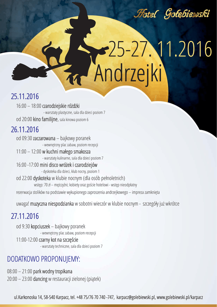 25-27. 11.2016 Andrzejki 25.11.2016 16:00 – 18:00 czarodziejskie różdżki - warsztaty plastyczne, sala dla dzieci poziom 7 od 20:00 kino familijne, sala kinowa poziom 6 26.11.2016 od 09:30 zaczarowana – bajkowy poranek - wewnętrzny plac zabaw, poziom recepcji 11:00 – 12:00 w kuchni małego smakosza - warsztaty kulinarne, sala dla dzieci poziom 7 16:00 -17:00 mini disco wróżek i czarodziejów - dyskoteka dla dzieci, klub nocny, poziom 1 od 22:00 dyskoteka w klubie nocnym (dla osób pełnoletnich) wstęp: 70 zł – mężczyźni; kobiety oraz goście hotelowi - wstęp nieodpłatny rezerwacja stolików na podstawie wykupionego zaproszenia andrzejkowego – impreza zamknięta uwaga! muzyczna niespodzianka w sobotni wieczór w klubie nocnym - szczegóły już wkrótce 27.11.2016 od 9:30 kopciuszek – bajkowy poranek - wewnętrzny plac zabaw, poziom recepcji 11:00-12:00 czarny kot na szczęście - warsztaty techniczne, sala dla dzieci poziom 7 DODATKOWO PROPONUJEMY: 08:00 – 21:00 park wodny tropikana 20:00 – 23:00 dancing w restauracji zielonej (piątek) ul.Karkonoska 14, 58-540 Karpacz, tel. +48 75/76 70 740 -747, [email protected], www.golebiewski.pl/karpacz