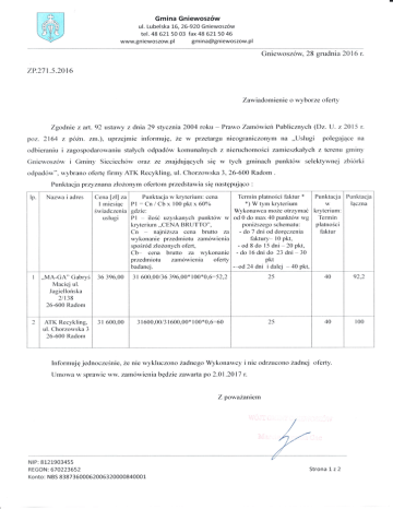 Gmina Gniewoszów ul. Lubelska 76,26-920 Gniewoszów tel. 48 621 50 03 fax 48 621 50 46 www.gniewoszow.pl [email protected] Gniewoszów, 28 grudnia2016 r. 2P.271.s.2016 Zawiadomienie o wyborze ofefty Zgodniezart.92 ustawy zdnia29 stycznia 2004 roku poz' Ż164 z odbieraniu i Gniewoszów - Prawo Zamówień Publicznyclr (Dz. U. późn. zn'), Lrprzejmie infonnuję, Że w przetargu nieogI'aniczonym na ,,Usługi polegające zagospodarowaniu stałych odpadów komunalnych i na z nieruclromościzalnieszkaŁyclr z terenu glniny ATK Recykling, ul. Clrorzowska 3,Ż6-600 Radom PLrnktacja przyznanazłoŻonyn ofeftom przedstawia się następująco Nazwa iadres . : Punktacja Punktacja Tennin płatnoŚci faktur * *) W tyn kryterium łączna Wykonawca noŻe otr zy nać kryteriurn: Pl - iloŚc uzyskanych punktów w od 0 do max 40 punktów wg Termin płatności poniższego schematu: kryteriurn,,C ENA B RUTTO", faktur Cn najniŻsza cena brutto za - do 7 dni od doręczenia faktury l0 pkt, wykonanie przedtniotu zamówienia - od 8 do l5 dni - 20 pkt, spośród złozonych ofert. Cb- cena brutto za wykonanie - do l6 dni do 23 dni - 30 pkt przedmiotu zarnówienia oferty Punktacja w kryterium: cena Cena [zł] za l rniesiąc Pl:Cn/Cbx l00pktx60% Świadczenia gdzie: usługi --od 24 badanej. I r. Gminy Sieciechów oraz ze znajdującyclr się w tyclr grninaclr punktów selektywne.i zbiórki odpadów'', wybrano ofeftę firmy lp. z20l5 ,,MA-GA'' Gabryś 36 396,00 3 dni i dalej - 40 pkt, | 600,00/36 396,00* t00*0,6:52,2 25 40 q)') 25 40 r00 Maciej ul. Jagiellońska zil38 26-600 Radorn 2 ATK Recykling, 3 r 600,00 3 I 600,00/3 I 600,00* I 00*0,6:60 ul. Chorzowska 3 26-600 Radorn Infonnuję jednocześnie, Że nie wykluczono Żadnego Wykorrawcy i nie odrzucono żadnej ofefty. Umowa w sprawie ww. zamówienia będzie zawarta po 2.0l .2011 r. Z powaŻalliem NIP: 8121903455 REGON: 670223652 Konto: NBS 83873600062006320000840001 Strona 1 z 2