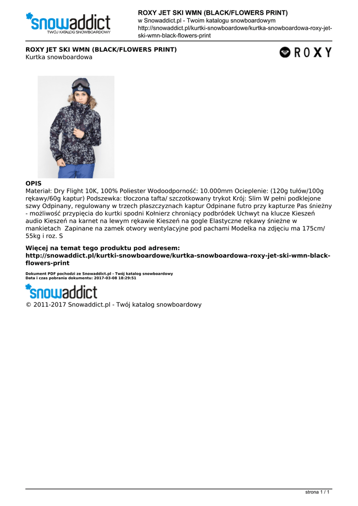 ROXY JET SKI WMN (BLACK/FLOWERS PRINT) w Snowaddict.pl - Twoim katalogu snowboardowym http://snowaddict.pl/kurtki-snowboardowe/kurtka-snowboardowa-roxy-jetski-wmn-black-flowers-print ROXY JET SKI WMN (BLACK/FLOWERS PRINT) Kurtka snowboardowa OPIS Materiał: Dry Flight 10K, 100% Poliester Wodoodporność: 10.000mm Ocieplenie: (120g tułów/100g rękawy/60g kaptur) Podszewka: tłoczona tafta/ szczotkowany trykot Krój: Slim W pełni podklejone szwy Odpinany, regulowany w trzech płaszczyznach kaptur Odpinane futro przy kapturze Pas śnieżny - możliwość przypięcia do kurtki spodni Kołnierz chroniący podbródek Uchwyt na klucze Kieszeń audio Kieszeń na karnet na lewym rękawie Kieszeń na gogle Elastyczne rękawy śnieżne w mankietach Zapinane na zamek otwory wentylacyjne pod pachami Modelka na zdjęciu ma 175cm/ 55kg i roz. S Więcej na temat tego produktu pod adresem: http://snowaddict.pl/kurtki-snowboardowe/kurtka-snowboardowa-roxy-jet-ski-wmn-blackflowers-print Dokument PDF pochodzi ze Snowaddict.pl - Twój katalog snowboardowy Data i czas pobrania dokumentu: 2017-03-08 18:29:51 © 2011-2017 Snowaddict.pl - Twój katalog snowboardowy strona 1 / 1 Powered by TCPDF (www.tcpdf.org)