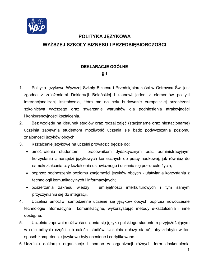 POLITYKA JĘZYKOWA WYŻSZEJ SZKOŁY BIZNESU I PRZEDSIĘBIORCZOŚCI DEKLARACJE OGÓLNE §1 1. Polityka językowa Wyższej Szkoły Biznesu i Przedsiębiorczości w Ostrowcu Św. jest zgodna z założeniami Deklaracji Bolońskiej i stanowi jeden z elementów polityki internacjonalizacji kształcenia, która ma na celu budowanie europejskiej przestrzeni szkolnictwa wyższego oraz stwarzanie warunków dla podniesienia atrakcyjności i konkurencyjności kształcenia. 2. Bez względu na kierunek studiów oraz rodzaj zajęć (stacjonarne oraz niestacjonarne) uczelnia zapewnia studentom możliwość uczenia się bądź podwyższania poziomu znajomości języków obcych. 3. Kształcenie językowe na uczelni prowadzić będzie do: umożliwienia studentom i pracownikom dydaktycznym oraz administracyjnym korzystania z narzędzi językowych koniecznych do pracy naukowej, jak również do samokształcenia czy kształcenia ustawicznego i uczenia się przez całe życie; poprzez podnoszenie poziomu znajomości języków obcych - ułatwiania korzystania z technologii komunikacyjnych i informacyjnych; poszerzania zakresu wiedzy i umiejętności interkulturowych i tym samym przyczynianiu się do integracji. 4. Uczelnia umożliwi samodzielne uczenie się języków obcych poprzez nowoczesne technologie informacyjne i komunikacyjne, wykorzystując metody e-kształcenia i inne dostępne. 5. Uczelnia zapewni możliwość uczenia się języka polskiego studentom przyjeżdżającym w celu odbycia części lub całości studiów. Uczelnia dołoży starań, aby zdobyte w ten sposób kompetencje językowe były ocenione i certyfikowane. 6. Uczelnia deklaruje organizację i pomoc w organizacji różnych form doskonalenia 1 językowego dla studentów, pracowników naukowych i dydaktycznych oraz innych w oparciu o istniejące zasoby kadrowo organizacyjne Studium Języków Obcych. 7. Uczelnia zapewnia możliwość bezpłatnego zdobycia certyfikatu międzynarodowego TOEIC Listening & Reading wszystkim studentom kończącym studia na Uczelni. 8. Studium Języków obcych wprowadza obowiązek nauczania języka zawodowego na każdym z kierunków w zakresie terminologii podstawowej właściwej dla danego kierunku. 9. Stosowanie języków obcych jest szczególnie ważne w aspekcie współpracy międzynarodowej Uczelni, w nawiązywaniu i podtrzymywaniu kontaktów, jak również podczas wymiany kadry naukowo – dydaktycznej. Działania w tym obszarze obejmować będą: - publikowanie anglojęzycznych materiałów informacyjnych o Uczelni, - utrzymywanie i aktualizowanie anglojęzycznej strony internetowej Uczelni, - wspieranie mobilności pracowników i studentów ze szczególnym wskazaniem osób z dobrą znajomością języków obcych, 10. Uczelnia oczekuje od zatrudnianych nauczycieli akademickich podstawowej znajomości terminologii specjalistycznej właściwej dla danej dziedziny nauki w języku angielskim lub/ i innym obcym. 11. Działania lektorów Studium Języków Obcych prowadzić będą do umożliwienia studentom poznania i stosowania podstawowej terminologii specjalistycznej właściwej dla studiowanego kierunku w języku angielskim. 12. Konsekwentnie oczekuje się, iż przyjeżdżający studenci poznają i będą w stanie używać podstawowej terminologii specjalistycznej właściwej dla studiowanego kierunku w języku polskim. 13. Studenci nie mają obowiązku zaliczania przedmiotów specjalistycznych w języku obcym. 14. Dziekan może zezwolić studentowi, na jego/jej wniosek, na przeprowadzenie egzaminu w języku obcym jeśli egzaminator będzie posiadał odpowiednie, poświadczone kompetencje językowe w danej dziedzinie. 2 POLITYKA UZNAWANIA OSIĄGNIĘĆ W ZAKRESIE KSZTAŁCENIA JĘZYKOWEGO §2 1. Przejrzystość zasad uznawania znajomości języka obcego i ewaluacji kompetencji językowych pracowników i studentów Uczelnia wdrażana jest na podstawie Europejskiego Systemu Opisu Kształcenia Językowego (Common European Framework of Reference). 2. Zapewnienie przejrzystości ewaluacji kompetencji językowych studentów zapewnione zostaje poprzez wprowadzenie egzaminu z języka angielskiego na każdym kierunku studiów. Egzamin przyjmuje formę egzaminu międzynarodowego TOEIC Listening & Reading. 3. Częściowe osiągnięcia w zakresie znajomości języków obcych zdobyte podczas - kursów językowych zrealizowanych przez pracowników i studentów podczas wyjazdów zagranicznych bądź praktyk zawodowych, - udziału w zajęciach z języka obcego podczas wyjazdów zagranicznych w celu odbycia części studiów bądź praktyk zagranicznych, będą uznawanie w następującym zakresie: - punkty ECTS będą dodawane do ogólnej liczby punktów nawet jeśli nauka języka odbyta w czasie wymiany zagranicznej nie będzie na takim samym poziomie jak przewiduje macierzysty program kształcenia, - sam udział w zajęciach może zostać uznany jako osiągnięcie i doprowadzi do przypisania punktów ECTS w ilości co najmniej odpowiadającej długości trwania zajęć zorganizowanych. POLITYKA JĘZYKOWA UCZELNI W PROGRAMACH MOBILNOŚCIOWYCH §3 1. Poziom znajomości języka stanowi element kluczowy dla mobilności akademickiej 3 i zawodowej, dlatego też znajomość języka docelowego właściwego dla danego wyjazdu zagranicznego stanowi istotne kryterium kwalifikacji i/lub rekrutacji do programów mobilnościowych. Warunek ten zapisany jest w Regulaminie Kwalifikacji Pracowników i Studentów do wyjazdów zagranicznych. 2. Działania mobilnościowe Uczelni prowadzone są z założeniem, iż warunkiem koniecznym udziału w Programie mobilnościowym jest znajomość języka kraju, do którego kadra bądź studenci wyjeżdżają. 3. Sposób weryfikacji kompetencji językowych i wpływ tego czynnika na kwalifikację lub rekrutację opisują Uczelniane Zasady Kwalifikacji i Rekrutacji na dany rok akademicki. 4. Uczelnia prowadzi działania wspierające dla kadry i studentów mobilnościowych takie jak: 1) dla beneficjentów przy