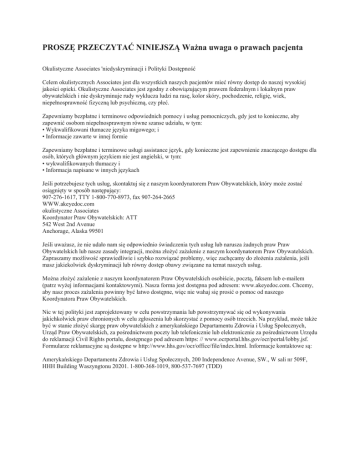PROSZĘ PRZECZYTAĆ NINIEJSZĄ Ważna uwaga o prawach pacjenta Okulistyczne Associates 'niedyskryminacji i Polityki Dostępność Celem okulistycznych Associates jest dla wszystkich naszych pacjentów mieć równy dostęp do naszej wysokiej jakości opieki. Okulistyczne Associates jest zgodny z obowiązującym prawem federalnym i lokalnym praw obywatelskich i nie dyskryminuje rudy wyklucza ludzi na rasę, kolor skóry, pochodzenie, religię, wiek, niepełnosprawność fizyczną lub psychiczną, czy płeć. Zapewniamy bezpłatne i terminowe odpowiednich pomocy i usług pomocniczych, gdy jest to konieczne, aby zapewnić osobom niepełnosprawnym równe szanse udziału, w tym: • Wykwalifikowani tłumacze języka migowego; i • Informacje zawarte w innej formie Zapewniamy bezpłatne i terminowe usługi assistance język, gdy konieczne jest zapewnienie znaczącego dostępu dla osób, których głównym językiem nie jest angielski, w tym: • wykwalifikowanych tłumaczy i • Informacja napisane w innych językach Jeśli potrzebujesz tych usług, skontaktuj się z naszym koordynatorem Praw Obywatelskich, który może zostać osiągnięty w sposób następujący: 907-276-1617, TTY 1-800-770-8973, fax 907-264-2665 WWW.akeyedoc.com okulistyczne Associates Koordynator Praw Obywatelskich: ATT 542 West 2nd Avenue Anchorage, Alaska 99501 Jeśli uważasz, że nie udało nam się odpowiednio świadczenia tych usług lub narusza żadnych praw Praw Obywatelskich lub nasze zasady integracji, można złożyć zażalenie z naszym koordynatorem Praw Obywatelskich. Zapraszamy możliwość sprawiedliwie i szybko rozwiązać problemy, więc zachęcamy do złożenia zażalenia, jeśli masz jakiekolwiek dyskryminacji lub równy dostęp obawy związane na temat naszych usług. Można złożyć zażalenie z naszym koordynatorem Praw Obywatelskich osobiście, pocztą, faksem lub e-mailem (patrz wyżej informacjami kontaktowymi). Nasza forma jest dostępna pod adresem: www.akeyedoc.com. Chcemy, aby nasz proces zażalenia powinny być łatwo dostępne, więc nie wahaj się prosić o pomoc od naszego Koordynatora Praw Obywatelskich. Nic w tej polityki jest zaprojektowany w celu powstrzymania lub powstrzymywać się od wykonywania jakichkolwiek praw chronionych w celu zgłoszenia lub skorzystać z pomocy osób trzecich. Na przykład, może także być w stanie złożyć skargę praw obywatelskich z amerykańskiego Departamentu Zdrowia i Usług Społecznych, Urząd Praw Obywatelskich, za pośrednictwem poczty lub telefonicznie lub elektronicznie za pośrednictwem Urzędu do reklamacji Civil Rights portalu, dostępnego pod adresem https: // www.ocrportal.hhs.gov/ocr/portal/lobby.jsf. Formularze reklamacyjne są dostępne w http://www.hhs.gov/ocr/office/file/index.html. Informacje kontaktowe są: Amerykańskiego Departamentu Zdrowia i Usług Społecznych, 200 Independence Avenue, SW., W sali nr 509F, HHH Building Waszyngtonu 20201. 1-800-368-1019, 800-537-7697 (TDD) ZAPOZNAJ tej ważnej polityki informacji na temat procedury zażalenia niedyskryminacji i równego dostępu Okulistyczne Associates wierzy w integracji i różnorodności. Okulistyczne Associates zakazuje bezprawnej dyskryminacji na podstawie rasy, koloru skóry, pochodzenia, religii, wieku, niepełnosprawności fizycznej lub psychicznej, lub płeć. Jeśli uważasz, że wystąpiła dyskryminacja czy istnieje bariera do równego dostępu do naszych usług, prosimy o skorzystanie z procedury składania skarg w sposób opisany poniżej. Gorąco zachęcamy do skorzystania z tej procedury składania skarg, dzięki czemu możemy szybko i sprawiedliwie rozwiązywać wszelkie naruszenia zgodnie z przepisami prawa i naszych wartości integracji i różnorodności. Proces składania skarg • Skargi należy składać do naszego Koordynatora Praw Obywatelskich w ciągu dziewięćdziesięciu (90) dni od daty złożenia zażalenia osoba staje się świadoma domniemanej działań dyskryminacyjnych. • Oto dane kontaktowe dla naszego koordynatora: O 542 W 2nd Avenue Anchorage, AK 99501 O 907‐276‐1617 O TTY: 1‐800‐770‐8973 O Faks: 907‐264‐2665 O [email protected] • Reklamacja powinna być w formie pisemnej, zawierające nazwę i adres osoby składającej go. Jeśli potrzebujesz pomocy w formie pisemnej lub potrzebujemy alternatywnego formatu, niech nasz koordynator znać. • Skarga musi określać problem lub działanie, uważanych za dyskryminujące i rozdzielczość poszukiwane. Proszę podać jak najwięcej informacji i dowodów potwierdzających, jak to możliwe. Świadkowie są również zachęcani do dostarczyć jak najwięcej informacji, jak to możliwe. Niech koordynator znać, jeśli potrzebujesz pomocy terminowe dostarczanie informacji. • Po otrzymaniu skargi, koordynator (lub jego / jej wyznaczona) normalnie prowadzi dochodzenie. • Po zebraniu i przejrzeniu informacji, koordynator wydaje pisemną decyzję, na podstawie przewaga dowodów, nie później niż trzydzieści (30) dni od daty jego złożenia, w tym powiadomienia osoby składającej zażalenie ich prawa do prowadzenia dalszych lub administracyjne środki prawne. W uzasadnionych przypadkach w tych okolicznościach, takich jak potrzeba więcej czasu na zbadanie, gdzie informacja nie jest dostępna, może nastąpić przedłużenie tego terminu decyzji. Takie rozszerzenia powinno być wyjątkiem, a nie regułą, a nie powinny kolidować z wymogiem, że roszczenia są niezwłocznie rozwiązane. Jeśli szybka i sprawiedliwe rozdzielczości jest wzmocniona poprzez dialog, w tym mediacji i ułatwiać spotkania, te opcje mogą być oferowane przed, jako część, albo po pisemnej decyzji. • osoby składającej zażalenie może odwołać się od decyzji koordynatora pisząc do prezydenta okulistycznych Associates w ciągu trzydziestu (30) dni od daty otrzymania decyzji koordynatora. Przewodniczący okulistycznych Associates (lub wyznaczona) wyda pisemną decyzję w odpowiedzi na odwołanie