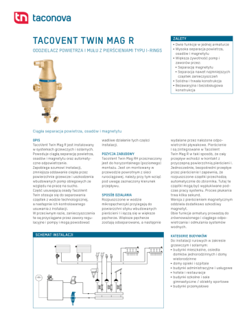 TACOVENT TWIN MAG R ZALETY ■■ ODDZIELACZ POWIETRZA I MUŁU Z PIERŚCIENIAMI TYPU I-RINGS ■■ ■■ Dwie funkcje w jednej armaturze Wysoka separacja powietrza, osadów i magnetytu Większa żywotność pomp i zaworów przez: Separację magnetytu Separacja nawet najmniejszych cząstek zanieczyszczeń Solidna i trwała konstrukcja Bezawaryjna i bezobsługowa konstrukcja ■■ ■■ ■■ ■■ Ciągła separacja powietrza, osadów i magnetytu OPIS TacoVent Twin Mag R jest instalowany w systemach grzewczych i solarnych. Powoduje ciągłą separację powietrza, osadów i magnetytu oraz automatyczne odpowietrzanie. Zapobiega szumowi instalacji, zmniejsza oddawanie ciepła przez powierzchnie grzewcze i uszkodzenia wbudowanych pomp obiegowych ze względu na pracę na sucho. Część usuwającą osady TacoVent Twin stosuje się do separowania cząstek z wodzie technologicznej, a następnie ich kontrolowanego usuwania z instalacji. W przeciwnym razie, zanieczyszczenia te są przyciągane przez zawory regulacyjne i pompy i mogą powodować SCHEMAT INSTALACJI wadliwe działanie tych części instalacji. POZYCJA ZABUDOWY TacoVent Twin Mag RH przeznaczony jest do horyzontalnego (poziomego) montażu. Jest on montowany w przewodzie powrotnym z sieci rurociągowej. należy przy tym wziąć pod uwagę zaznaczony kierunek przepływu. SPOSÓB DZIAŁANIA Rozpuszczone w wodzie mikropęcherzyki przylegają do powierzchni styku wbudowanych pierścieni I i łączą się w większe pęcherze. Większe pęcherze zostają odseparowane, a następnie wydalane przez nałożone odpowietrzniki pływakowe. Pierścienie I są zintegrowane w TacoVent Twin Mag R w taki sposób, że cały przepływ wchodzi w kontakt z przyczepną powierzchnią pierścieni I. Jednocześnie, bezpośredni przepływ przez pierścienie I zapewnia, że rozpuszczone cząstki przechodzą automatycznie do zbiornika. Tutaj te cząstki mogą być wypłukiwane podczas pracy systemu. Proces płukania trwa kilka sekund. Wersja z pierścieniem magnetycznym oddziela dodatkowo szkodliwy magnetyt. Obie funkcje armatury prowadzą do zrównoważonego i ciągłego odpowietrzania i odmulania systemów wodnych. KATEGORIE BUDYNKÓW Do instalacji rurowych w zakresie grzewczym i solarnym: budynki mieszkalne, osiedla domków jednorodzinnych i domy wielorodzinne domy opieki i szpitale budynki administracyjne i usługowe hotele i restauracje budynki szkolne i sale gimnastyczne / obiekty sportowe budynki przemysłowe ■■ ■■ ■■ ■■ ■■ ■■ TACOVENT TWIN MAG R | ODDZIELACZ POWIETRZA I MUŁU TEKST PRZETARGU patrz www.taconova.com DANE TECHNICZNE Dane ogólne temperatura robocza TB max: 120 ˚C ciśnienie robocze PB max: 10 bar Dostępny z pierścieniem magnetycznym lub bez Materiał mosiądz + tworzywo sztuczne Dopuszczalne media woda grzewcza (VDI 2035; SWKI BT 102-01; ÖNORM H 5195–1) woda zimna ■■ ZESTAWIIENIE TYPÓW TacoVent Twin Mag RH | separator powietrza, osadów i magnetytu, poziomy, połączenie złączkami Nr kat. 244.4111.000 DN 20 ØD 22 mm kV (m3/h) 11.2 Ciężar 2.5 kg Pojemność wody 0.44 l ■■ ■■ ■■ TacoVent Twin RH | separator powietrza i osadów, poziomy, połączenie złączkami Nr kat. 244.6111.000 DN 20 ØD 22 mm kV (m3/h) 11.2 Ciężar 2.5 kg Pojemność wody 0.44 l ■■ ■■ ZASADA DZIAŁANIA RYSUNEK WYMIAROWY 121 121 Ø Ø 283 283 1 115115 ø 71 ø 71 1 Optional: Magnet MAGNET Nr katalogowy 298.4004.000 Pasujące do TacoVent Pure i TacoVent Twin KONTAKT I DALSZE INFORMACJE Taconova GmbH | Biuro Polska | Rudolf-Diesel-Straße 8 | DE-78224 Singen T +48 570566200 | F +49 7731 98 28 88 | [email protected] | taconova.com TACONOVA.COM Zastrzega się możliwość zmian. 10/2016 CZĘŚĆ ZAMIENNA