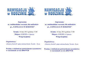 Zapraszamy na multimedialne warsztaty dla małżonków pt. „NAWIGACJA W RODZINIE” Termin: 16 luty 2013 godzina 17.00 Zapraszamy na multimedialne warsztaty dla małżonków pt. „NAWIGACJA W RODZINIE” Termin: 16 luty 2013 godzina 17.00 Miejsce: GOKSIR w Lipuszu Miejsce: GOKSIR w Lipuszu Wstęp bezpłatny Wstęp bezpłatny Organizatorzy: Organizatorzy: „Domowy Kościół” gałąź rodzinna Ruchu Światło – Życie „Domowy Kościół” gałąź rodzinna Ruchu Światło –Życie Prosimy o telefoniczne potwierdzenie uczestnictwa w warsztatach: nr tel. 609679728 Prosimy o telefoniczne potwierdzenie uczestnictwa w warsztatach: nr tel. 609679728 Życiu małżeńskiemu i rodzinnemu nieustannie trzeba nadawać kierunek, trzymać stery, korygować kurs, a nade wszystko znać cel podróży i wiedzieć, która droga jest do niego najwłaściwsza. Życiu małżeńskiemu i rodzinnemu nieustannie trzeba nadawać kierunek, trzymać stery, korygować kurs, a nade wszystko znać cel podróży i wiedzieć, która droga jest do niego najwłaściwsza. Te warsztaty to nasza propozycja dla małżonków. Osią warsztatów jest film, zrealizowany z udziałem znanych autorytetów z różnych dziedzin życia rodzinnego. Te warsztaty to nasza propozycja dla małżonków. Osią warsztatów jest film, zrealizowany z udziałem znanych autorytetów z różnych dziedzin życia rodzinnego. Uczestnicy warsztatów pracują na podstawie wyświetlanych konferencji oraz posługują się opracowanym przez psychologów indywidualnym arkuszem ćwiczeń. Jest to świetna możliwość przyjrzenia się sobie i swojej rodzinie. Mamy okazję wrócić do domu ze świadomością dziedziny, która szczególnie wymaga uwagi, naprawy, uzdrowienia. Uczestnicy warsztatów pracują na podstawie wyświetlanych konferencji oraz posługują się opracowanym przez psychologów indywidualnym arkuszem ćwiczeń. Jest to świetna możliwość przyjrzenia się sobie i swojej rodzinie. Mamy okazję wrócić do domu ze świadomością dziedziny, która szczególnie wymaga uwagi, naprawy, uzdrowienia. Prelegenci występujący w filmie to: Prelegenci występujący w filmie to: Jacek Pulikowski - doradca rodzinny, autor wielu książek Jacek Pulikowski - doradca rodzinny, autor wielu książek Szymon Grzelak - psycholog, autor książki pt. "Dziki ojciec" Szymon Grzelak - psycholog, autor książki pt. "Dziki ojciec" Robert Tekieli - znawca tematyki New Age Robert Tekieli - znawca tematyki New Age Jacek Racięcki - psychoterapeuta uzależnień Jacek Racięcki - psychoterapeuta uzależnień Anna Kołodziejczyk - psycholog ze Stowarzyszenia Psychologów Chrześcijańskich Anna Kołodziejczyk - psycholog ze Stowarzyszenia Psychologów Chrześcijańskich Radosław Pazura - aktor Radosław Pazura - aktor Krzysztof Hołowczyc – kierowca rajdowy Krzysztof Hołowczyc – kierowca rajdowy