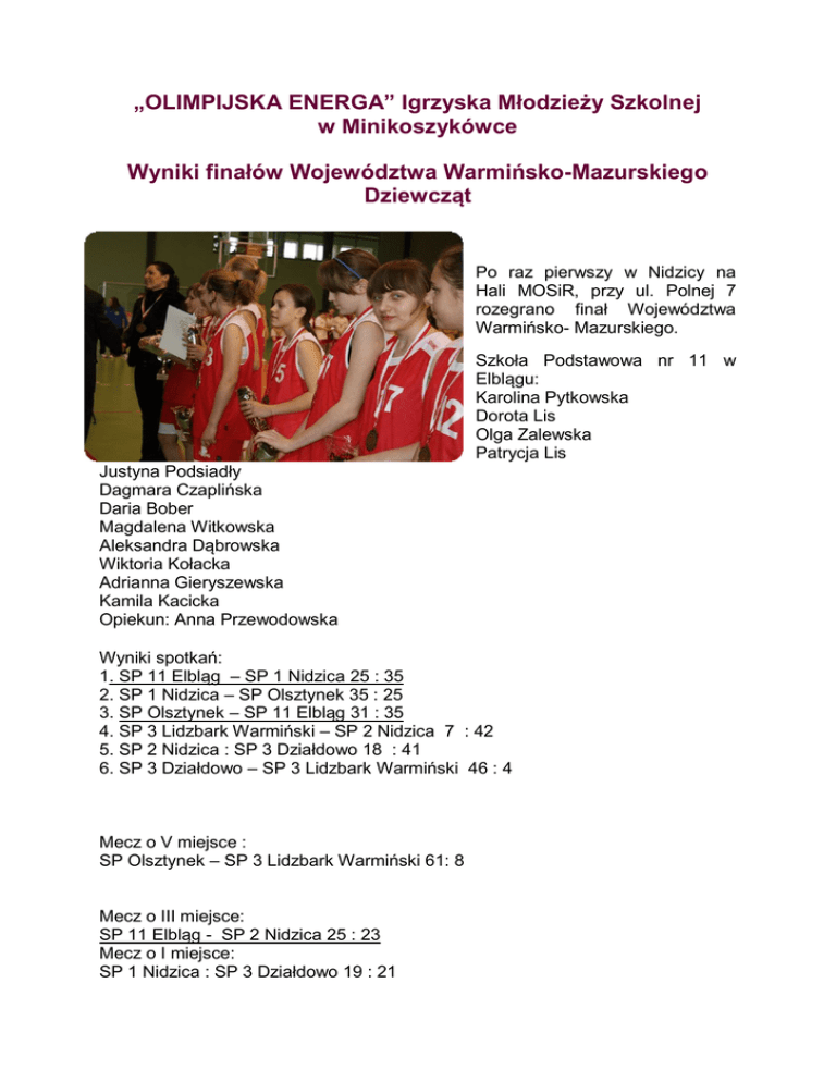 „OLIMPIJSKA ENERGA” Igrzyska Młodzieży Szkolnej w Minikoszykówce Wyniki finałów Województwa Warmińsko-Mazurskiego Dziewcząt Po raz pierwszy w Nidzicy na Hali MOSiR, przy ul. Polnej 7 rozegrano finał Województwa Warmińsko- Mazurskiego. Szkoła Podstawowa nr 11 w Elblągu: Karolina Pytkowska Dorota Lis Olga Zalewska Patrycja Lis Justyna Podsiadły Dagmara Czaplińska Daria Bober Magdalena Witkowska Aleksandra Dąbrowska Wiktoria Kołacka Adrianna Gieryszewska Kamila Kacicka Opiekun: Anna Przewodowska Wyniki spotkań: 1. SP 11 Elbląg – SP 1 Nidzica 25 : 35 2. SP 1 Nidzica – SP Olsztynek 35 : 25 3. SP Olsztynek – SP 11 Elbląg 31 : 35 4. SP 3 Lidzbark Warmiński – SP 2 Nidzica 7 : 42 5. SP 2 Nidzica : SP 3 Działdowo 18 : 41 6. SP 3 Działdowo – SP 3 Lidzbark Warmiński 46 : 4 Mecz o V miejsce : SP Olsztynek – SP 3 Lidzbark Warmiński 61: 8 Mecz o III miejsce: SP 11 Elbląg - SP 2 Nidzica 25 : 23 Mecz o I miejsce: SP 1 Nidzica : SP 3 Działdowo 19 : 21 Klasyfikacja końcowa: 1. SP 3 Działdowo - awans do finału krajowego 2. SP 1 Nidzica 3. SP 11 Elbląg 4. SP 2 Nidzica 5. SP Olsztynek 6. SP 3 Lidzbark Warmiński „OLIMPIJSKA ENERGA” Igrzyska Młodzieży Szkolnej w Minikoszykówce Wyniki finałów Województwa Warmińsko-Mazurskiego Chłopców W Ełku MOSiR, Maksymiliana Kolbego 11), ubiegłym rozegrano chłopców. Szkoła Podstawowa nr 11 w Elblągu: Damian Treder Adam Szwarc Krzysztof Brzeziński Dominik Janicki Kacper Ciepłucha Mateusz Czechowski Adrian Skarbek Adrian Pietras Artur Szramowski Grzegorz Konarski Adrian Gałecki Radosław Kowalski Opiekun: Arkadiusz Majewski Wyniki spotkań: 1. SP 3 Nidzica- SP 3 Działdowo 16 : 63 2. SP 3 Nidzica – SP Jegławki - walkower dla SP Nidzica 3. SP 3 Działdowo – SP Jegławki - walkower dla SP Działdowo 4. SP 5 Ełk – SP 3 Lidzbark Warmiński 87 : 13 5. SP 5 Ełk - SP 11 Elbląg 43 : 25 6. SP 3 Lidzbark Warmiński - SP 11 Elbląg 18 : 43 Mecz o V miejsce : nie rozegrany – SP Jegławki nie dotarła na zawody finałowe (Hala ul. Marii jak w roku finały Mecz o III miejsce: SP 11 Elbląg - SP 2 Nidzica 29 : 11 Mecz o I miejsce: SP 5 Ełk : SP 3 Działdowo 44 : 24 Klasyfikacja końcowa: 1. SP 5 Ełk - awans do finału krajowego 2. SP 3 Działdowo 3. SP 11 Elbląg 4. SP 3 Nidzica 5. SP 3 Lidzbark Warmiński 6. SP Jegławki